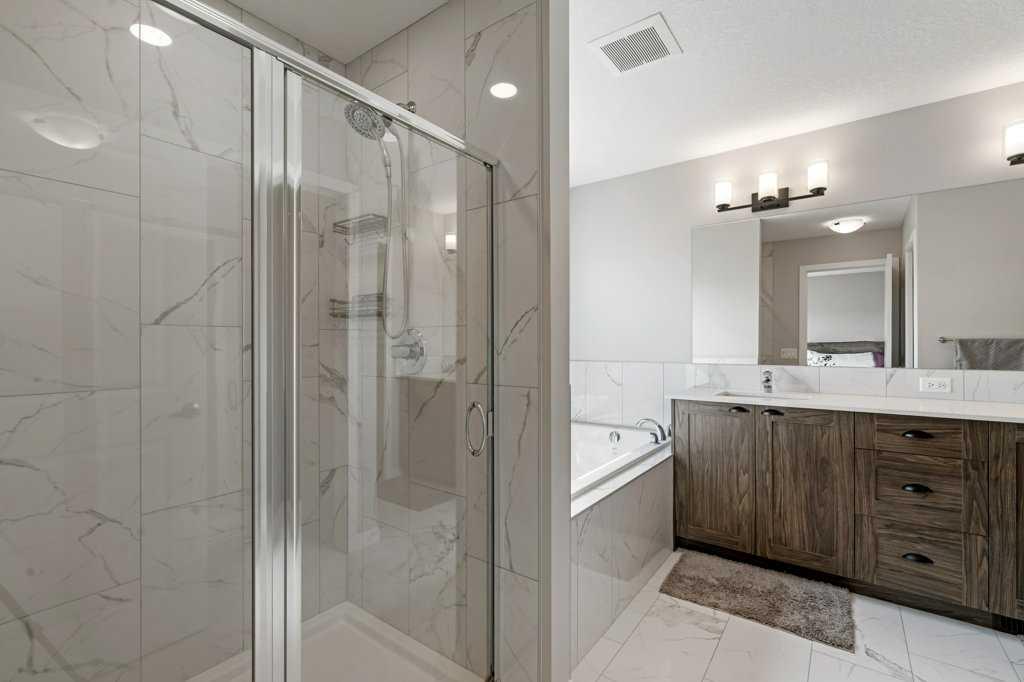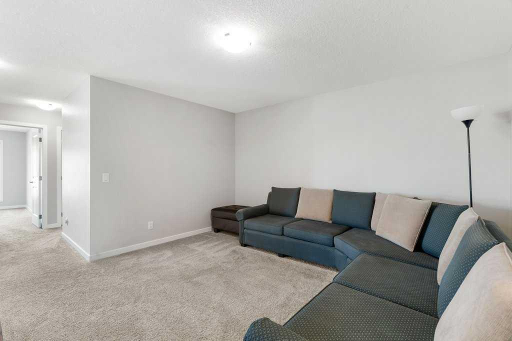 Welcome to this spacious and beautifully appointed 5-bedroom, 3.5-bathroom family home in the desirable NW community of Carrington. With 2,279 sq ft above grade and an additional 918 sq ft in the fully finished basement, this home offers over 3,100 sq ft of thoughtfully designed living space—ideal for large families, multigenerational living, or anyone craving extra room to grow. The main floor welcomes you with a bright, open-concept layout featuring 9’ ceilings and a warm, inviting living room with a gas fireplace. The adjacent dining area opens onto the sunny south-facing backyard via patio doors, extending your living space onto the deck—perfect for outdoor entertaining. The chef-inspired kitchen is a true showstopper, complete with an extra-long granite island, two-tone cabinetry, stainless steel appliances, and a separate spice kitchen with a second gas stove, powerful hood fan, and extra storage—ideal for preparing meals without lingering aromas in your main living space. A private office/den, 2-piece powder room, and a mudroom additional storage complete the main floor. Upstairs, you'll find a thoughtfully designed layout with a central bonus room, perfect for family movie nights or a kids’ play area. The primary suite is a serene retreat with a walk-in closet and a luxurious 5-piece ensuite featuring dual vanities, a deep soaker tub, and a separate shower. Three additional bedrooms share a 4-piece bathroom, and the convenient upper-floor laundry makes daily chores a breeze. The fully finished basement offers incredible flexibility with a large recreation room, 5th bedroom, another 4-piece bathroom, and plenty of storage. The 9’ ceilings and plumbing rough-ins provide the potential for a future basement suite (subject to approval and permitting by the city/municipality) or second kitchen. Enjoy the sunny, south-facing backyard that backs onto green space and a walking path, providing privacy and a peaceful backdrop. The low-maintenance landscaping, iron front and back railings, upgraded spindles, and central A/C add function and style to this impressive home. Ideally located in Carrington, you're just minutes from NW Calgary’s best amenities, including shopping and dining, the Vivo and YMCA recreation centres, schools, playgrounds, theatres, and easy access to major routes like Stoney Trail. This is the total package—space, comfort, and convenience, all in a family-friendly community.