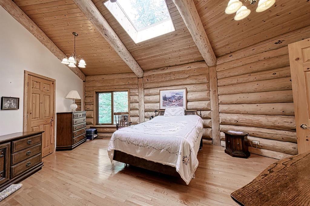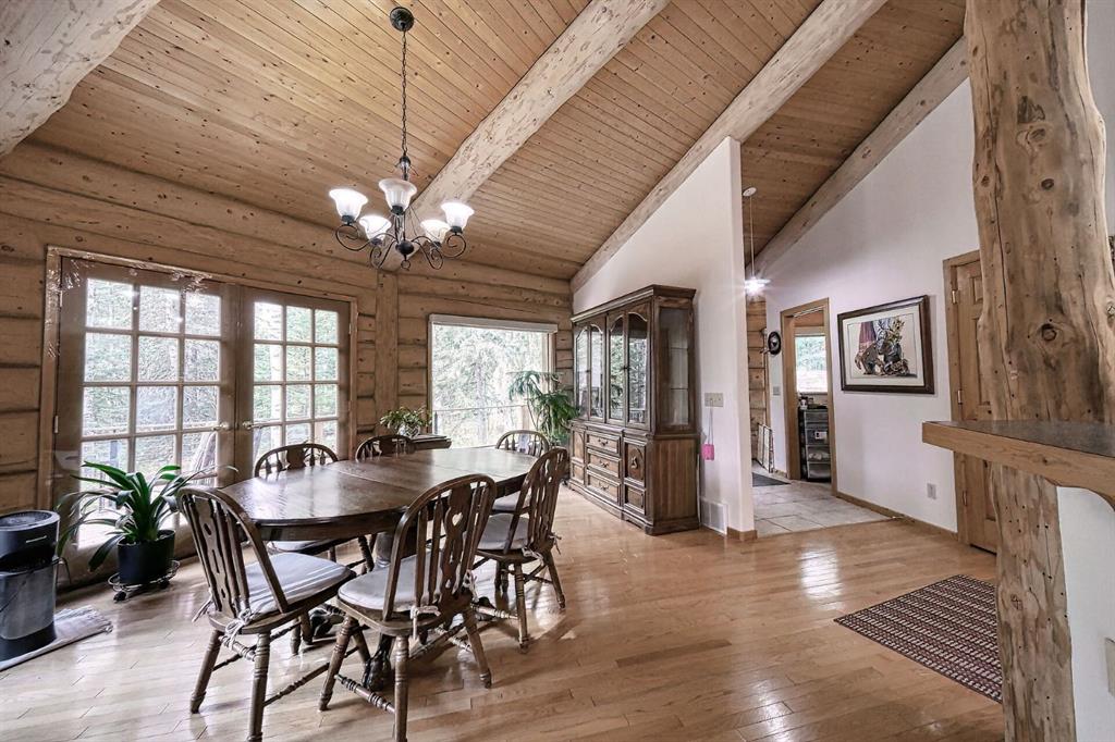 Nestled on 20 secluded treed acres near Dartique Hall, this unique circular log home offers privacy, character, and thoughtful design. The walkout bungalow features a true Heart of the Home central kitchen with an old-fashioned style gas stove, electric oven, dishwasher, fridge, and pantry overlooking bright open living and dining areas with large windows to flood the home with light. French doors in the dining area lead out to the new semi-wraparound premium composite deck perfect for entertaining or to charge your batteries and soak up the serenity. The main floor with soaring ceiling includes a tranquil primary bedroom suite with skylights, & 3pc ensuite, & walk-in closet, a second spacious bedroom, 3pc bath, laundry room w/ in-floor heat and mud room. Downstairs offers two additional bedrooms, a huge family and games area, and two storage rooms. A separate 1,056 SF Heated Workshop adds exceptional versatility for a home based business, a guest house, rental unit or space for your hobbies. Currently used as a workshop, it is comprised of a large main floor area, laundry room, 4-piece bath, mudroom, with a loft and walk-in closet upstairs plus a single unheated garage space. Additional outbuildings include shed, greenhouse and an additional single car garage. This One of a Kind home full of potential for your own personal design ideas is all surrounded by peaceful forest for a truly private retreat yet close to the Town of Cochrane and Calgary.