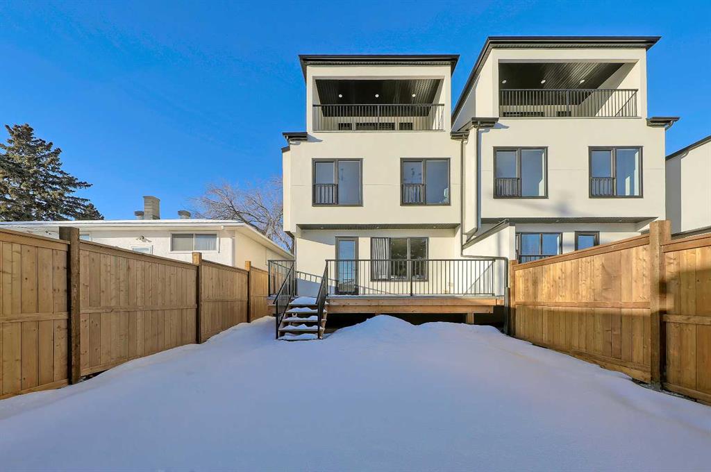 Tile detailing, modern finishes, designer lighting package, upgraded German-made KULU windows & doors…it’s everything you’re looking for in a luxury 3-STOREY SEMI-DETACHED INFILL! Now MOVE-IN READY, this designer home is located just off 26th Ave in the heart of Killarney – the ideal location for your new family home! The main floor opens into a welcoming foyer w/ built-in closet & bench, offering views into the spacious living room w/ a gas fireplace w/ full-height tile, as well as a stunning wood-panelled feature wall. Beautiful oak hardwood flooring leads you into the open-concept kitchen – fully equipped w/ an oversized island w/ quartz countertop, timeless shaker-style cabinetry w/ numerous lower drawers, & a contemporary flat-panel built-in cabinetry pantry. The designer kitchen is nicely finished w/ a full stainless steel appliance package, complete w/ a panelled French door refrigerator, a Dacor double wall oven, a gas cooktop w/ pot filler, & a built-in dishwasher. The custom built-ins continue into the dedicated dining room, w/ open shelving & lower cabinets w/ quartz counter for everyday convenience. Step out onto the back deck through the rear mudroom, complete w/ a built-in bench, coat cabinet, & tile flooring. Before you head upstairs, the stylish powder room is tucked away w/ a beautiful skirted vanity & vessel sink. Up the bright stairwell w/ glass wall awaits the primary suite – as sleek & modern as the rest of the home, w/ oversized windows, a private balcony w/ KULU door, & an extra-large walk-in closet! The chic ensuite features a dual vanity w/ a quartz countertop & a bank of lower drawers, a freestanding soaker tub, & a stand-up shower w/ full glass walls, rain showerhead, & bench. Two secondary bedrooms share the main 4-pc bath & the laundry room features a sink, upper cabinetry, hanging rod, tile backsplash, & a folding counter. A luxury home isn’t complete without a THIRD FLOOR LOFT, & this space has not been overlooked. More oversized windows bring in lots of natural light, shining across a spacious rec area w/ gas fireplace, full wet bar w/ extended quartz countertop, bar sink, & statement open shelving. A lovely sitting area w/ built-in desk overlooks the COVERED BALCONY & of course, there’s a full bath w/ fully tiled shower, too. The living space continues into the basement, w/ a full wet bar w/ quartz island, dual basin sink, & a designer tile floor, w/ a large family room, built-in media centre, a glass walled home gym w/ sports flooring, a 4th bedroom, & a full 4-pc bath. Killarney offers the perfect balance of community & convenience. From here, you’re within walking distance to Glendale School, Killarney School, & Bishop Carroll High. Westbrook Mall & the CTrain are only 5 minutes away, making downtown access effortless. The Killarney Aquatic & Recreation Centre, Optimist Athletic Park, & Shaganappi Golf Course are all nearby. Call to view today!