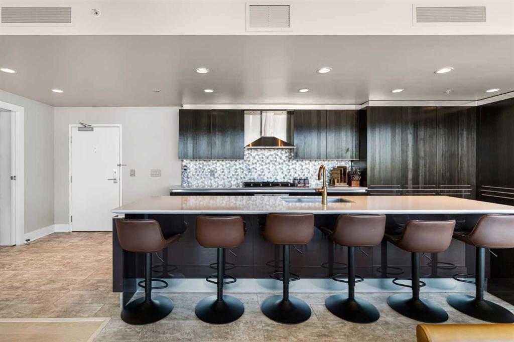 Your day begins with the soft glow of the morning sun spilling through floor-to-ceiling windows, offering panoramic views of downtown Calgary from every room. After a workout in your private home gym, you enjoy breakfast at the leathered granite counter perfectly positioned by the window to take in the city skyline. This 2,600+ sq ft sanctuary is a masterclass in executive hosting; as evening nears, the gentle trickle of the custom stone waterfall sets the mood while you select a vintage from your full-size, dual-zone wine fridge. Whether you are preparing drinks at the sophisticated leathered granite dry bar or a gourmet meal using the suite's high-end appliances, the space flows effortlessly for any occasion. The layout offers unmatched privacy with two spacious primary bedrooms, each featuring its own ensuite—including a lavish 5-piece spa retreat in the main suite. When you’re ready to head out, your private elevator opens directly into your suite, whisking you down to the vibrant pulse of the Beltline. You are perfectly positioned in the new Entertainment District, just steps from the new Calgary Flames arena, Stampede grounds, and river pathways. Living at the Arriva means effortless luxury, supported by 24-hour security and concierge services, a rooftop garden, owner’s lounge, guest suites, and central A/C—all complemented by modern updates including a new washer and ventless dryer.