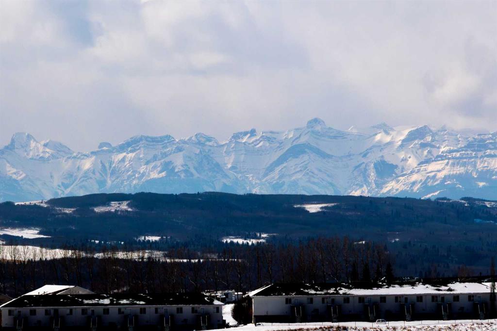 HOME SWEET HOME! Calling all first-time home buyers and investor's, welcome to this stunning, FRESHLY UPDATED TOP FLOOR CONDO with 2 PARKING STALLS in the sought-after community of Sunset Ridge in Cochrane! This chic unit offers 2 bedrooms, 1 bathroom, 858 exquisite SQFT that has been freshly updated with FRESH PAINT, NEW CARPET and LUXURY VINYL PLANK FLOORING (2026). Walking in to the unit you are greeted by the contemporary kitchen complete with stainless steel appliances, granite countertops, granite island with an eating bar, tiled backsplash, warm maple cabinetry and stylish light fixtures. Next to the kitchen you will find the bright formal dining room, spacious sun-drenched living room with access to the massive deck to enjoy your breathtaking views of the mountains. Completing the unit are an office nook, a two great-sized bedrooms including the magnificent primary bedroom with a spacious walk-in closet, lavish 4 piece bathroom with a relaxing soaker tub perfect to enjoy after a long day, separate, private shower and in-suite laundy. This unit includes a titled indoor parking stall, outdoor parking stall, assigned storage locker and exclusive access to the amenities featured in the popular, pet friendly 'Alora at Sunset Ridge' building include a fitness facility, guest suites, visitor parking and more. Close to all major amenities including shopping, restaurants, beautiful dog walking trails, schools (St. Timothy Catholic School and Rancheview School), quick drive to Calgary and easy access to escape to the mountains. This unit is a MUST VIEW, book your private viewing today! Please note that the pet rules allow for one pet under 18 pounds. Guest suite is $50/night + $35 janitorial fee if owner wishes to book for visiting guests.