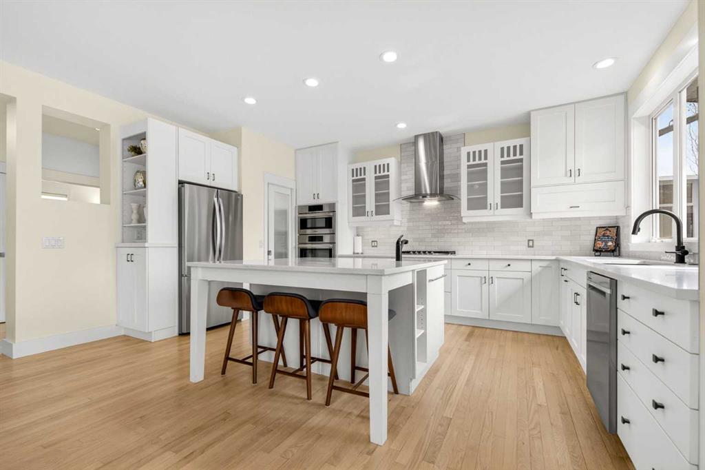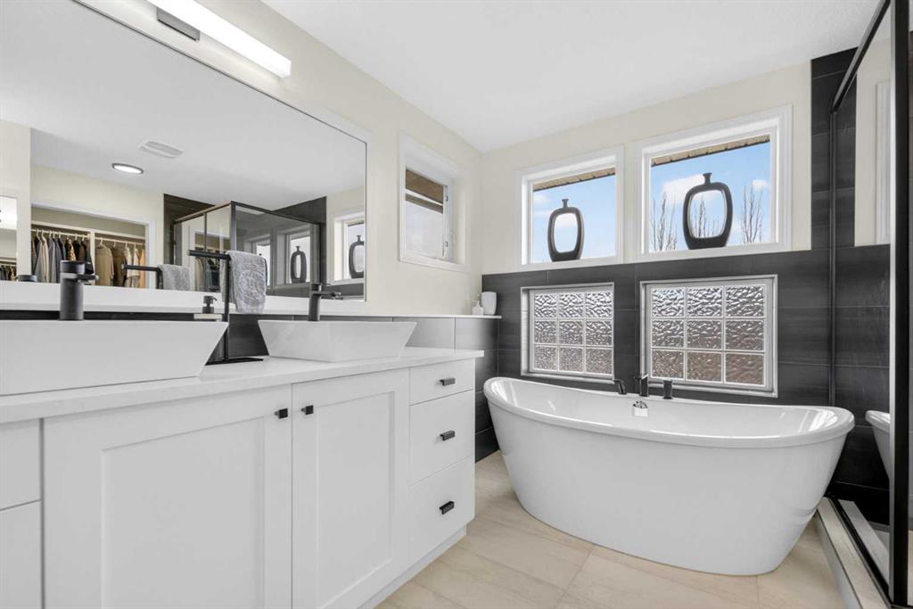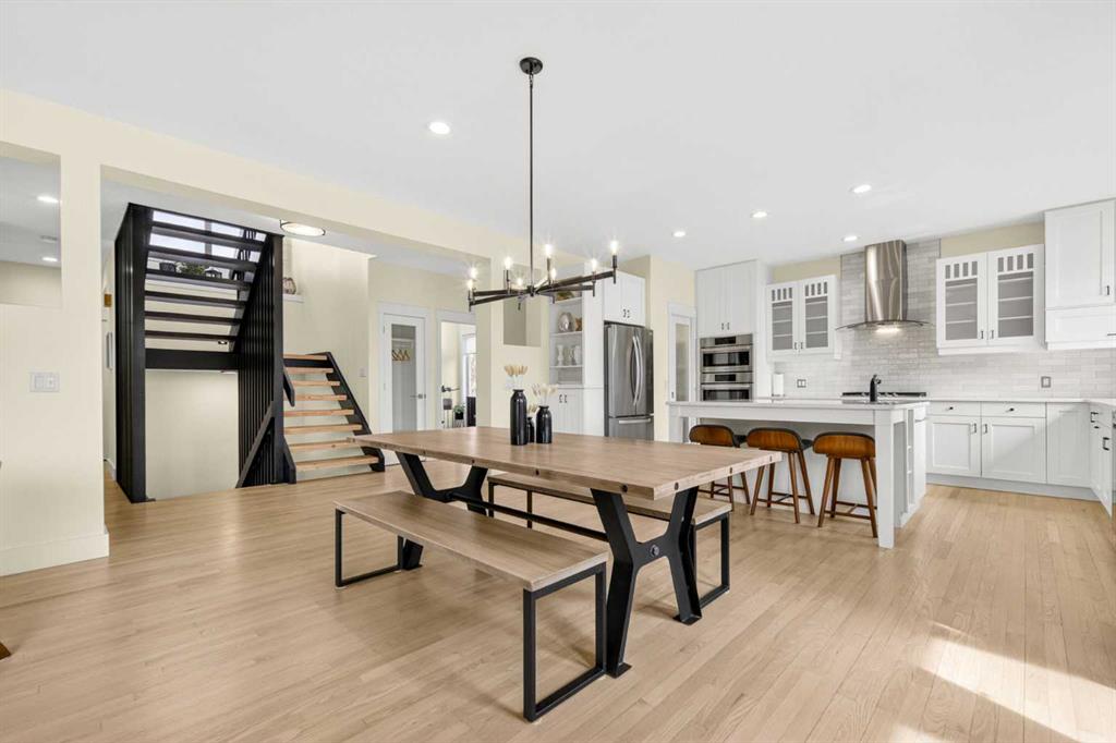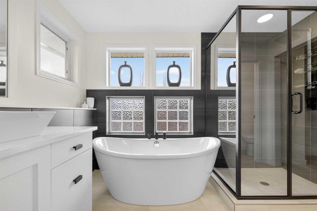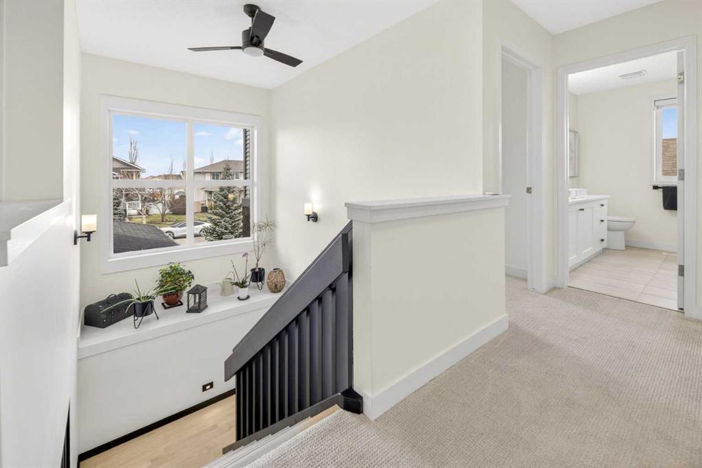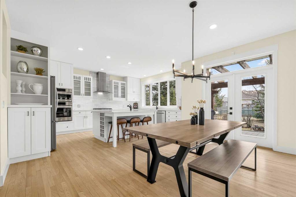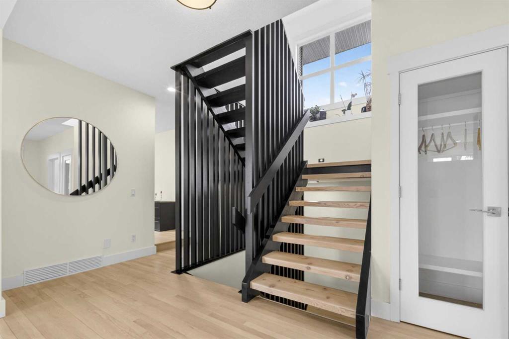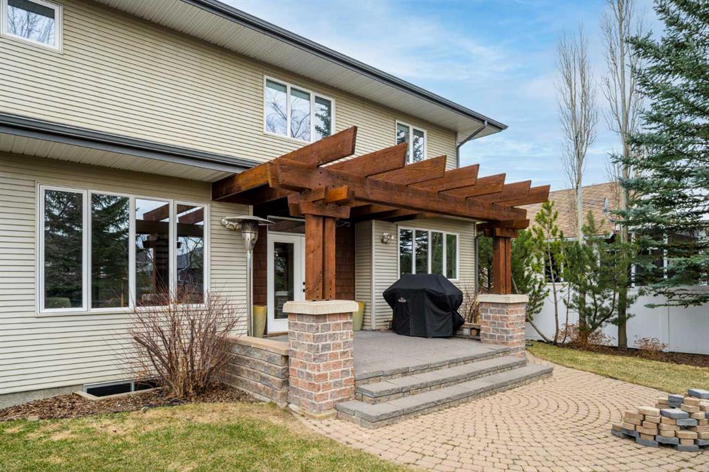 Welcome to this beautifully renovated 2,613 sq. ft. residence in the heart of Crossfield. Perfectly positioned on a quiet street backing onto a peaceful green belt, this home was extensively updated just two years ago to blend timeless craftsmanship with refined modern comfort. From the moment you arrive, the curb appeal is undeniable, highlighted by an oversized heated side-access garage, a new roof, freshly stained cedar shakes, and a uniquely finished driveway with colored concrete and an exposed aggregate border. Inside, a thoughtfully designed mudroom offers built-in wardrobe storage, bench seating, and wainscoting for a functional everyday entrance. The main floor showcases site-finished red oak hardwood with a white-washed matte finish, complemented by a stunning open-riser fir staircase and striking vertical slat feature walls. The great room is anchored by a gas fireplace with a light oak feature wall. French doors lead to the private south facing backyard oasis, complete with mature trees, underground sprinklers, and a paving stone patio with a cedar pergola. An additional flex room on the main floor offers versatility as a formal sitting area, private den, or guest space. At the heart of the home is a chef-inspired kitchen featuring a large island with a prep sink, a second sink overlooking the backyard, high-end built-in appliances, a gas cooktop, quartz countertops, solid oak cabinetry with under-cabinet lighting. The upper floor is tailored for family living, offering four spacious bedrooms. The newly renovated ensuite serves as a luxurious retreat with double vanities, a freestanding soaker tub, full tile shower, and a walk-in closet with custom shelving. The fully renovated laundry room is equally well appointed with a sink and custom storage. The unfinished basement presents an excellent opportunity to customize additional living space to suit your needs, while the rest of the home is truly move-in ready with updated plumbing fixtures and designer lighting throughout. This beautifully appointed property is a rare offering in a friendly family community. Book your private tour today and experience everything this exceptional home has to offer.