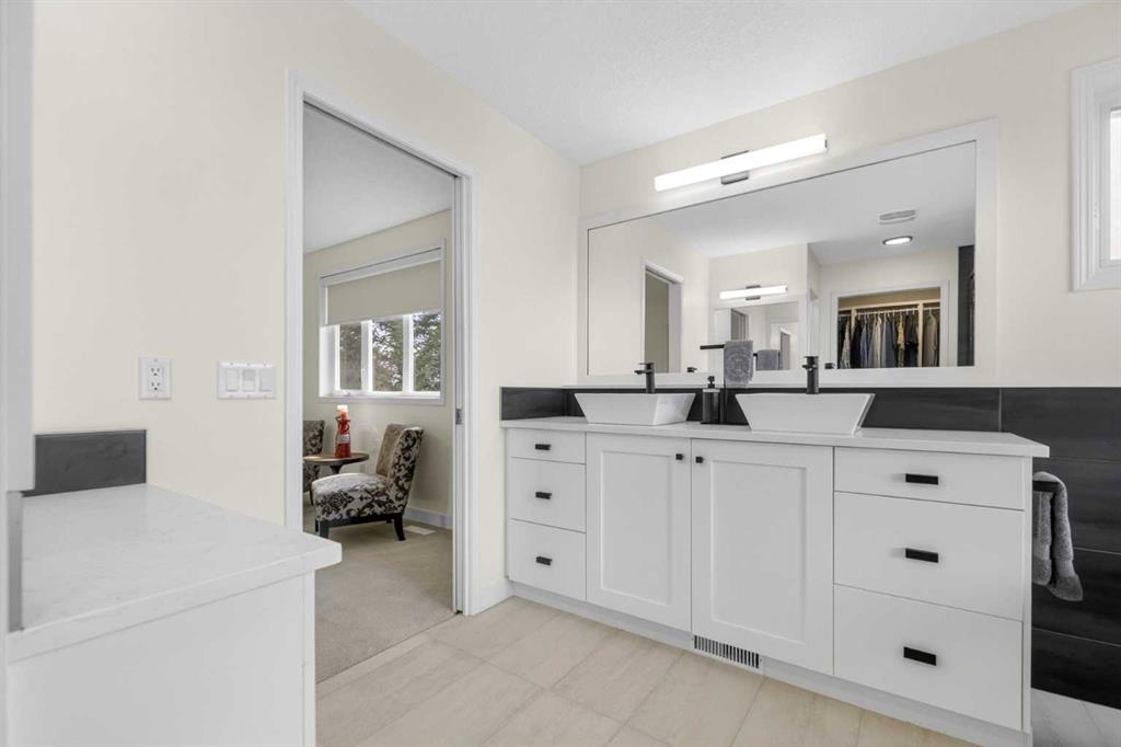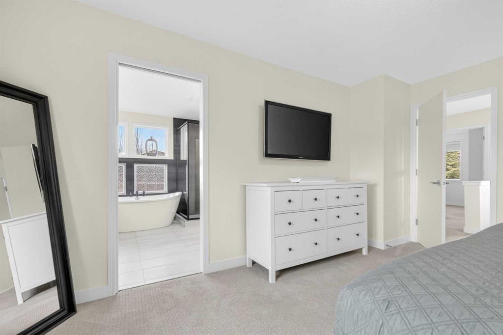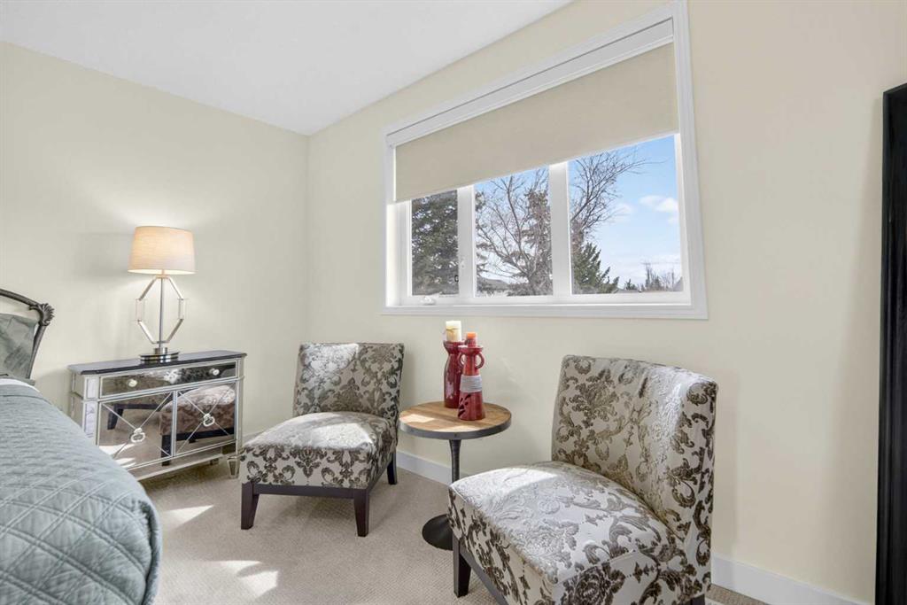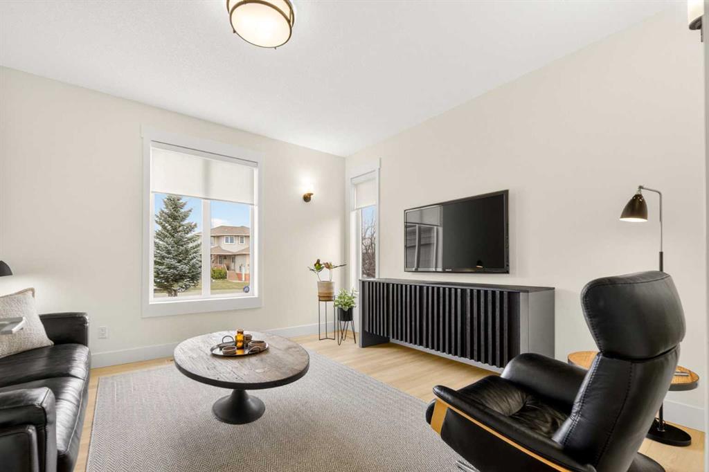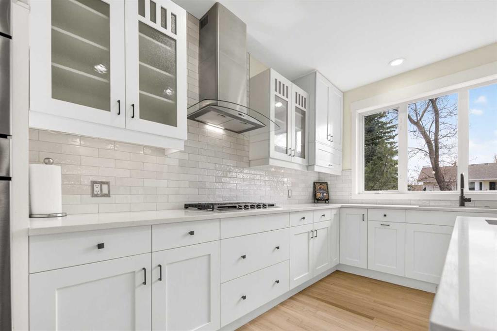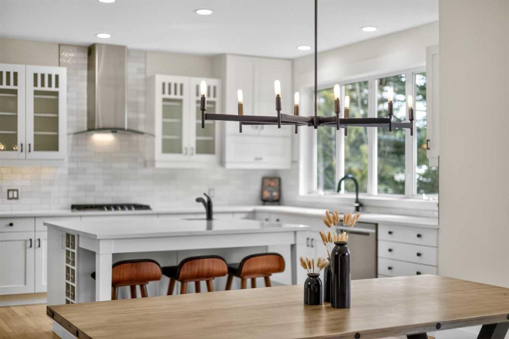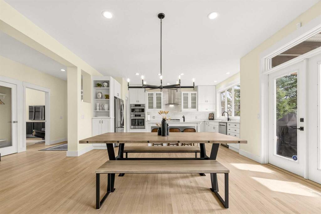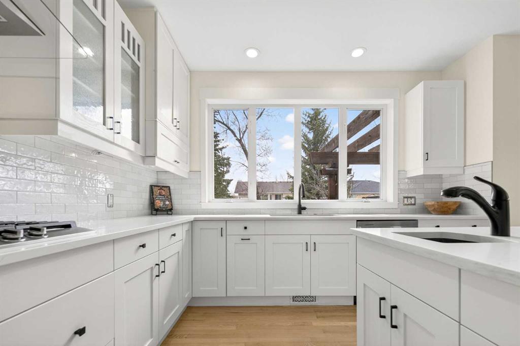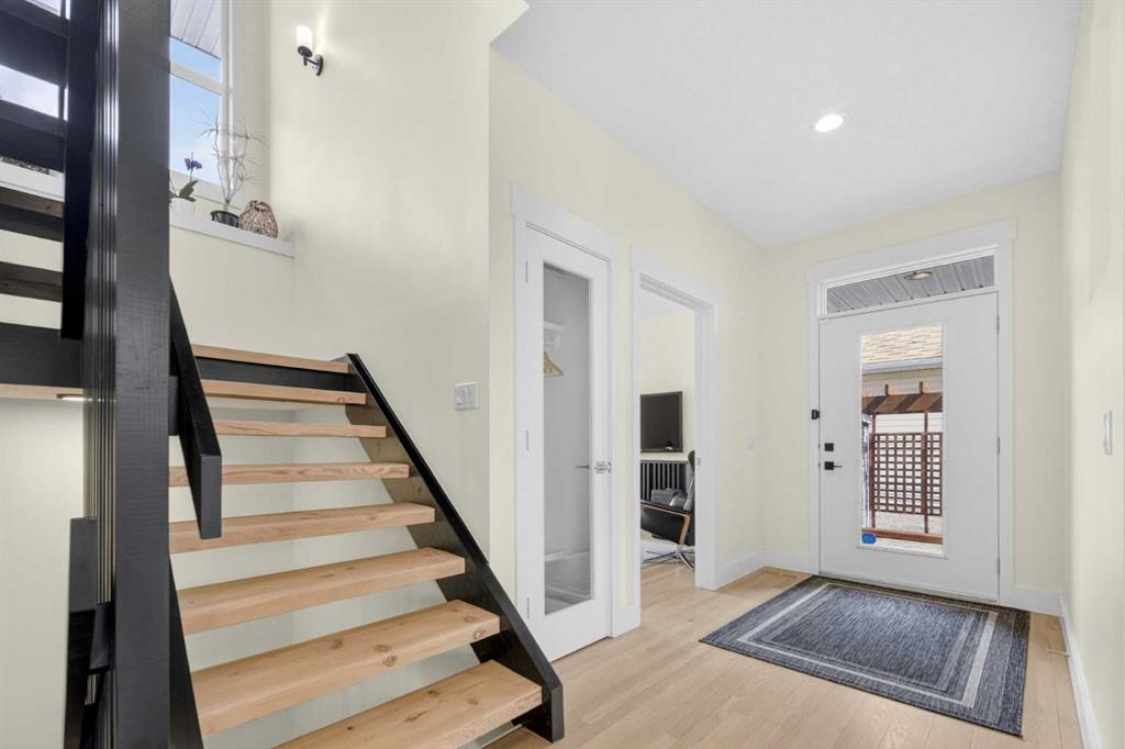 Welcome to this beautifully renovated 2,613 sq. ft. residence in the heart of Crossfield. Perfectly positioned on a quiet street backing onto a peaceful green belt, this home was extensively updated just two years ago to blend timeless craftsmanship with refined modern comfort. From the moment you arrive, the curb appeal is undeniable, highlighted by an oversized heated side-access garage, a new roof, freshly stained cedar shakes, and a uniquely finished driveway with colored concrete and an exposed aggregate border. Inside, a thoughtfully designed mudroom offers built-in wardrobe storage, bench seating, and wainscoting for a functional everyday entrance. The main floor showcases site-finished red oak hardwood with a white-washed matte finish, complemented by a stunning open-riser fir staircase and striking vertical slat feature walls. The great room is anchored by a gas fireplace with a light oak feature wall. French doors lead to the private south facing backyard oasis, complete with mature trees, underground sprinklers, and a paving stone patio with a cedar pergola. An additional flex room on the main floor offers versatility as a formal sitting area, private den, or guest space. At the heart of the home is a chef-inspired kitchen featuring a large island with a prep sink, a second sink overlooking the backyard, high-end built-in appliances, a gas cooktop, quartz countertops, solid oak cabinetry with under-cabinet lighting. The upper floor is tailored for family living, offering four spacious bedrooms. The newly renovated ensuite serves as a luxurious retreat with double vanities, a freestanding soaker tub, full tile shower, and a walk-in closet with custom shelving. The fully renovated laundry room is equally well appointed with a sink and custom storage. The unfinished basement presents an excellent opportunity to customize additional living space to suit your needs, while the rest of the home is truly move-in ready with updated plumbing fixtures and designer lighting throughout. This beautifully appointed property is a rare offering in a friendly family community. Book your private tour today and experience everything this exceptional home has to offer.