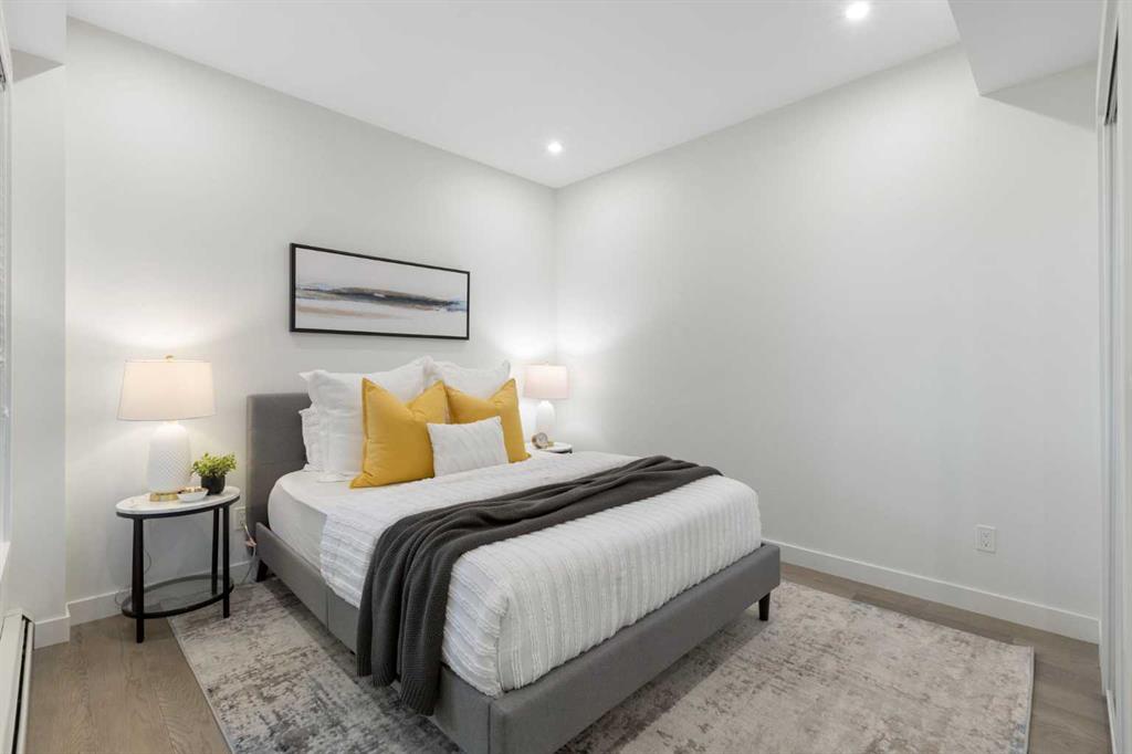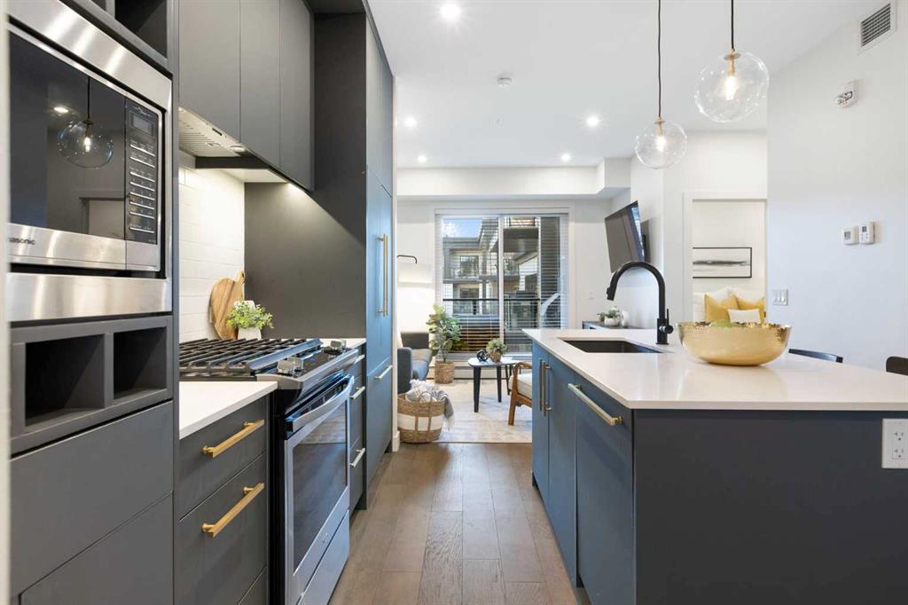 Elevate your lifestyle at Esquire’s Unit 325—where design, comfort, and connection define luxury in Calgary’s University District. DESIGN - Built by award-winning Truman Homes, Calgary’s builder of choice, this light-filled third-level unit offers 640 sq. ft. of open-concept living. Every element reflects modern sophistication, from the 9-foot ceilings and oak hardwood flooring to the premium fixtures and warm brass accents. The kitchen blends luxury and function with sleek charcoal cabinetry, soft-close drawers, an integrated wine rack, and elegant glass pendant lighting, while the white subway tile backsplash and under-cabinet lighting showcase the stainless steel microwave and gas range, and panelled appliances. Anchoring the heart of the home is the large white quartz island with seating for three, ideal for staying engaged for casual meals or hosting guests. COMFORT - Sun-drenched and airy floor plan with south-facing windows flows seamlessly to a covered balcony overlooking serene courtyard views. With 2 bedrooms, a stylish 4-piece bathroom, in-suite laundry, and LEED Platinum certification, this home offers a polished, comfortable experience. CONNECTION - Living up to its “Live Better” slogan, residents enjoy exclusive on-site amenities: 24-hour gym, workshop, pet spa, and bike room. Unique to this unit are titled heated underground parking and same-floor storage (no parkade trips), plus visitor parking in this pet-friendly building. Unmatched access to shop, sip, or get social at your favourite local cafes, shops, grocers, and restaurants, with an off-leash park and transit nearby. Quick drive to downtown and the mountains, and just a short walk to Alberta Children’s Hospital, Foothills Medical Centre, and University of Calgary, this home offers tremendous value in one of Calgary’s most desirable neighbourhoods. Perfect for first-time buyers, investors, downsizers, students, or healthcare professionals seeking unmatched convenience and community. Check out the online virtual tour, schedule your private showing today, and don’t miss the chance to own this exquisite Esquire condo Unit 325 in University District!