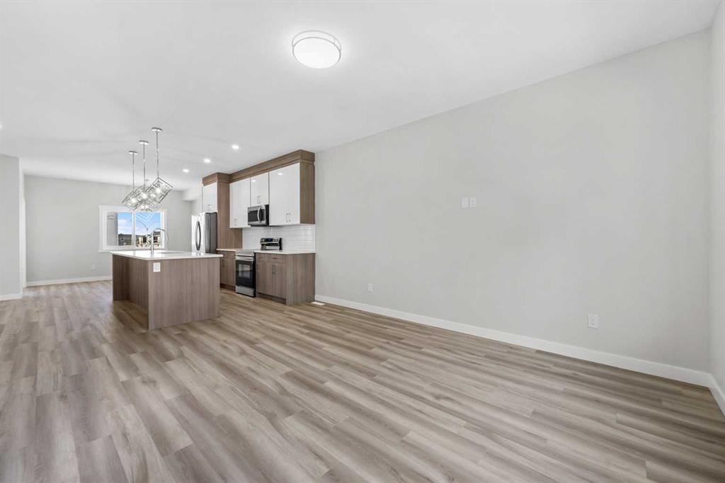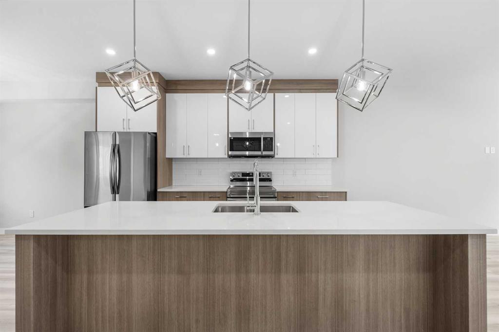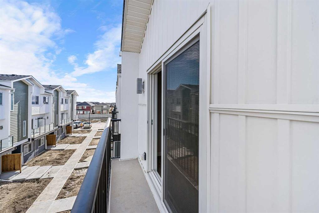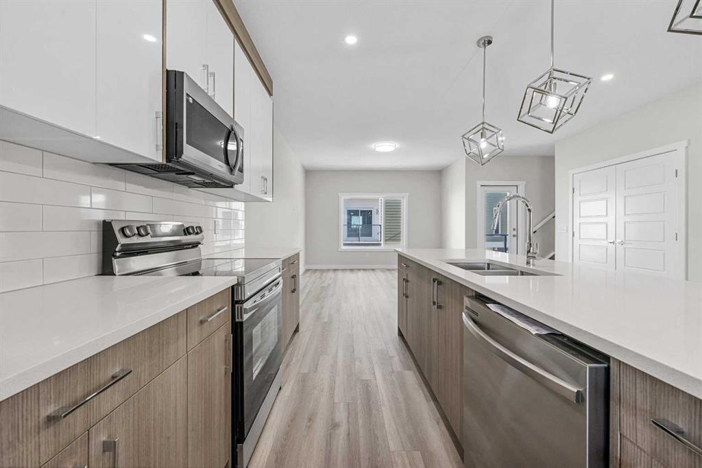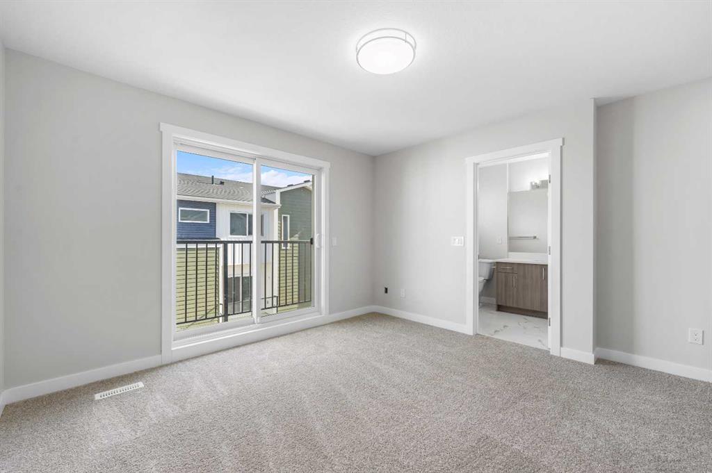 End Unit | Front of the Complex | Brand New | 3-Storey Townhome | Double Attached Garage | 4 Bedrooms | 3.5 Bathrooms | Main Level Bachelor Pad with Wet Bar | Modern Finishes | Quartz Countertops | Gloss Finished Full Height Upper Cabinets | Stainless Steel Appliances | Soft Closed Drawers & Cabinets | Stacked Front Loading Washer & Dryer | Energy Saving High Performance Windows | Private Balcony | Keyless Pad Garage | Private Walkway to Front Door | Exterior Privacy Walls. This townhome is finished with an open concept, modern design and a functional open floor plan to complement your lifestyle. Step inside the front door to a foyer with access to the double attached garage and the first primary bedroom of this 3-storey townhome. The main floor bedroom is designed for individual living. This large bedroom is outfitted with a wet bar with built-in cabinets above & below, a sink and space for appliances. This bedroom is paired with a 4pc ensuite bath with a tub/shower combo. The 2nd level is home to the open and bright main living space that incorporates kitchen, dining and living room. The kitchen features 36" upper cabinets, quartz countertops, soft close cabinets & drawers and a grand centre island with barstool seating. Across from the island are two pantries for dry goods storage! Off the kitchen is a spacious dedicated dining area. Next is the home office/den. This space is an added bonus for anyone with a work from home lifestyle or a space for overnight guests. The frosted french doors provide privacy while keeping the space airy and welcoming. The grand living room is expansive and inviting for when you host friends and family! The living room is complimented with a glass door that leads to your West facing balcony with lighting and a gas line for a BBQ. The balcony is partnered with a frosted glass privacy screen. This level is complete with a 2pc bathroom. The upper level holds 3 grandiose bedrooms and 2 bathrooms. The first is a spacious primary bedroom featuring a deep walk-in closet and its very own 3pc ensuite with a walk-in shower. Bedrooms 2 & 3 are mirrored images of each other with great lighting and closet space. The main 4pc bath has a tub/shower combo. Convenient upper level hall laundry near the bedrooms is a bonus! A home with great value and low condo fees to ensure you receive exemplary services at reasonable prices. The location also places you in the highly sought after brand new community of Redstone with quick access to Stoney Trail for your daily commute. This complex will have a centred greenspace courtyard and ample visitor parking! Design, features and finishings may not be exactly as shown. The actual layout may be a mirror image of the layout shown here. *Photos are from unit 110 Red Sky Villas. Hurry and book your showing to secure yourself a brand new townhome today!