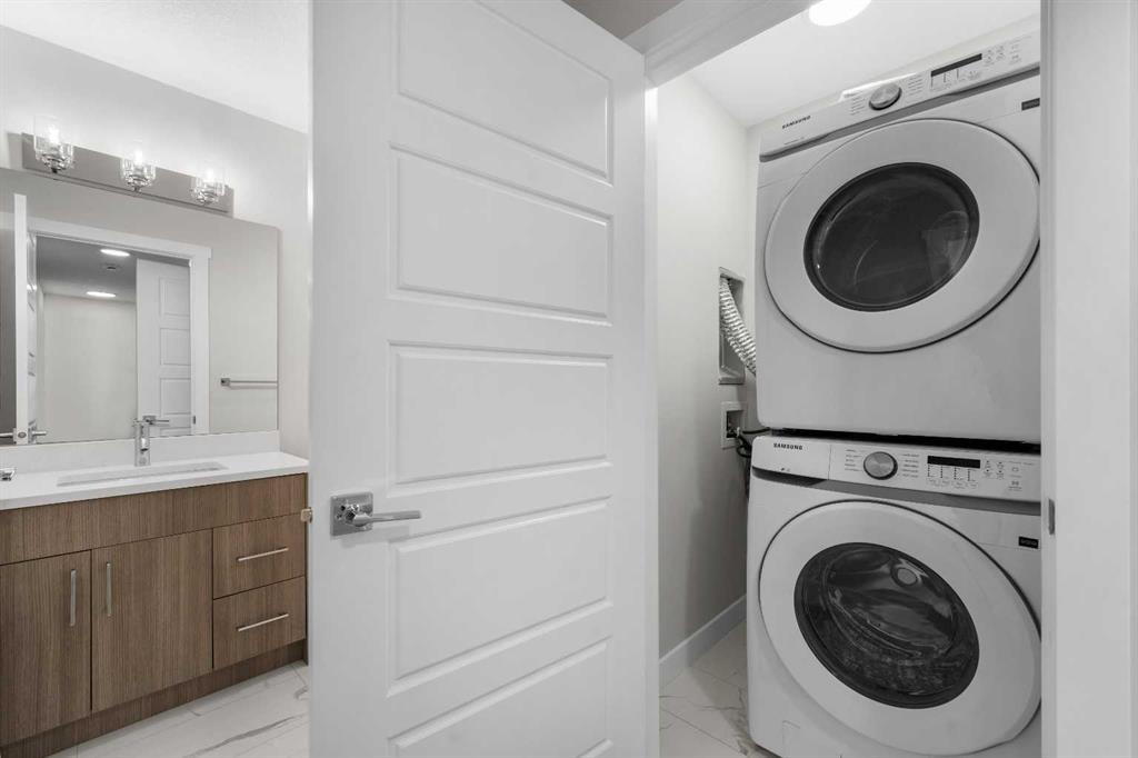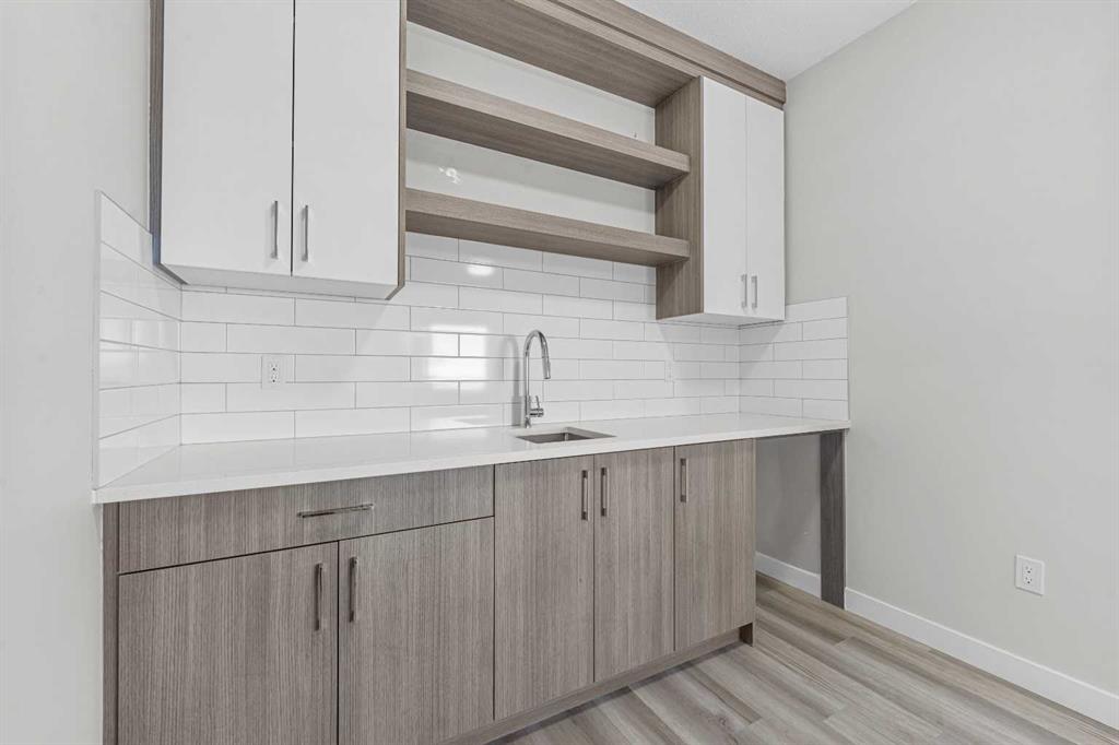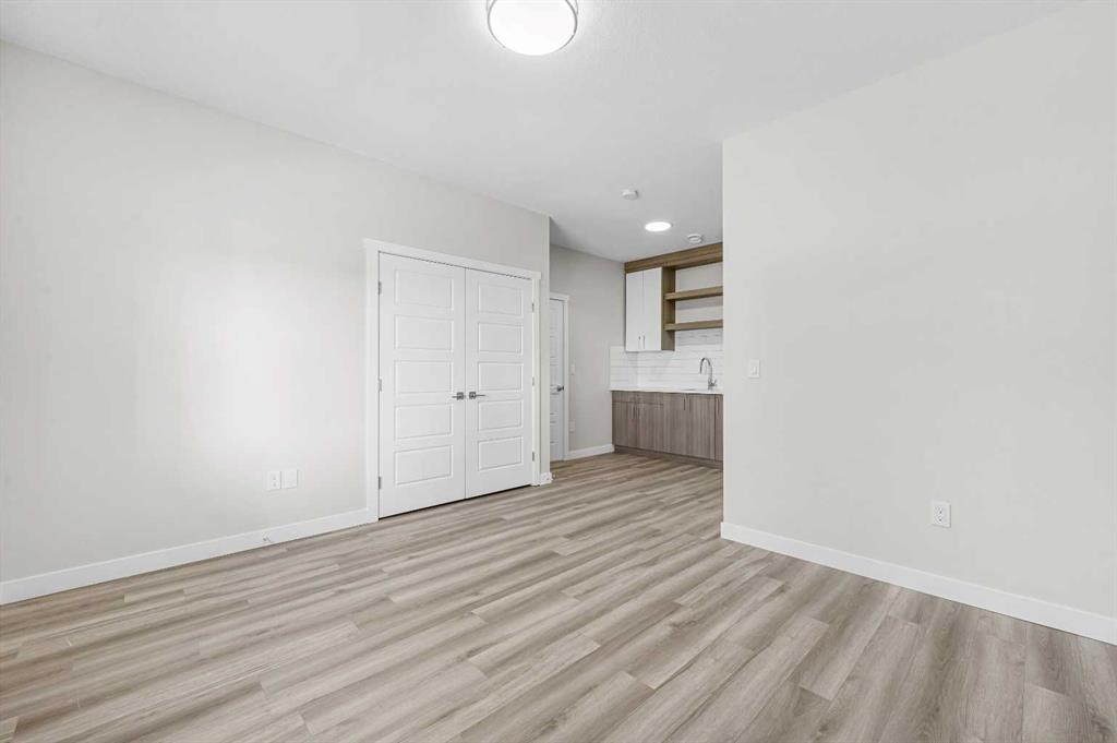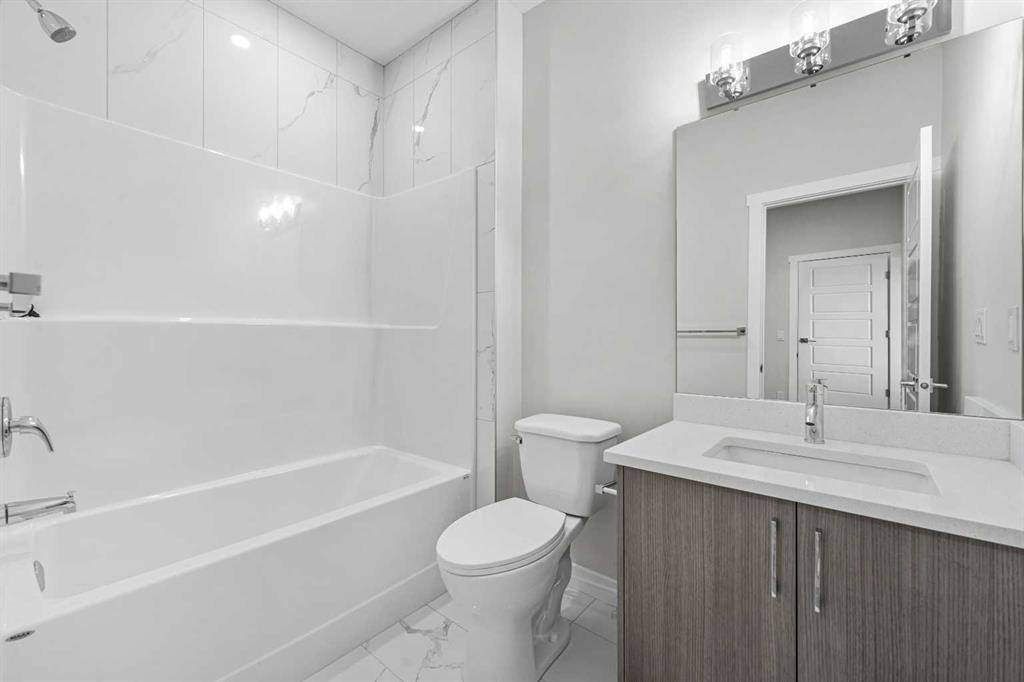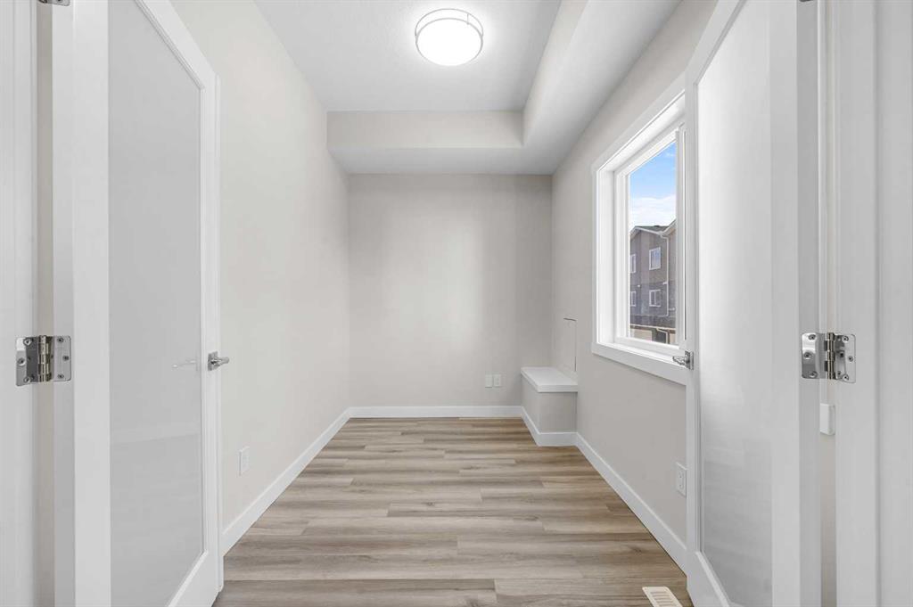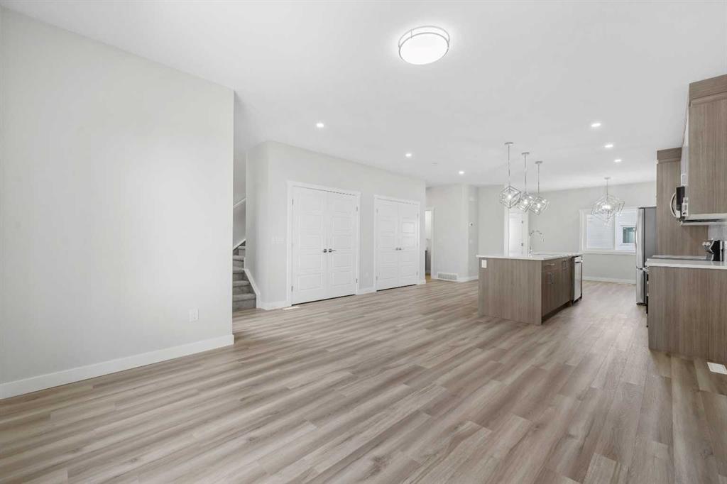 End Unit | Front of the Complex | Brand New | 3-Storey Townhome | Double Attached Garage | 4 Bedrooms | 3.5 Bathrooms | Main Level Bachelor Pad with Wet Bar | Modern Finishes | Quartz Countertops | Gloss Finished Full Height Upper Cabinets | Stainless Steel Appliances | Soft Closed Drawers & Cabinets | Stacked Front Loading Washer & Dryer | Energy Saving High Performance Windows | Private Balcony | Keyless Pad Garage | Private Walkway to Front Door | Exterior Privacy Walls. This townhome is finished with an open concept, modern design and a functional open floor plan to complement your lifestyle. Step inside the front door to a foyer with access to the double attached garage and the first primary bedroom of this 3-storey townhome. The main floor bedroom is designed for individual living. This large bedroom is outfitted with a wet bar with built-in cabinets above & below, a sink and space for appliances. This bedroom is paired with a 4pc ensuite bath with a tub/shower combo. The 2nd level is home to the open and bright main living space that incorporates kitchen, dining and living room. The kitchen features 36" upper cabinets, quartz countertops, soft close cabinets & drawers and a grand centre island with barstool seating. Across from the island are two pantries for dry goods storage! Off the kitchen is a spacious dedicated dining area. Next is the home office/den. This space is an added bonus for anyone with a work from home lifestyle or a space for overnight guests. The frosted french doors provide privacy while keeping the space airy and welcoming. The grand living room is expansive and inviting for when you host friends and family! The living room is complimented with a glass door that leads to your West facing balcony with lighting and a gas line for a BBQ. The balcony is partnered with a frosted glass privacy screen. This level is complete with a 2pc bathroom. The upper level holds 3 grandiose bedrooms and 2 bathrooms. The first is a spacious primary bedroom featuring a deep walk-in closet and its very own 3pc ensuite with a walk-in shower. Bedrooms 2 & 3 are mirrored images of each other with great lighting and closet space. The main 4pc bath has a tub/shower combo. Convenient upper level hall laundry near the bedrooms is a bonus! A home with great value and low condo fees to ensure you receive exemplary services at reasonable prices. The location also places you in the highly sought after brand new community of Redstone with quick access to Stoney Trail for your daily commute. This complex will have a centred greenspace courtyard and ample visitor parking! Design, features and finishings may not be exactly as shown. The actual layout may be a mirror image of the layout shown here. *Photos are from unit 110 Red Sky Villas. Hurry and book your showing to secure yourself a brand new townhome today!