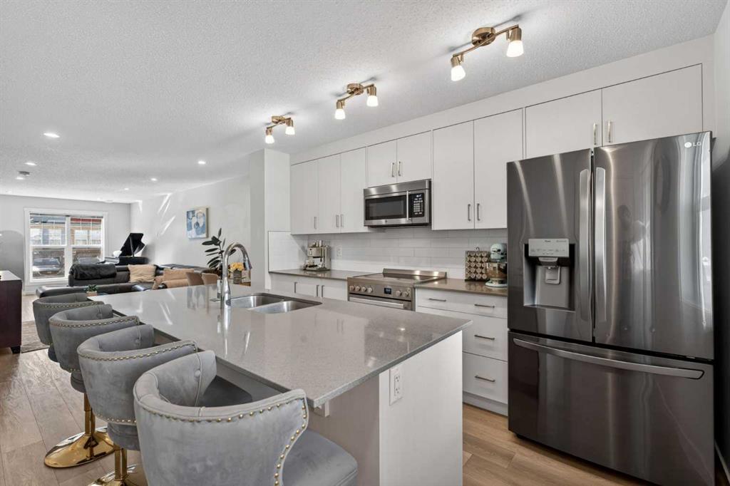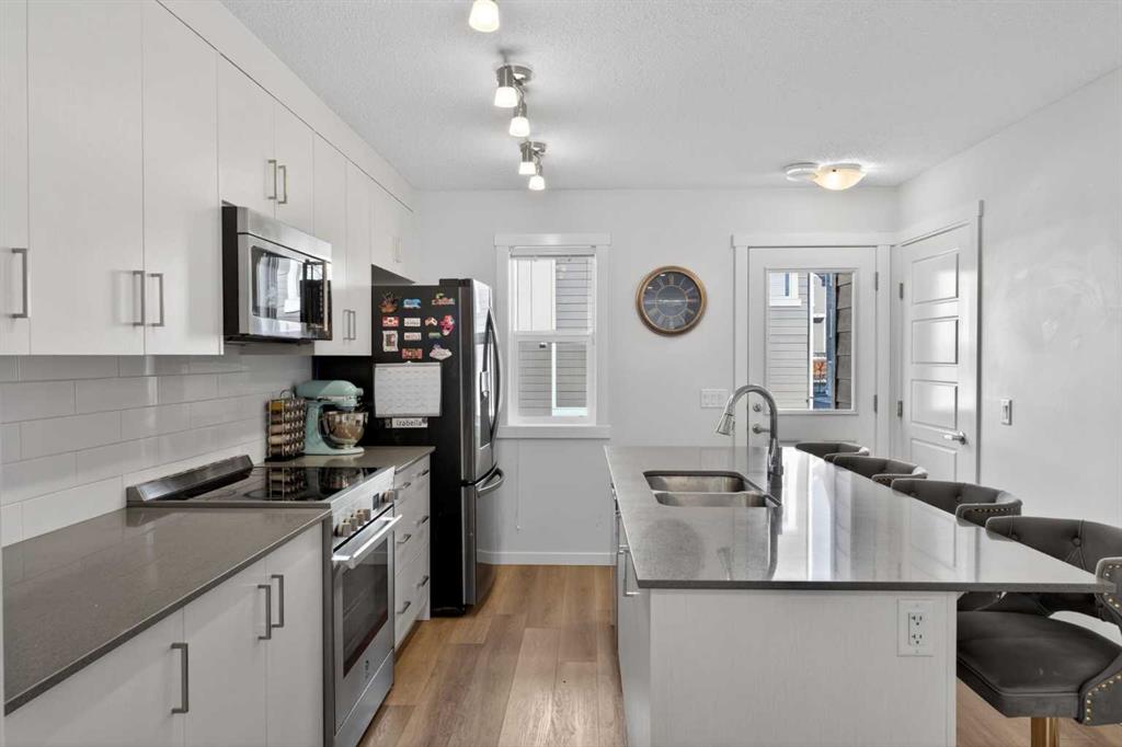 Welcome to Riverstone in Cranston, where nature, lifestyle, and thoughtful design come together in one of Calgary’s most beautiful and sought-after communities. This stunning three-storey executive townhome offers 1,500+ sq. ft. of stylish living space & stands out with features that are truly hard to find in townhome living, including a separate fenced yard, low condo fees, and an exceptional third-level bonus room with rooftop deck. Located in the highly desirable lower portion of Cranston, just moments from the Bow River, scenic walking paths, parks, and playgrounds, this is a home that offers so much more than just great square footage, it offers a lifestyle. Riverstone is beloved for its peaceful setting, easy access to nature, and incredible outdoor amenities, making it a perfect fit for buyers who want both convenience and connection to the outdoors. Inside, the main floor is bright, open, and welcoming, designed for both everyday living and entertaining. The spacious living and dining areas flow seamlessly into the beautifully appointed kitchen, where a massive quartz island with breakfast bar becomes the natural gathering place for family and guests alike. Timeless white cabinetry, classic subway tile, stainless steel appliances, and direct access out to your own private backyard make this kitchen as functional as it is attractive—perfect for everything from daily routines to summer BBQs and easy indoor-outdoor living. Upstairs on the second level, you’ll find two generous bedrooms, including a spacious primary retreat that easily fits a king-sized bed and features its own private 3-piece ensuite. The second bedroom is equally well-sized and filled with natural morning light, while a full 4-piece bathroom located just outside the bedroom adds comfort and convenience for family members or guests. What truly sets this home apart, however, is the incredible third-floor bonus room—a rare and versatile space seldom found in townhomes. Whether you envision a home office, media room, fitness area, guest retreat, playroom, or creative studio, this upper-level flex space offers endless possibilities. Even better, it opens onto your private rooftop deck, creating the perfect spot to enjoy morning coffee, unwind in the evening, or soak in the fresh air above it all. This combination of bonus room plus rooftop outdoor space is an absolute standout. Another rare feature is the separate fenced yard—ideal for a dog owner, young family, or anyone who appreciates having a private outdoor area for BBQs, relaxing in the sun, or enjoying a bit of extra space that many townhomes simply do not offer. With sunny west exposure, this yard is a true extension of the home. Also included is a designated parking stall conveniently located just steps from the front door. You’ll also enjoy access to Century Hall and all of Cranston’s exceptional amenities, including skating, hockey, tennis courts, a splash park, skate park, gymnasium, and more.