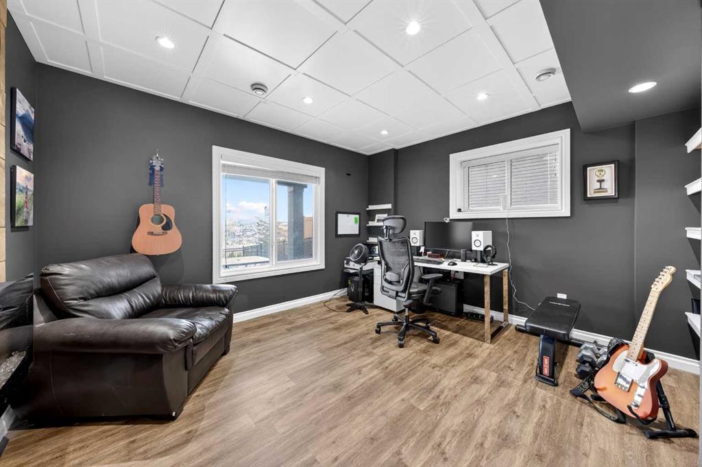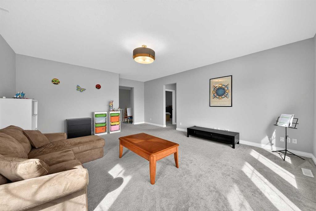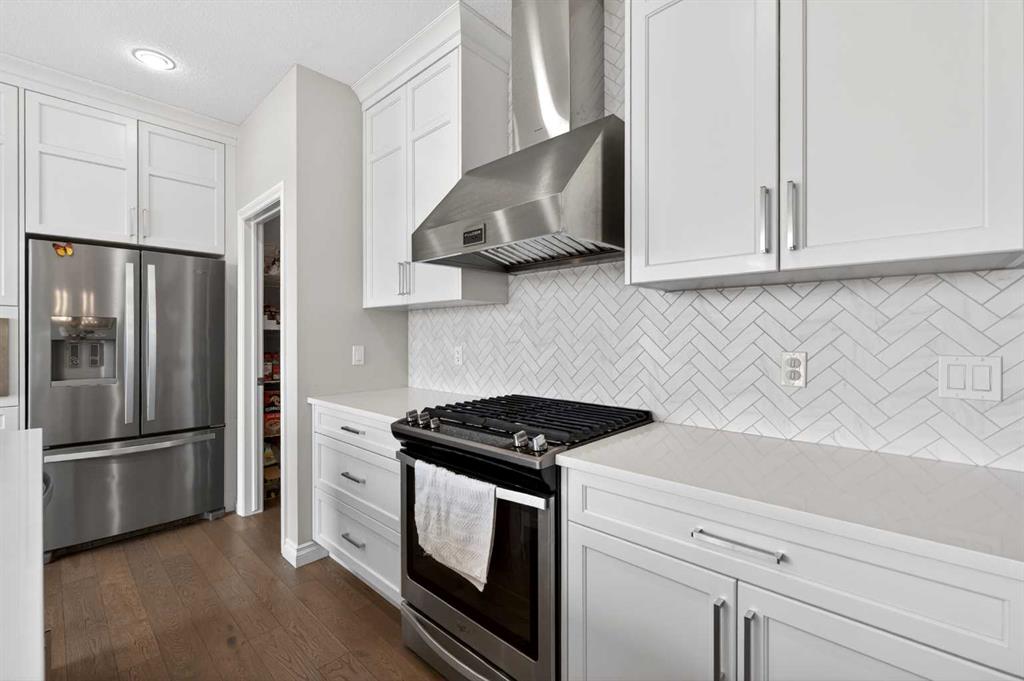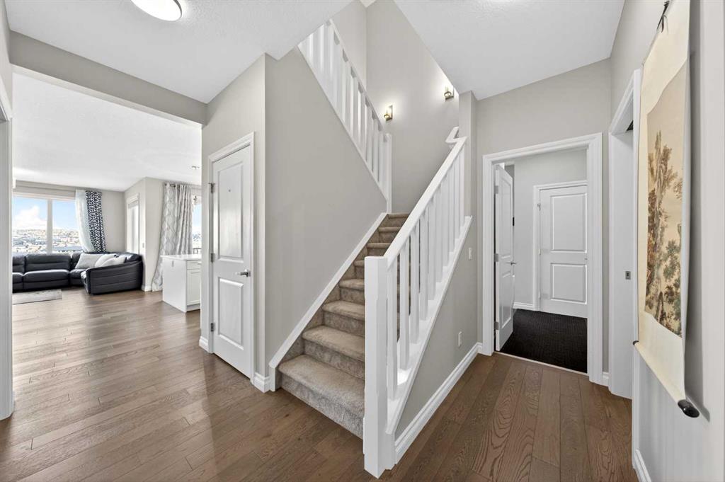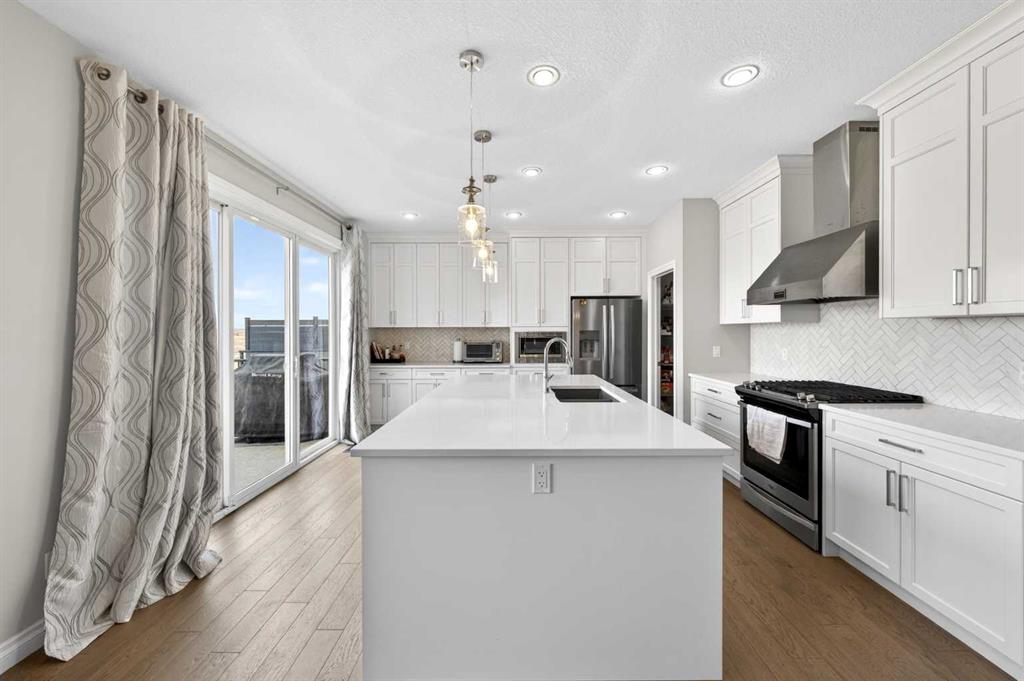 Elevated Ridge Lot with breathtaking Panoramic views! Welcome to this exceptional walkout basement home in Evanston, perfectly positioned on a coveted ridge, showcasing sweeping views of greenspace, walking paths, hiking trails, and four scenic ponds. Offering 4+1 bedrooms plus a Den, 3.5 baths, a Triple attached garage, Stucco exterior and over 3,400 sq ft of total living space with 9-foot ceilings—this is outdoor living at its finest. Step inside and greeted by the 9-foot ceilings and Engineered Hardwood floor. A versatile Den is ideal for a home office or study. The heart of the home is the open-concept Living and Dining area, where large windows frame the stunning panoramic views and a cozy gas fireplace adds warmth and comfort. The adjacent gourmet Kitchen features a massive quartz centre island, perfect for meal preparation, along with stainless steel appliances including a gas stove and a upgraded 600 cfm hoodfan, backsplash tile, and walk-thru pantry. Step out onto the deck with BBQ gas hookup—perfect for summer gatherings while enjoying the peaceful scenery.   On the upper level, 9-foot ceilings continue throughout, enhancing the sense of space and light. A spacious Bonus room offers the perfect setting for a media area or family retreat. The Primary bedroom is thoughtfully positioned to capture the breathtaking views, creating a relaxing and private retreat. The 5-piece ensuite also enjoys the same scenic outlook, featuring a double vanity with quartz countertops, a freestanding soaker tub, and a well-sized walk-in closet. Three additional bedrooms, including two with walk-in closets. An upper-level laundry room with extra storage and a 4-piece bathroom completes this floor. The fully finished walkout basement features higher ceilings. A spacious Recreation room with a wet bar offers endless possibilities for entertaining or relaxing. This level finished with a well-sized bedroom featuring an electric fireplace—perfect for guests, extended family, or a private workspace. Step outside to your landscaped backyard with a stone patio, backing directly onto the scenic pathway system with gate access—allowing you to walk straight out to nature from your yard. Additional highlights include central A/C, triple pane windows throughout, and a triple attached garage. Recent upgrades: New Level 4 hail resistant Shingles, new eavestrough throughout. Located in the vibrant community of Evanston, this home offers the perfect balance of nature and convenience. Enjoy immediate access to scenic pathways, wetlands, and nearby parks, with schools, playgrounds, and shopping just minutes away. Evanston Towne Centre, grocery stores, restaurants, and major routes including Stoney Trail and Symons Valley Road are all easily accessible, making daily commuting and errands effortless. This is a rare opportunity to own a beautifully appointed walkout home with stunning views, an exceptional layout, and a prime location in one of NW Calgary’s most desirable communities.