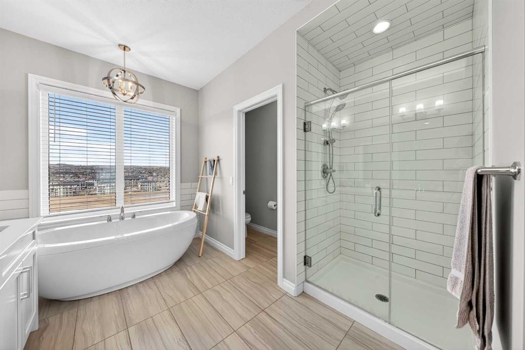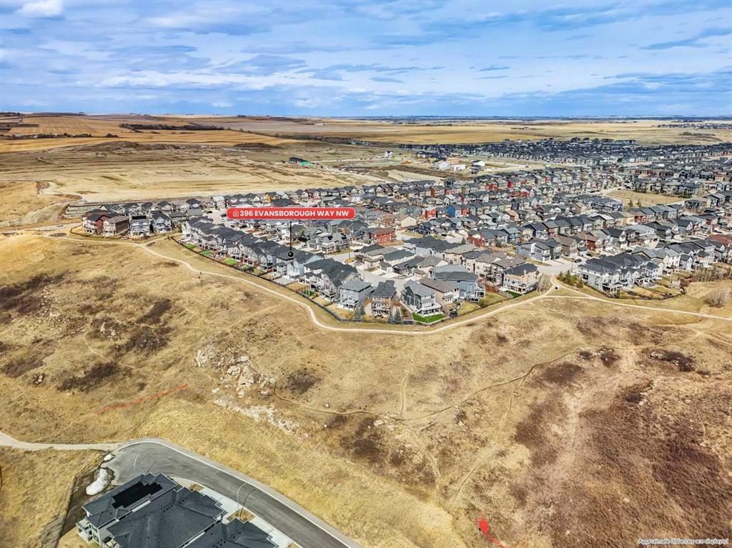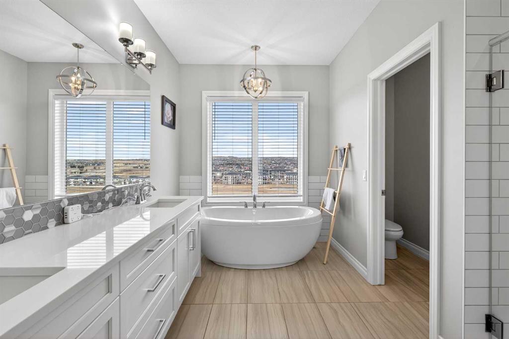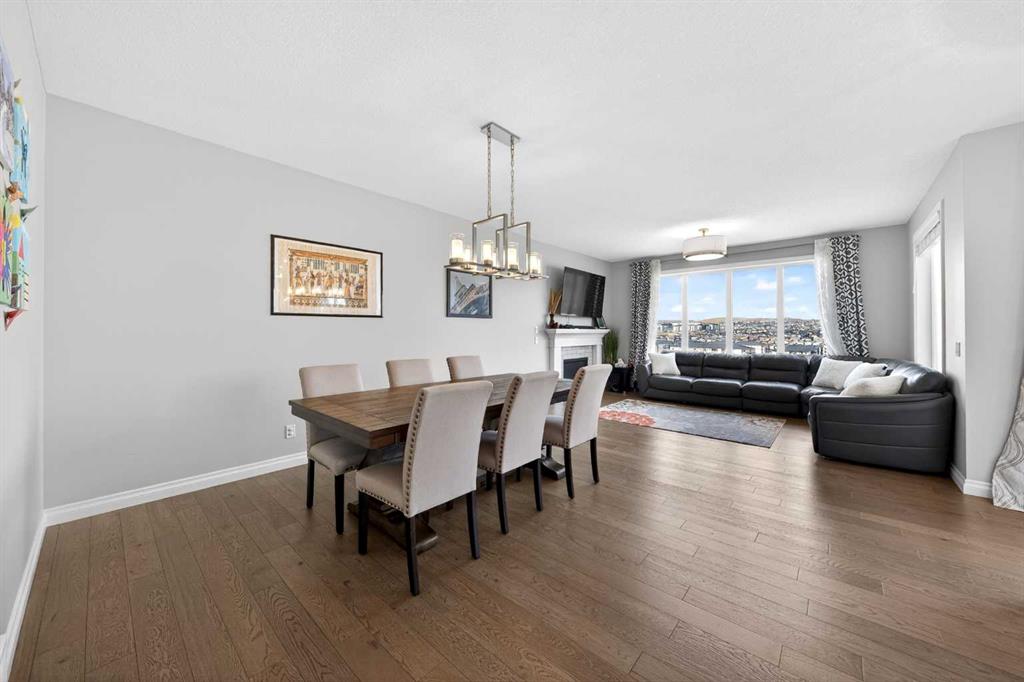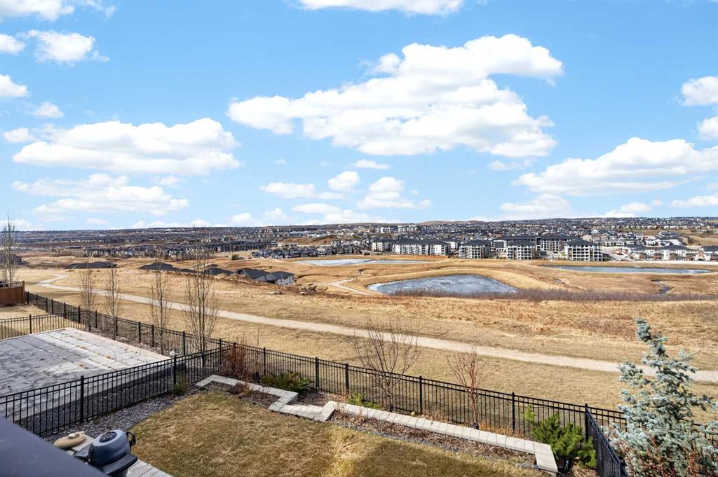 Elevated Ridge Lot with breathtaking Panoramic views! Welcome to this exceptional walkout basement home in Evanston, perfectly positioned on a coveted ridge, showcasing sweeping views of greenspace, walking paths, hiking trails, and four scenic ponds. Offering 4+1 bedrooms plus a Den, 3.5 baths, a Triple attached garage, Stucco exterior and over 3,400 sq ft of total living space with 9-foot ceilings—this is outdoor living at its finest. Step inside and greeted by the 9-foot ceilings and Engineered Hardwood floor. A versatile Den is ideal for a home office or study. The heart of the home is the open-concept Living and Dining area, where large windows frame the stunning panoramic views and a cozy gas fireplace adds warmth and comfort. The adjacent gourmet Kitchen features a massive quartz centre island, perfect for meal preparation, along with stainless steel appliances including a gas stove and a upgraded 600 cfm hoodfan, backsplash tile, and walk-thru pantry. Step out onto the deck with BBQ gas hookup—perfect for summer gatherings while enjoying the peaceful scenery. On the upper level, 9-foot ceilings continue throughout, enhancing the sense of space and light. A spacious Bonus room offers the perfect setting for a media area or family retreat. The Primary bedroom is thoughtfully positioned to capture the breathtaking views, creating a relaxing and private retreat. The 5-piece ensuite also enjoys the same scenic outlook, featuring a double vanity with quartz countertops, a freestanding soaker tub, and a well-sized walk-in closet. Three additional bedrooms, including two with walk-in closets. An upper-level laundry room with extra storage and a 4-piece bathroom completes this floor. The fully finished walkout basement features higher ceilings. A spacious Recreation room with a wet bar offers endless possibilities for entertaining or relaxing. This level finished with a well-sized bedroom featuring an electric fireplace—perfect for guests, extended family, or a private workspace. Step outside to your landscaped backyard with a stone patio, backing directly onto the scenic pathway system with gate access—allowing you to walk straight out to nature from your yard. Additional highlights include central A/C, triple pane windows throughout, and a triple attached garage. Recent upgrades: New Level 4 hail resistant Shingles, new eavestrough throughout. Located in the vibrant community of Evanston, this home offers the perfect balance of nature and convenience. Enjoy immediate access to scenic pathways, wetlands, and nearby parks, with schools, playgrounds, and shopping just minutes away. Evanston Towne Centre, grocery stores, restaurants, and major routes including Stoney Trail and Symons Valley Road are all easily accessible, making daily commuting and errands effortless. This is a rare opportunity to own a beautifully appointed walkout home with stunning views, an exceptional layout, and a prime location in one of NW Calgary’s most desirable communities.