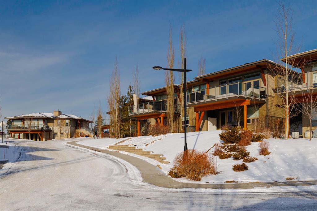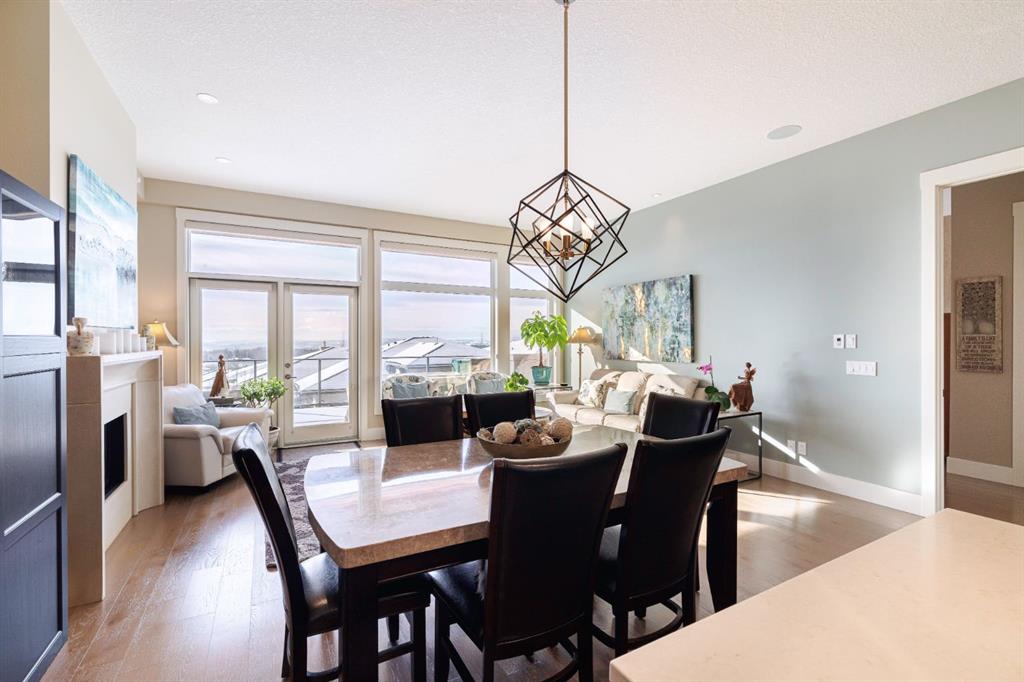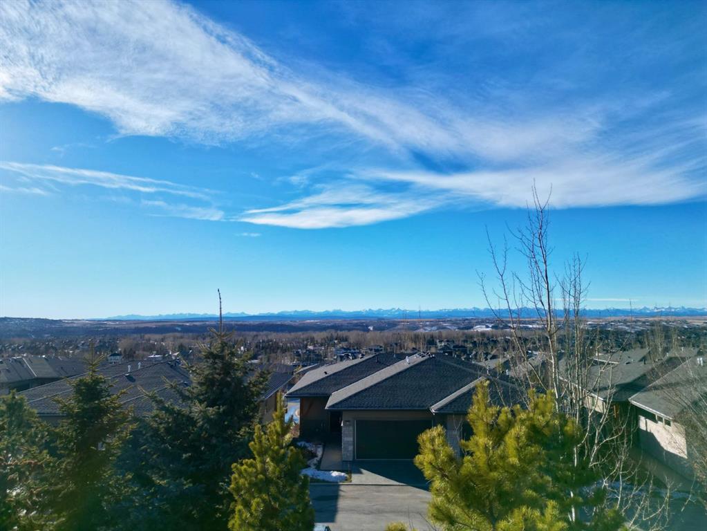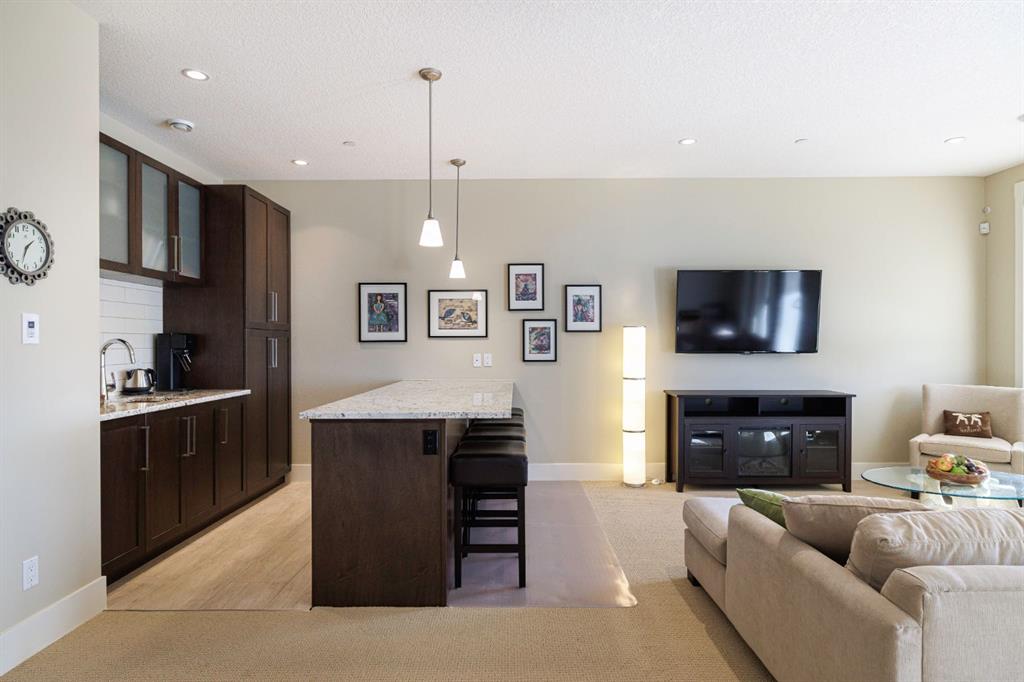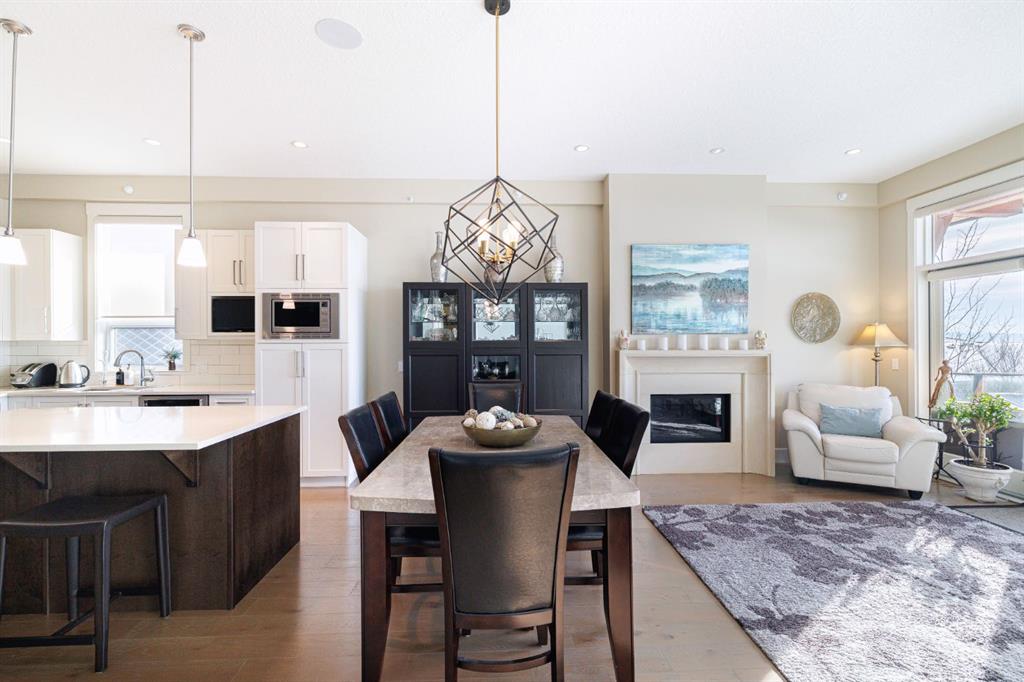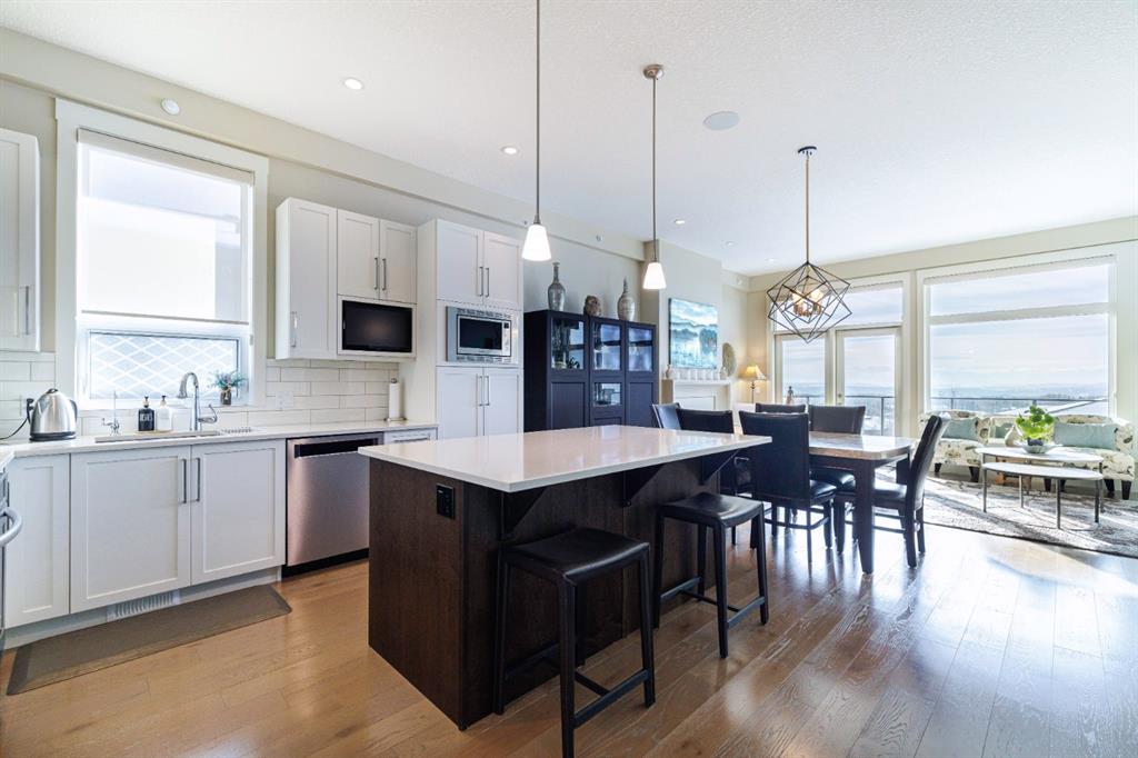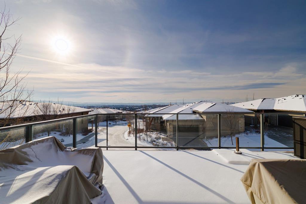 Welcome to this beautifully appointed bungalow villa offering refined comfort, thoughtful upgrades, and breathtaking mountain views with over 2300 sqft of living space! From the moment you step inside, you are greeted by soaring 10-foot ceilings and rich hardwood flooring throughout the main level, creating a bright and inviting atmosphere. The home is enhanced with air conditioning, a water softener, central vacuum system, an epoxy-finished garage floor, solid core doors throughout, and 4 pairs of in-ceiling speakers which connect to audio systems. The kitchen is designed for both everyday living and entertaining, featuring stainless steel appliances, a large central island, gas stove, and elegant quartz countertops. A timeless subway tile backsplash and filtered water tap add both beauty and practicality. Open to the eating nook and living room, this space flows seamlessly for hosting family and friends. The eating nook is filled with natural light and enjoys open sightlines to both the kitchen and living room. The living room is equally impressive with a gas fireplace and mantle, expansive windows, and direct access to the back deck, where you can relax and take in panoramic mountain views and brilliant sunsets. The primary bedroom retreat is bright and spacious with desirable west-facing windows. A custom walk-in closet with built-in organizers provides excellent storage, while the luxurious 5-piece ensuite offers a private water closet, stand-alone shower, dual vanity, and deep soaking tub—your personal spa-like escape. A well-equipped laundry room adds everyday convenience with a sink, built-in cabinetry, hanging rod, and additional pantry/storage built-ins. A stylish 2-piece powder room completes the main floor for added functionality. Downstairs, the fully developed basement offers exceptional additional living space with brand new carpet throughout. The spacious family room features walkout access to the lower patio, perfect for entertaining or enjoying outdoor living. A stylish wet bar with bar fridge, granite countertops, and built-in cabinetry makes this level ideal for gatherings. Two generously sized bedrooms are complemented by a 4-piece bathroom with dual vanity and stand-alone shower, providing comfort and privacy for guests or family members. This thoughtfully designed bungalow villa blends elegance, functionality, and stunning views—offering low-maintenance living without compromise. An exceptional opportunity to enjoy single-level luxury in a truly scenic setting.