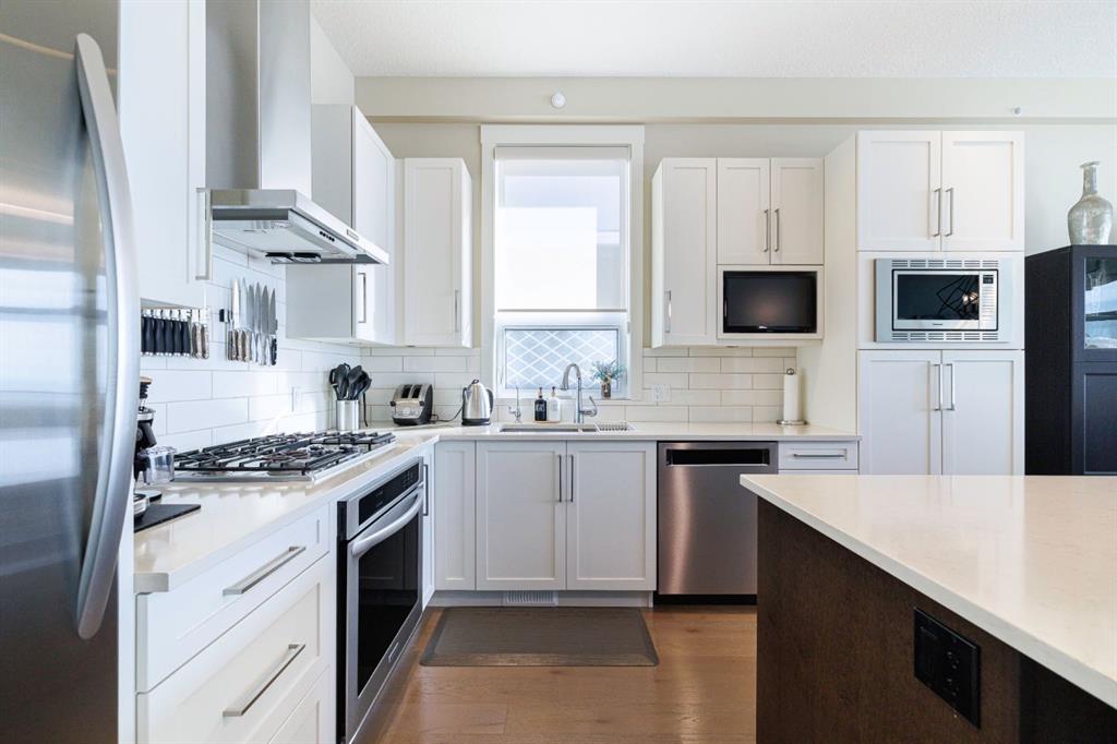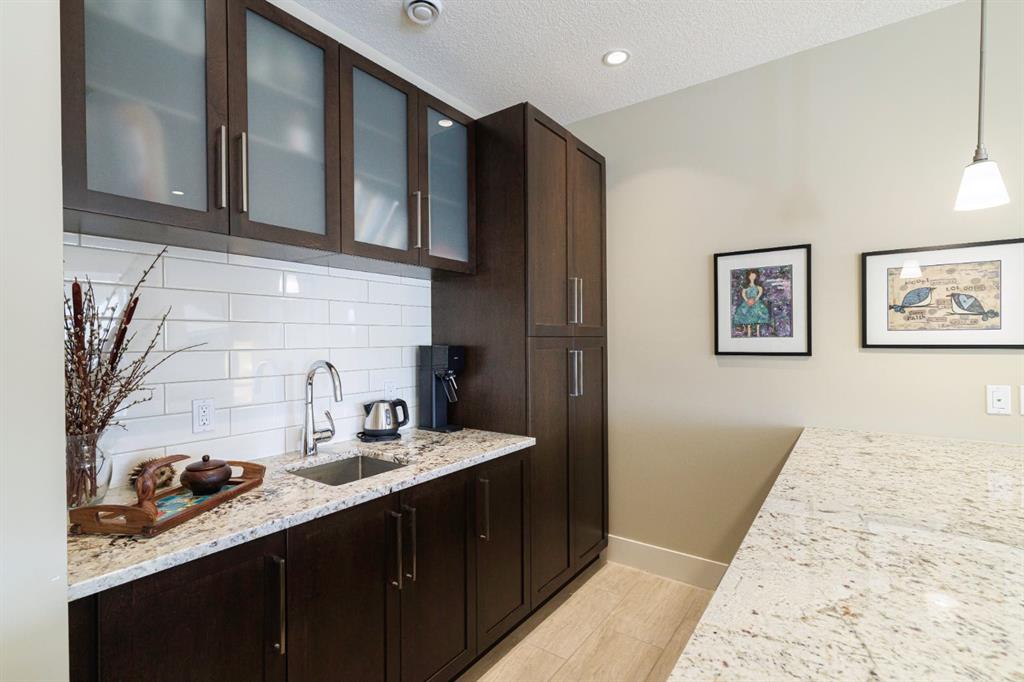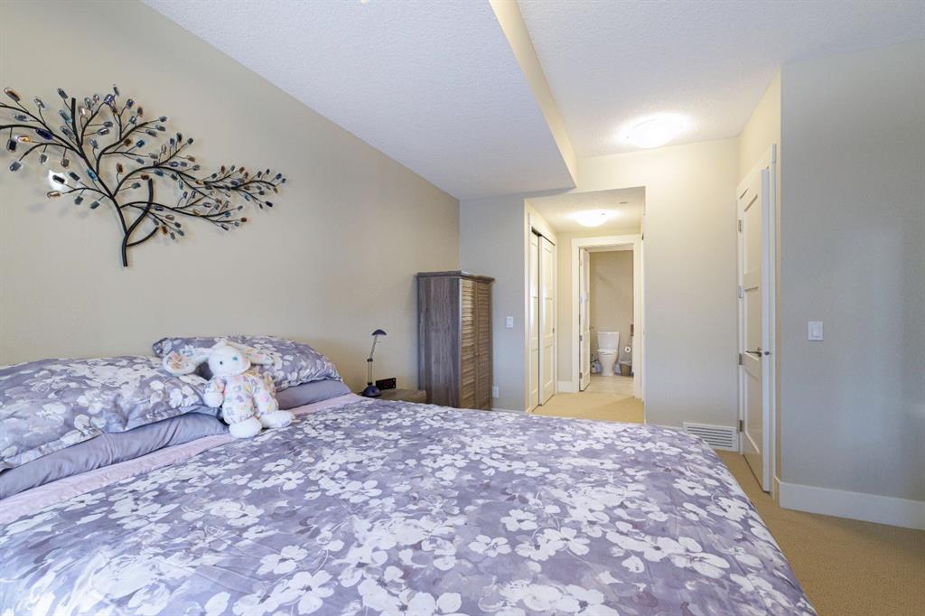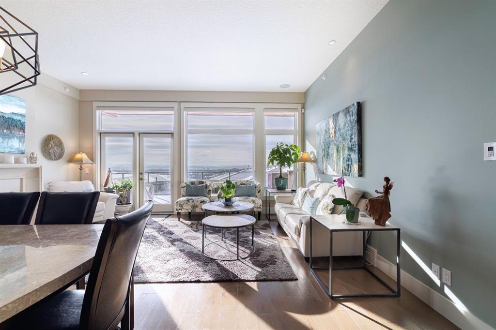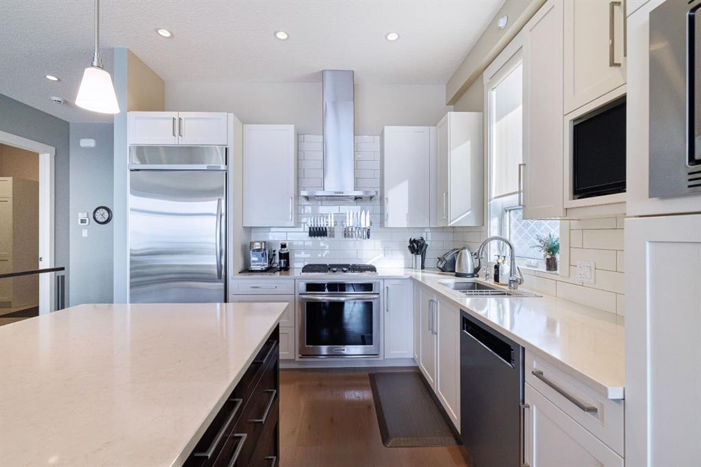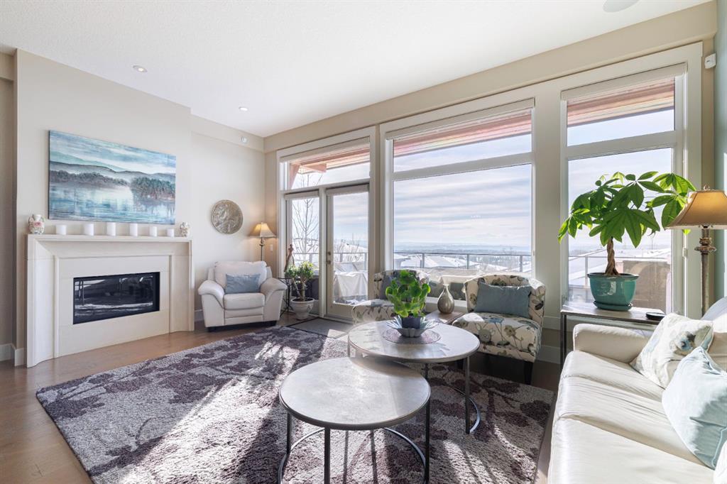 Welcome to this beautifully appointed bungalow villa offering refined comfort, thoughtful upgrades, and breathtaking mountain views with over 2300 sqft of living space! From the moment you step inside, you are greeted by soaring 10-foot ceilings and rich hardwood flooring throughout the main level, creating a bright and inviting atmosphere. The home is enhanced with air conditioning, a water softener, central vacuum system, an epoxy-finished garage floor, solid core doors throughout, and 4 pairs of in-ceiling speakers which connect to audio systems. The kitchen is designed for both everyday living and entertaining, featuring stainless steel appliances, a large central island, gas stove, and elegant quartz countertops. A timeless subway tile backsplash and filtered water tap add both beauty and practicality. Open to the eating nook and living room, this space flows seamlessly for hosting family and friends. The eating nook is filled with natural light and enjoys open sightlines to both the kitchen and living room. The living room is equally impressive with a gas fireplace and mantle, expansive windows, and direct access to the back deck, where you can relax and take in panoramic mountain views and brilliant sunsets. The primary bedroom retreat is bright and spacious with desirable west-facing windows. A custom walk-in closet with built-in organizers provides excellent storage, while the luxurious 5-piece ensuite offers a private water closet, stand-alone shower, dual vanity, and deep soaking tub—your personal spa-like escape. A well-equipped laundry room adds everyday convenience with a sink, built-in cabinetry, hanging rod, and additional pantry/storage built-ins. A stylish 2-piece powder room completes the main floor for added functionality. Downstairs, the fully developed basement offers exceptional additional living space with brand new carpet throughout. The spacious family room features walkout access to the lower patio, perfect for entertaining or enjoying outdoor living. A stylish wet bar with bar fridge, granite countertops, and built-in cabinetry makes this level ideal for gatherings. Two generously sized bedrooms are complemented by a 4-piece bathroom with dual vanity and stand-alone shower, providing comfort and privacy for guests or family members. This thoughtfully designed bungalow villa blends elegance, functionality, and stunning views—offering low-maintenance living without compromise. An exceptional opportunity to enjoy single-level luxury in a truly scenic setting.