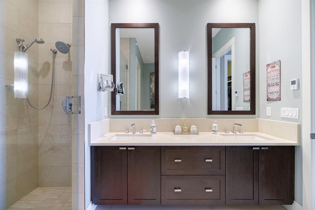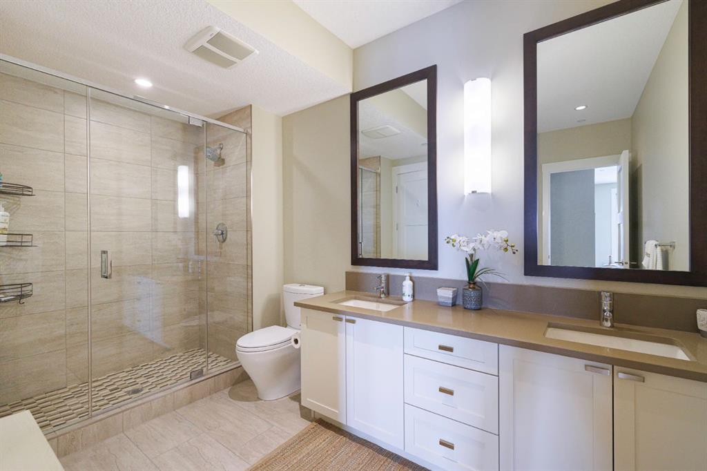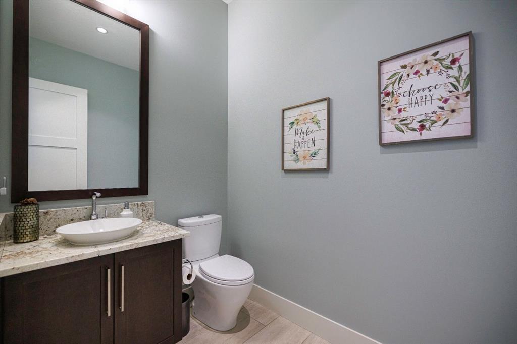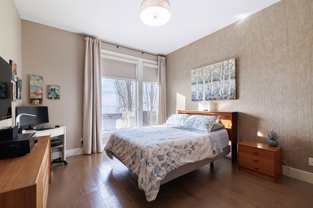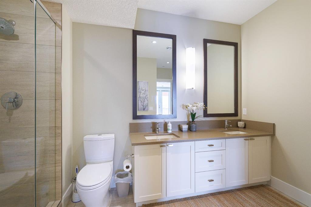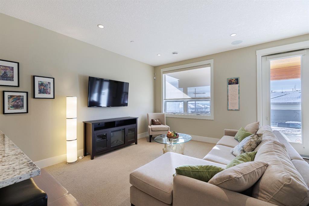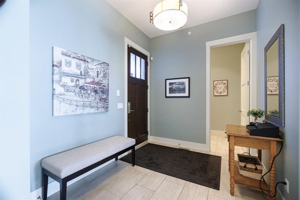 Welcome to this beautifully appointed bungalow villa offering refined comfort, thoughtful upgrades, and breathtaking mountain views with over 2300 sqft of living space! From the moment you step inside, you are greeted by soaring 10-foot ceilings and rich hardwood flooring throughout the main level, creating a bright and inviting atmosphere. The home is enhanced with air conditioning, a water softener, central vacuum system, an epoxy-finished garage floor, solid core doors throughout, and 4 pairs of in-ceiling speakers which connect to audio systems. The kitchen is designed for both everyday living and entertaining, featuring stainless steel appliances, a large central island, gas stove, and elegant quartz countertops. A timeless subway tile backsplash and filtered water tap add both beauty and practicality. Open to the eating nook and living room, this space flows seamlessly for hosting family and friends. The eating nook is filled with natural light and enjoys open sightlines to both the kitchen and living room. The living room is equally impressive with a gas fireplace and mantle, expansive windows, and direct access to the back deck, where you can relax and take in panoramic mountain views and brilliant sunsets. The primary bedroom retreat is bright and spacious with desirable west-facing windows. A custom walk-in closet with built-in organizers provides excellent storage, while the luxurious 5-piece ensuite offers a private water closet, stand-alone shower, dual vanity, and deep soaking tub—your personal spa-like escape. A well-equipped laundry room adds everyday convenience with a sink, built-in cabinetry, hanging rod, and additional pantry/storage built-ins. A stylish 2-piece powder room completes the main floor for added functionality. Downstairs, the fully developed basement offers exceptional additional living space with brand new carpet throughout. The spacious family room features walkout access to the lower patio, perfect for entertaining or enjoying outdoor living. A stylish wet bar with bar fridge, granite countertops, and built-in cabinetry makes this level ideal for gatherings. Two generously sized bedrooms are complemented by a 4-piece bathroom with dual vanity and stand-alone shower, providing comfort and privacy for guests or family members. This thoughtfully designed bungalow villa blends elegance, functionality, and stunning views—offering low-maintenance living without compromise. An exceptional opportunity to enjoy single-level luxury in a truly scenic setting.