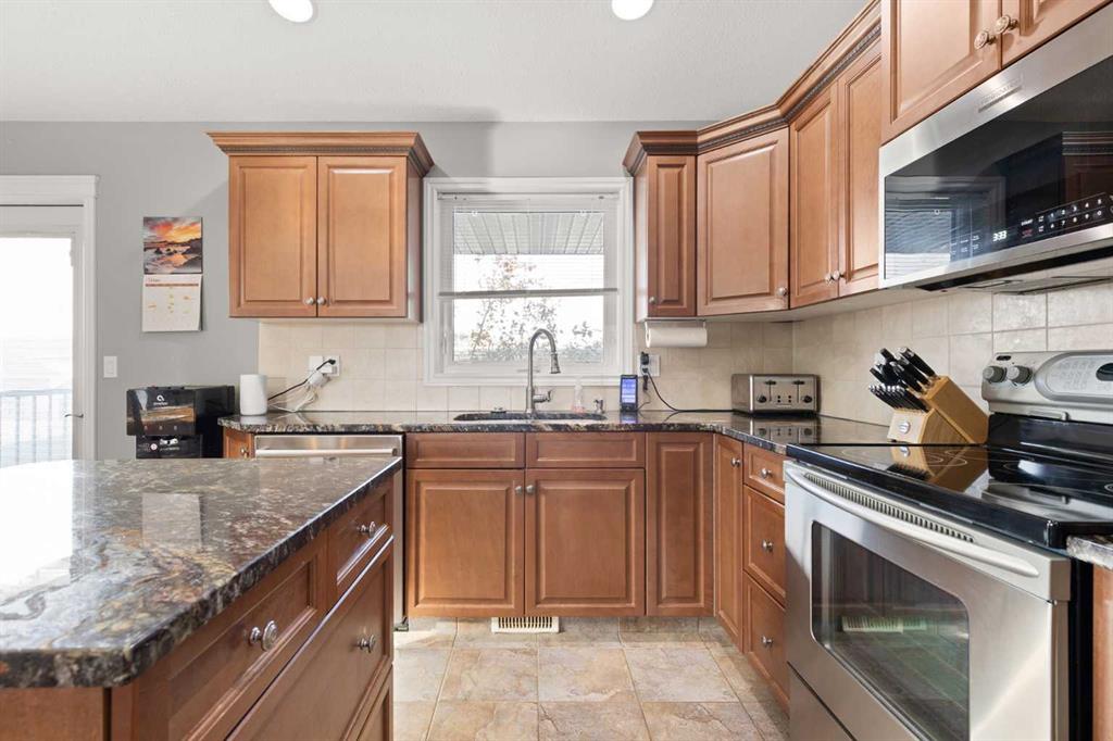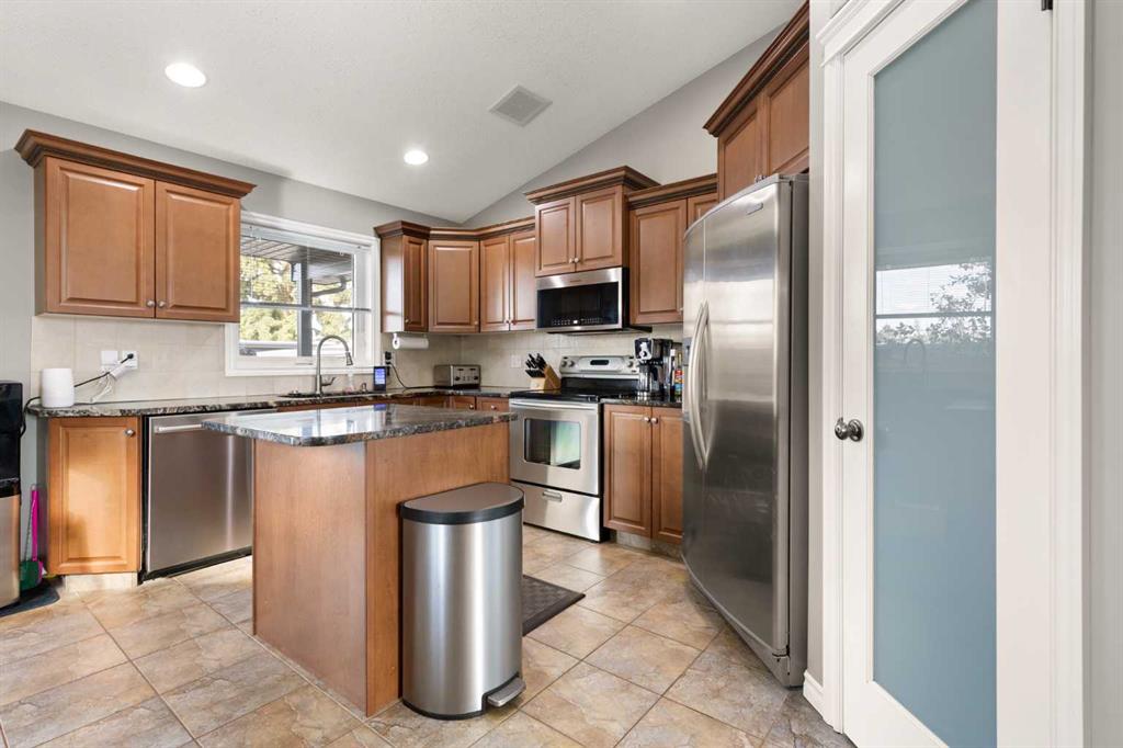 This beautifully designed 1,400 sq. ft. bi-level, built by Serenity Homes, sits on a quiet cul-de-sac and offers an impressive blend of quality, functionality, and modern comfort. Step inside and be greeted by vaulted ceilings and a bright, open layout. The kitchen showcases granite countertops, maple cabinetry, tiled backsplash, corner pantry, and a large island overlooking the dining area. The living room features a cozy gas fireplace, while the primary suite includes deck access, a 4-piece ensuite with double sinks, shower, and walk-in closet. Two additional bedrooms, main-floor laundry, and a second 4-piece bathroom complete the upper level - a highly popular layout for families that balances comfort and convenience. The professionally developed basement (2019) is perfect for growing families - featuring a massive family room, two spacious bedrooms, and a full 4-piece bathroom. Large windows flood the space with natural light, creating a warm and inviting atmosphere ideal for entertaining or relaxing. Outside, enjoy the fully fenced and landscaped yard with underground sprinklers front and back (including the garden), a maintenance-free covered deck, patio with firepit area (blocks for fireplace are stored under deck), and hot tub. The 23 × 24 attached garage is insulated, plumbed for heat, and paved triple car driveway out front! Oversized RV parking is available in the backyard OR there's a smaller area in the front driveway that could be utilized. Even better - the thermostat, door locks, and garage doors can all be controlled remotely via app, offering convenience and peace of mind. Recent updates include shingles replaced in 2021, paved driveway, adding to the home’s already strong pride of ownership. Perfectly located across from a walking path with river/coulee views, this property delivers space, serenity, and smart living - all in one incredible Redcliff location.