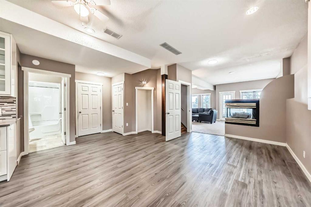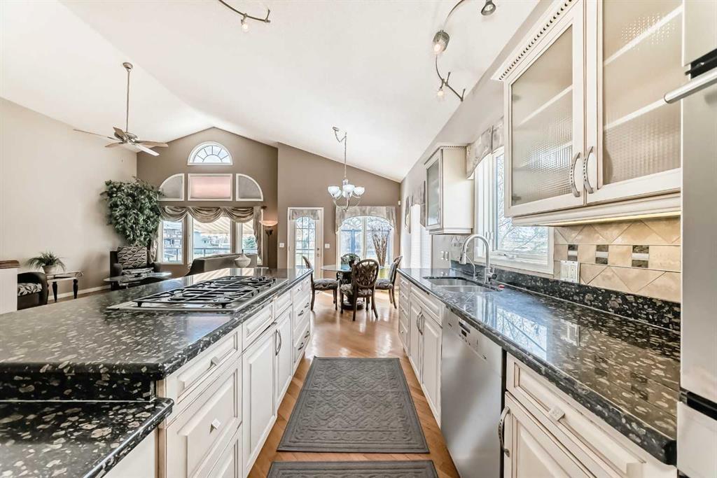 OPEN HS SAT & SUN MAY 1&2 1-3PM. Boasting 2,832 sq ft of developed living space, this executive walk-out bungalow includes a spacious mother-in-law suite (illegal) and backs onto Hole 1 of the golf course with spectacular views. The main level offers vaulted ceilings and an open-concept layout anchored by an updated gourmet kitchen featuring abundant cabinetry, high-end stainless steel appliances, and granite countertops. The kitchen flows into the living room, highlighted by cathedral windows and a gas fireplace. The dinette steps out to an extended balcony—perfect for soaking in the beautiful golf course views. The generous primary bedroom also enjoys direct balcony access and is complemented by a large 4- piece ensuite with heated ceramic tile floors, a jetted soaker tub, and a separate shower. A formal dining room, den/study, 2-piece bath, and a laundry/mudroom complete the main level, with convenient access to the fully finished, oversized garage. Downstairs, the bright walk-out level features large windows and impressive views of its own. You’ll find a spacious family room with a three-sided fireplace, plus a den/bedroom, and access to a large patio. An unbelievably large kitchen/dining area offers plenty of cupboards, quartz countertops, stainless steel appliances, and a large pantry. This level also includes a 4-piece bath, a mechanical room with a second laundry area, and a third bedroom with a 3-piece ensuite. on an oversized lot in a quiet cul-de-sac, this home offers an outstanding location and incredible potential. With your ideas and a little polishing, this property could be the crown jewel of the cul-de-sac.