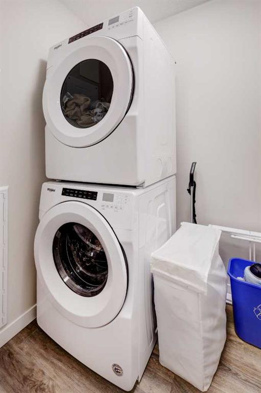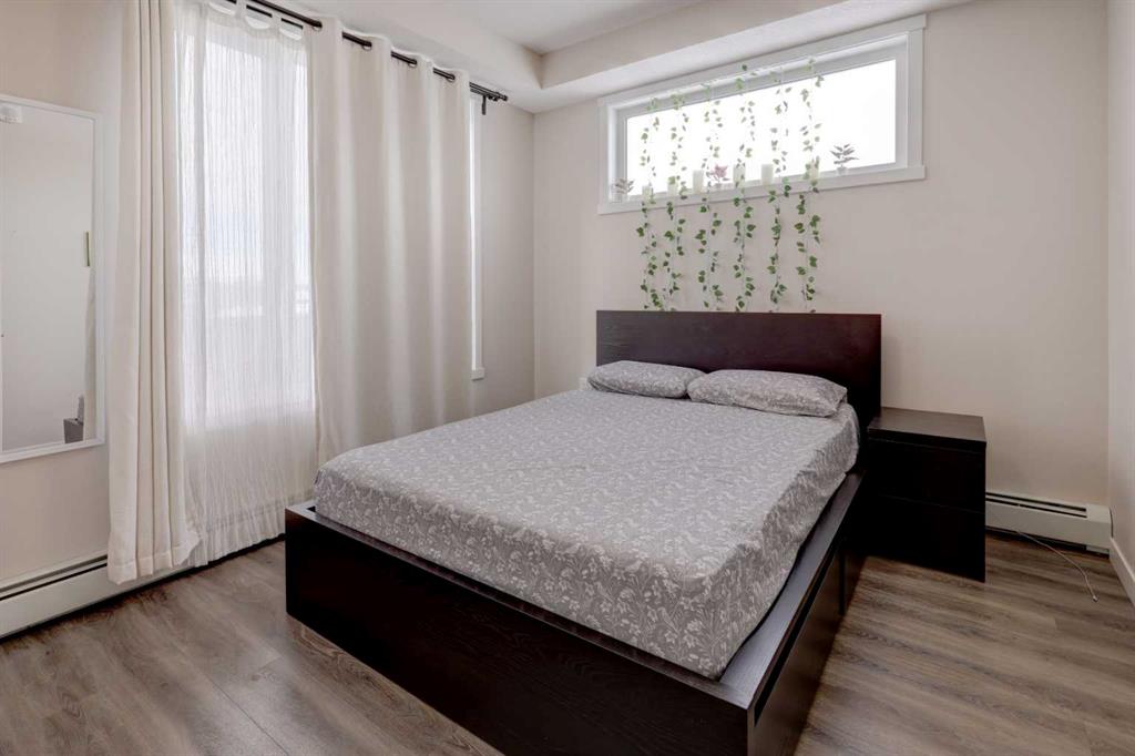 Fantastic 2 bedrooms, 2 bathrooms corner top floor unit ideally located just one block from the Fish Creek LRT station. This bright and spacious 785 sqft home is steps from neighbourhood parks and local amenities, with quick access to dining, shopping, and everyday conveniences—perfect for professionals or empty-nesters. The thoughtfully designed open-concept layout features quartz countertops and tile backsplashes in both the kitchen and bathrooms, stainless steel appliances, and a separate laundry room with stacked washer and dryer. Large rooms, LVP flooring throughout, and abundant storage enhance everyday comfort. Enjoy the private balcony complete with a BBQ gas line and expansive north and west views, including glimpses of downtown and beautiful sunset skies. With no units above, this top-floor residence provides exceptional quiet without the penthouse price. The unit also includes a titled underground parking stall and a separate titled storage locker for added value and convenience.