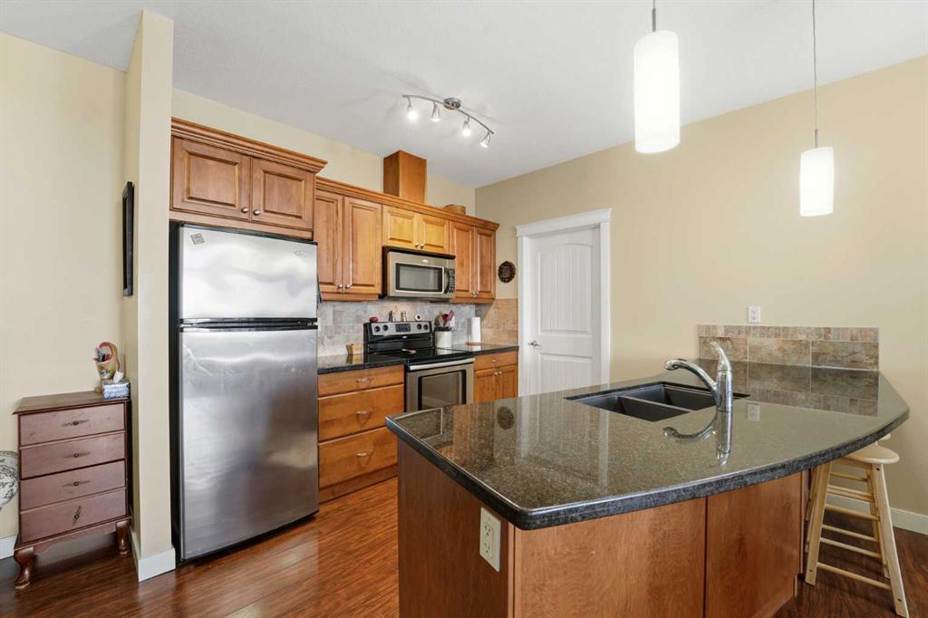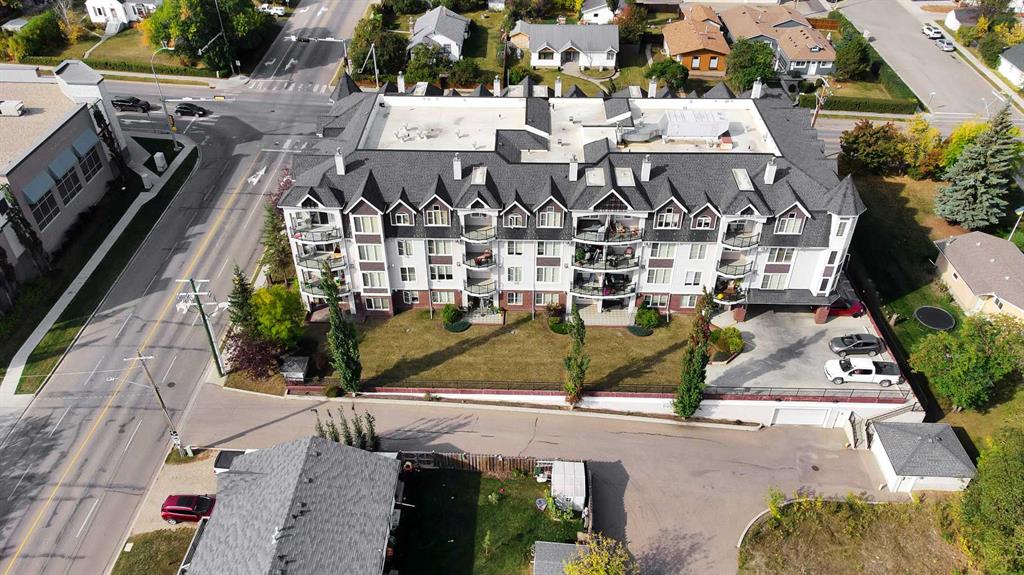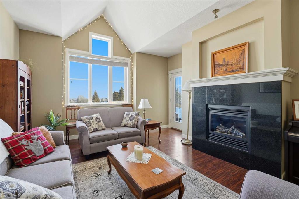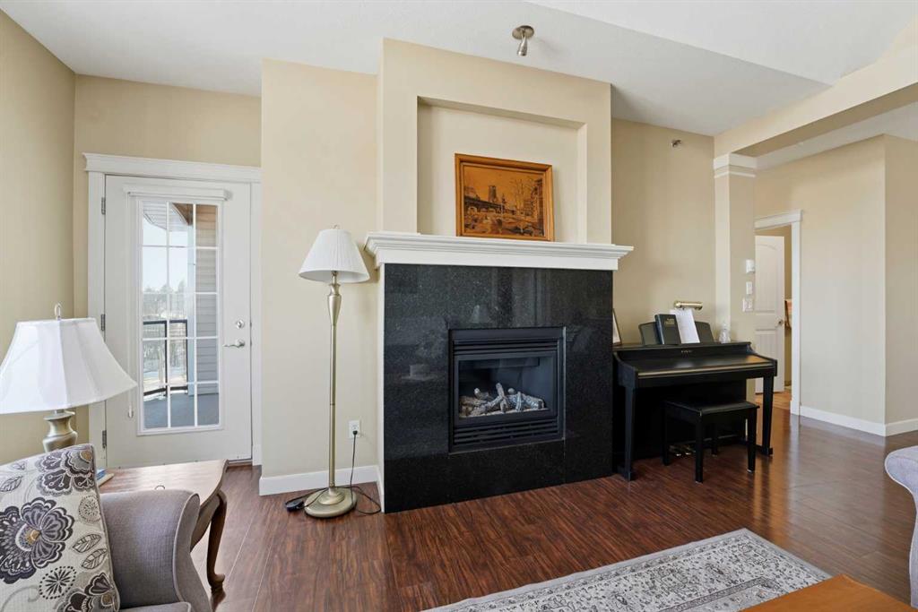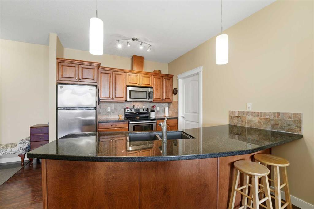 Experience the ultimate lakeside lifestyle in this sprawling 1,155 sq. ft. corner suite at The Watermark, one of the largest and most sought-after floor plans in the building. Perfectly positioned on the quiet northeast side of this upscale complex, this 2-bedroom, 2-bathroom residence offers a sophisticated blend of comfort and convenience in the heart of Sylvan Lake. The bright, open-concept interior is anchored by a gourmet kitchen featuring granite countertops, an eating bar, and newer stainless steel appliances, while the inviting living room boasts a cozy gas fireplace for chilly evenings. The primary retreat includes a spa-like ensuite with a large soaker tub, providing a private sanctuary after a day on the water. Functional perks abound, including in-suite laundry with extra space for a pantry or freezer, one titled heated parking stall, and condo fees that include heat. Located just blocks from the Lakeshore Drive Promenade, you are steps away from summer boating, swimming, and lakeside dining, as well as winter skating and ice fishing. Whether you are seeking a turnkey year-round residence or a high-end vacation getaway, this beautifully maintained condo delivers the very best of downtown living near the lake.