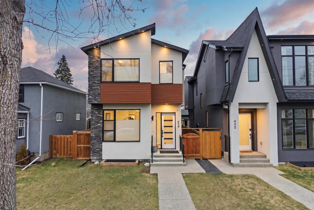 Welcome to 420 14 Avenue NE, an impeccably designed detached infill located on a quiet, tree-lined street in the heart of Renfrew, one of Calgary’s most sought-after inner-city communities. Boasting 3,100 sqft of luxuriously finished living space, this beautifully appointed 4 bedroom, 3.5 bathroom home combines elegant finishes with functional family-friendly design. The main floor features soaring 10’ ceilings, engineered hardwood flooring, custom lighting, and an open-concept layout ideal for entertaining. The chef-inspired kitchen is the centerpiece, complete with quartz countertops, a large island with eating bar, stainless steel appliances, walk-in pantry, and built-in buffet. A spacious living room showcases a floor-to-ceiling tile fireplace flanked by custom built-ins, and a formal dining area and tech center make daily life seamless. As you head upstairs you’ll immediately notice the high vaulted ceilings, 8ft doors, and abundance of natural light. The primary bedroom feels less like a bedroom and more like a retreat. It is a true sanctuary, easily accommodating a king-sized bed and nightstands, plus a separate sitting area, recessed lighted ceiling, large walk-in closet with built-ins, and a spa-style 5-piece ensuite with dual sinks, jetted tub, and oversized 10mm glass shower (roughed-in for steam). Two additional bedrooms, an upper laundry room, plus an additional full bath round out the upper level with thoughtful efficiency. The fully developed basement offers 9’ ceilings, a sprawling media/rec room with custom home theatre set up, wet bar, fourth bedroom, and a stylish 3-piece bathroom. The separate side entrance and wet bar layout create a fantastic opportunity for a future legal suite (subject to City approvals). Additional features include central air conditioning, glass-paneled staircase with wood accents, designer fixtures, built-in storage, and a double detached garage. Outside, the private backyard with deck offers a perfect spot to unwind. Situated just minutes to downtown Calgary and walking distance to Munro Park, Renfrew Athletic Park, top schools and beloved local gems like Boogie’s Burgers and Peter’s Drive-In. This is the perfect blend of upscale inner-city living and family comfort.