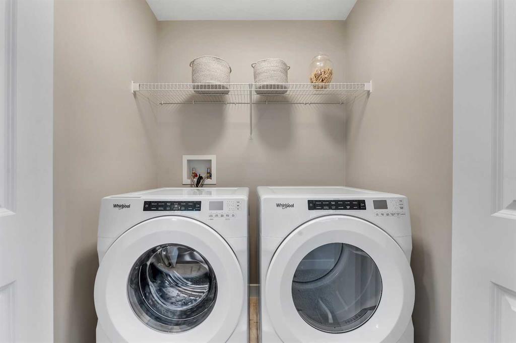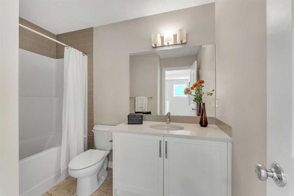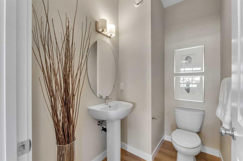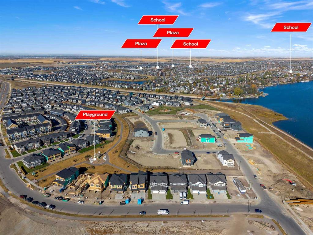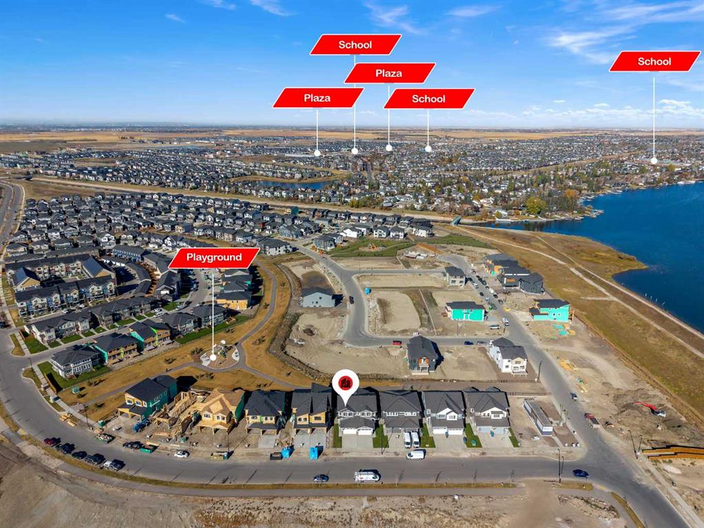 Stylish, steps to the lake, and ready for you to call home! Welcome to this beautifully appointed, 1700 sq ft brand-new Alliston at Home FRONT-ATTACHED GARGAE duplex, ideally located just steps from Chestermere Lake. Offering a thoughtful and functional floor plan with gorgeous finishes throughout, featuring 3 bedrooms, 2.5 bathrooms, a SIDE ENTRANCE to the basement and BACKING ONTO A PATHWAY with a LAKE VIEW, what's not to love? Inside, the OPEN CONCEPT kitchen, living room and dining area features wide luxury vinyl plank flooring and airy 9' ceilings, creating a bright and spacious feel. The kitchen will please the chef of the home with quartz countertops, a large island perfect for meal prep and entertaining, classic white 42" cabinets, sleek stainless steel appliances and a dedicated pantry. Triple-pane windows, which are a standard feature at Alliston Homes, flood the space with natural light. A powder room and spacious foyer with a large closet off the double attached garage complete the main level. Step outside to the sunny backyard, complete with a deck equipped with a gas line for BBQs, and enjoy lake views year-round. Whether swimming in the summer or skating in the winter, this location is all about connection to the outdoors. The spacious yard offers ample space for children or pets to play. Upstairs, the primary suite is a comfortable retreat, featuring a large walk-in closet and a spa-inspired en-suite with his and hers sinks and a spacious walk-in shower. Two additional bedrooms and a convenient laundry room complete the 2nd level. The unfinished basement with 9-FOOT CEILINGS and a side entrance offers endless potential for FUTURE DEVELOPMENT and EQUITY-BUILDING ideas. This property is turnkey, complete with front and back landscaping and is close to schools, shopping and access to the Calgary.