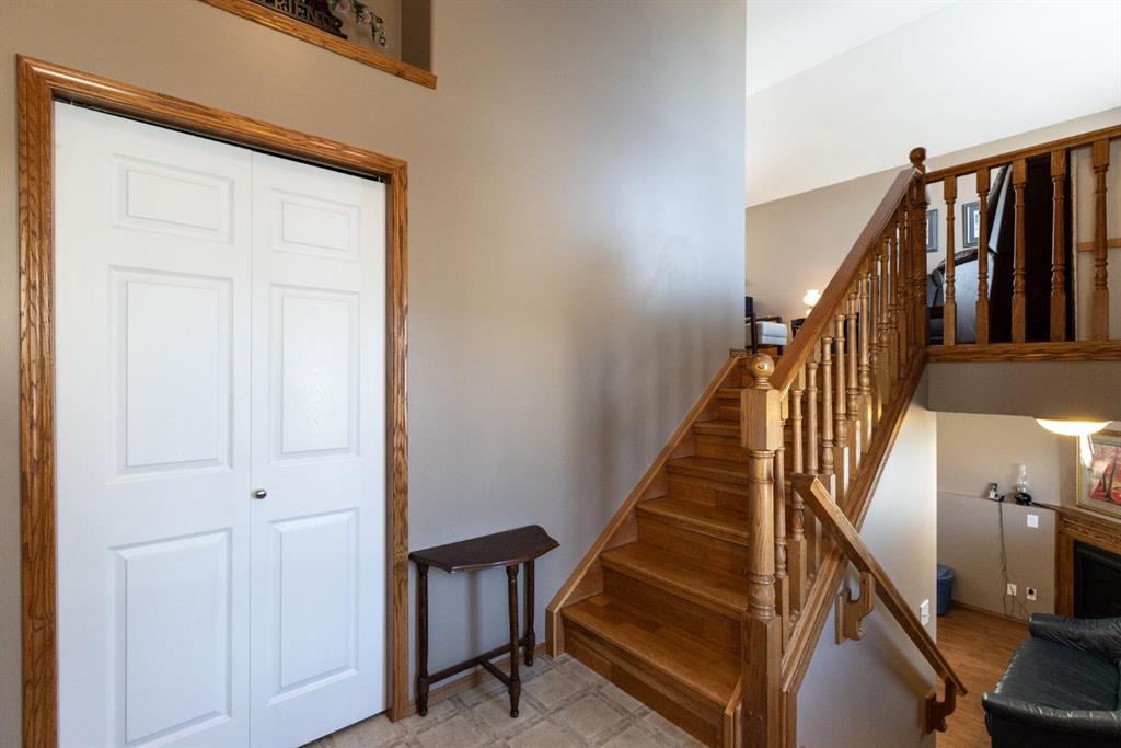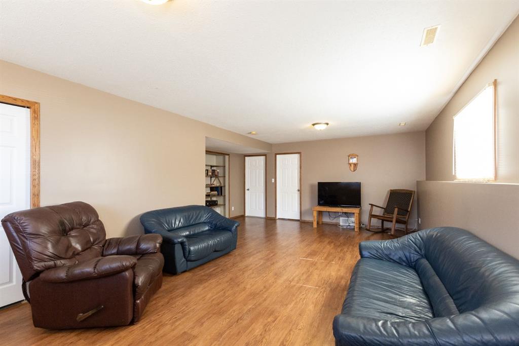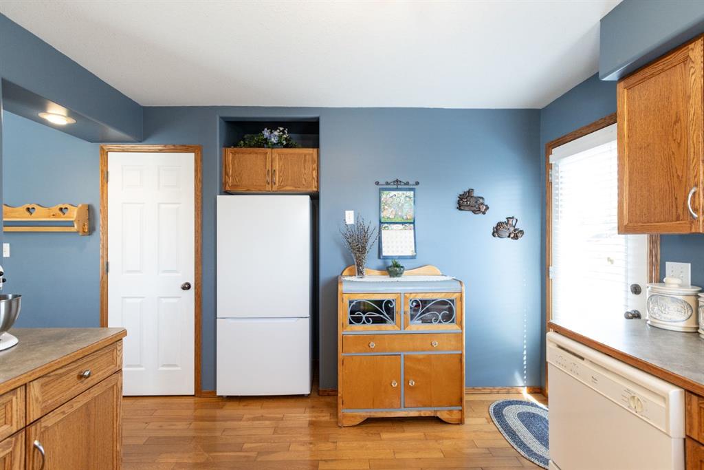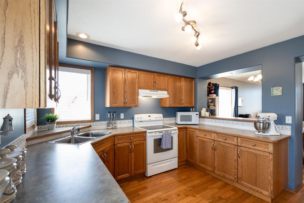 Tucked into a quiet location on the corner of an alley, this original owner, custom-built home offers extra space, privacy, and a layout designed for everyday living. Fully finished from top to bottom, this 4 bedroom, 2 bathroom home is perfectly situated within walking distance to schools, walking trails, the pool, and more—making it an ideal fit for families or anyone who values convenience and community. Step inside to a spacious entryway that welcomes you with an abundance of natural light and a bright, open feel. The main floor showcases beautiful hardwood throughout, highlighted by vaulted ceilings that enhance the airy, open-concept design. The kitchen is both functional and inviting, featuring ample cabinetry, generous counter space, a corner sink, pantry, and an eat-up area—perfect for casual meals or gathering with friends and family. Just off the kitchen, step onto the east-facing back deck where you can enjoy your morning coffee in the sun and relax in the shade during the afternoon. The dining and living areas flow seamlessly together, creating a warm and comfortable space for entertaining or everyday living. The primary bedroom offers plenty of room for a larger bed and additional furniture, while a second main-floor bedroom and a well-appointed 4-piece bathroom complete this level. Downstairs, the fully developed basement provides even more space with a large family room, Corner Fireplace, 2 additional generous bedrooms, a laundry room, and plenty of storage. Outside, you’ll appreciate the private backyard that backs onto a berm—meaning no rear neighbours. The yard is fully fenced and includes a shed, under-deck storage, and a parking pad with room for vehicles or the potential to build your future garage. New in Shingles (2021) New Fridge (2025) New Washer (2026) This is a well-cared-for home in a fantastic location, offering space, functionality, and a lifestyle you’ll love.