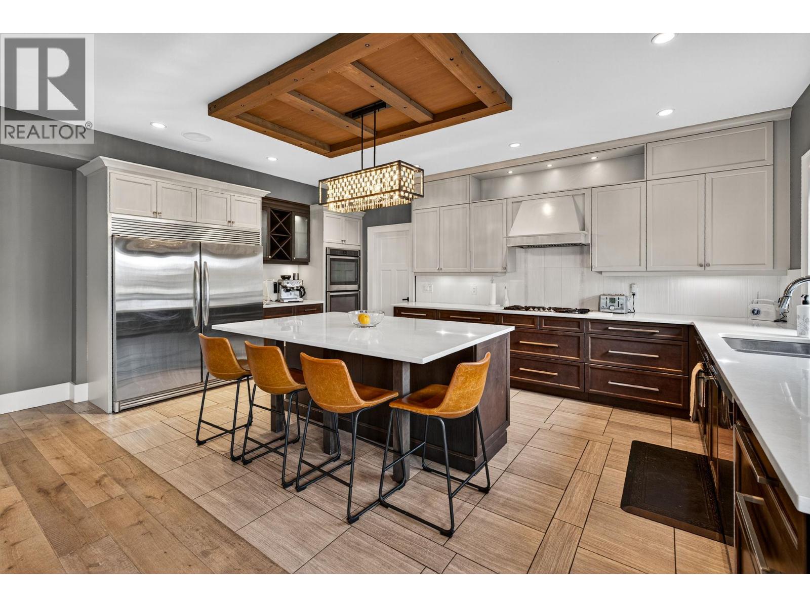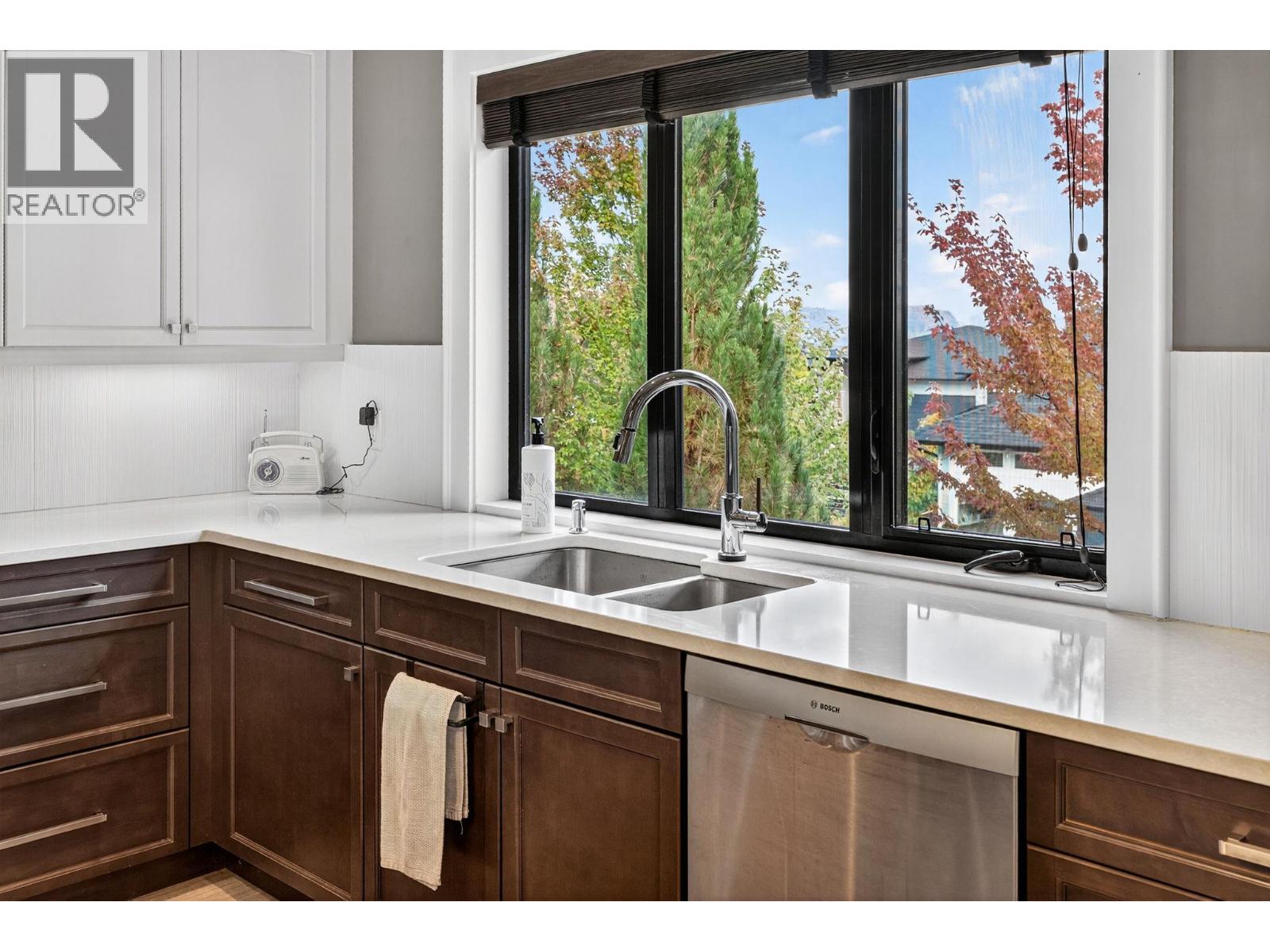 Ideally situated on a quiet, dead-end street in one of Kettle Valley’s most sought-after neighbourhoods, this exceptional residence exemplifies premium family living. Occupying a landscaped corner lot, the property features expansive lake and mountain views and is conveniently located across from walking and hiking trails. The interior offers both functionality and elegance, with a double-sided fireplace that unites the main floor living and dining areas in a welcoming atmosphere. Hardwood flooring extends throughout the main level, complemented by plush carpeting in the bedrooms. The contemporary two-tone kitchen is equipped with stainless steel appliances, a spacious walk-in pantry, and modern cabinetry for optimal utility and style. A dedicated office with a private entrance provides an excellent opportunity for a home-based business. The upper level boasts three well-designed bedrooms, including a primary suite with impressive lake views, a walk-in closet, and a spa-inspired ensuite. Everyday convenience is enhanced by a walk-through laundry room connected directly to the primary suite. On the lower level, a self-contained in-law suite offers versatile accommodations suitable for extended family members, older children, or guests. The heated four-car garage includes an RV hookup and ample space for a large RV or boat, catering to outdoor enthusiasts. This residence is positioned just minutes from schools, parks, shopping, and biking trails.