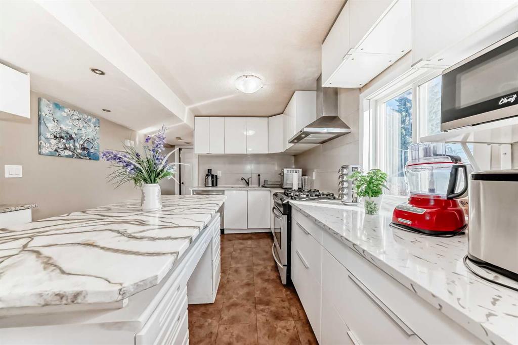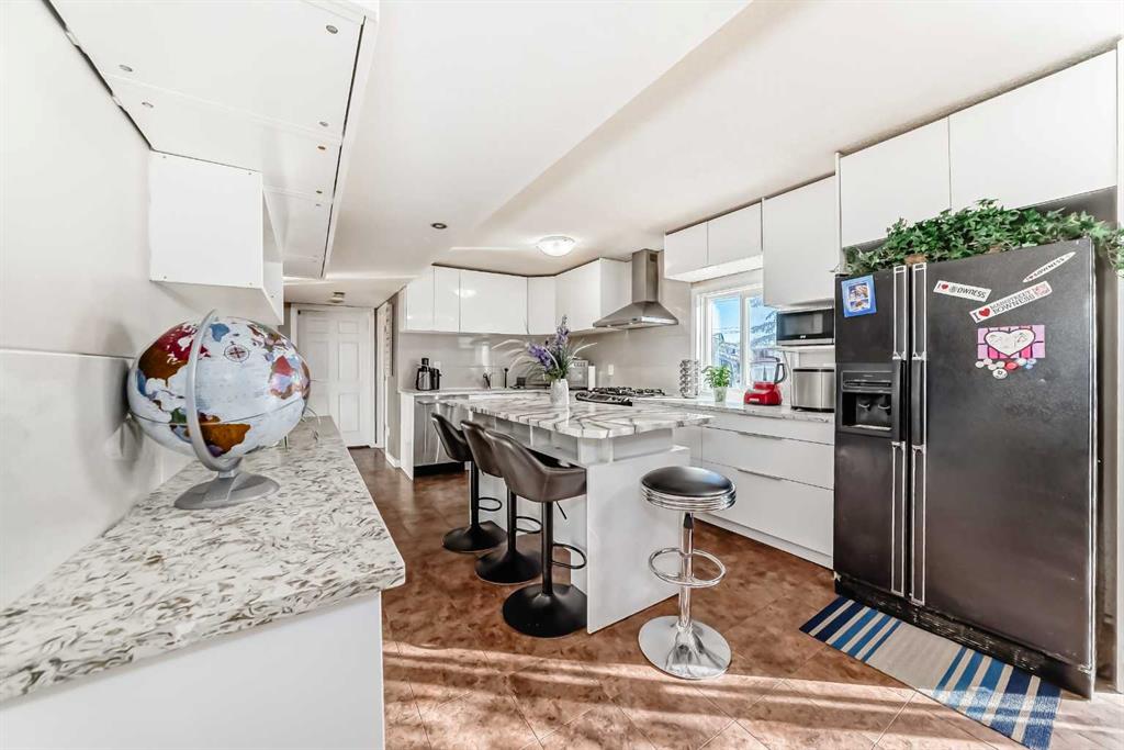 Welcome to West Bowness , rare to find large 2 -storey home situated on a massive 50x124 ft size lot with over 2150 Sq/ft of total living space. Nestled on a quiet street in the heart of West Bowness, this spacious and versatile property presents a rare opportunity for both large families and savvy investors. The home boasts a charming stucco exterior, four entrances and offers beautiful views of Canada Olympic Park (especially during the skiing season). The main floor has a large entrance with an exterior front porch (2015). Step inside and be greeted by a bright, spacious main floor bathed in natural light from west and south facing windows. The updated kitchen (2018) is a true chef's dream, featuring granite countertops, vinyl flooring, a gas range, a large pantry, and new white cabinets + SS appliances. This area flows seamlessly into the main living spaces with updated laminate flooring, providing plenty of room for family gatherings and entertaining. For ultimate convenience, the main floor also includes a full bathroom and laundry facilities (2015). Off the kitchen you have access to a large deck with full exposure to the huge backyard. This home is perfect for a growing family, offering four large bedrooms on the upper level. The generous primary bedroom is a standout, providing a secluded retreat with its own separate second-floor staircase and a massive walk-in closet. Beyond the main living area, the property offers fantastic income potential with an illegal bachelor suite built in 2015. Featuring its own separate side entrance and sidewalk, kitchenette, 4-piece bathroom, and a laundry connection, along with an egress window and new tile flooring. This illegal suite is ideal for extended family or a significant mortgage helper. The huge, private, and fenced yard is an oasis featuring fruit trees and a playground area, while a large front concrete pad leads conveniently to the back. Enjoy your morning coffee on the covered front porch or host a summer BBQ on the rear deck off the kitchen. The Property also includes an oversized (24x24) double garage, perfect for storage and parking. The location can't be beat! You're just steps away from nature with Bowness Park, Canada Olympic Park, Winsport and the home offers incredible access to community amenities all within walking distance to elementary & high schools, transit, and just a few minutes' drive to shopping centres, new Calgary Farmers market, Foothills & Children’s Hospitals, University of Calgary (UofC), Bowness library & eateries and major thoroughfares like Stoney Trail, TransCanada highway to the mountains, and city pathways leading straight to downtown. This is a superb opportunity to own a spacious home with modern updates, incredible appeal, and income potential in a friendly, sought-after neighbourhood. The possibilities are truly endless, whether you're looking for a perfect family home, a rental property, or a fantastic property to hold. Book your showing today!