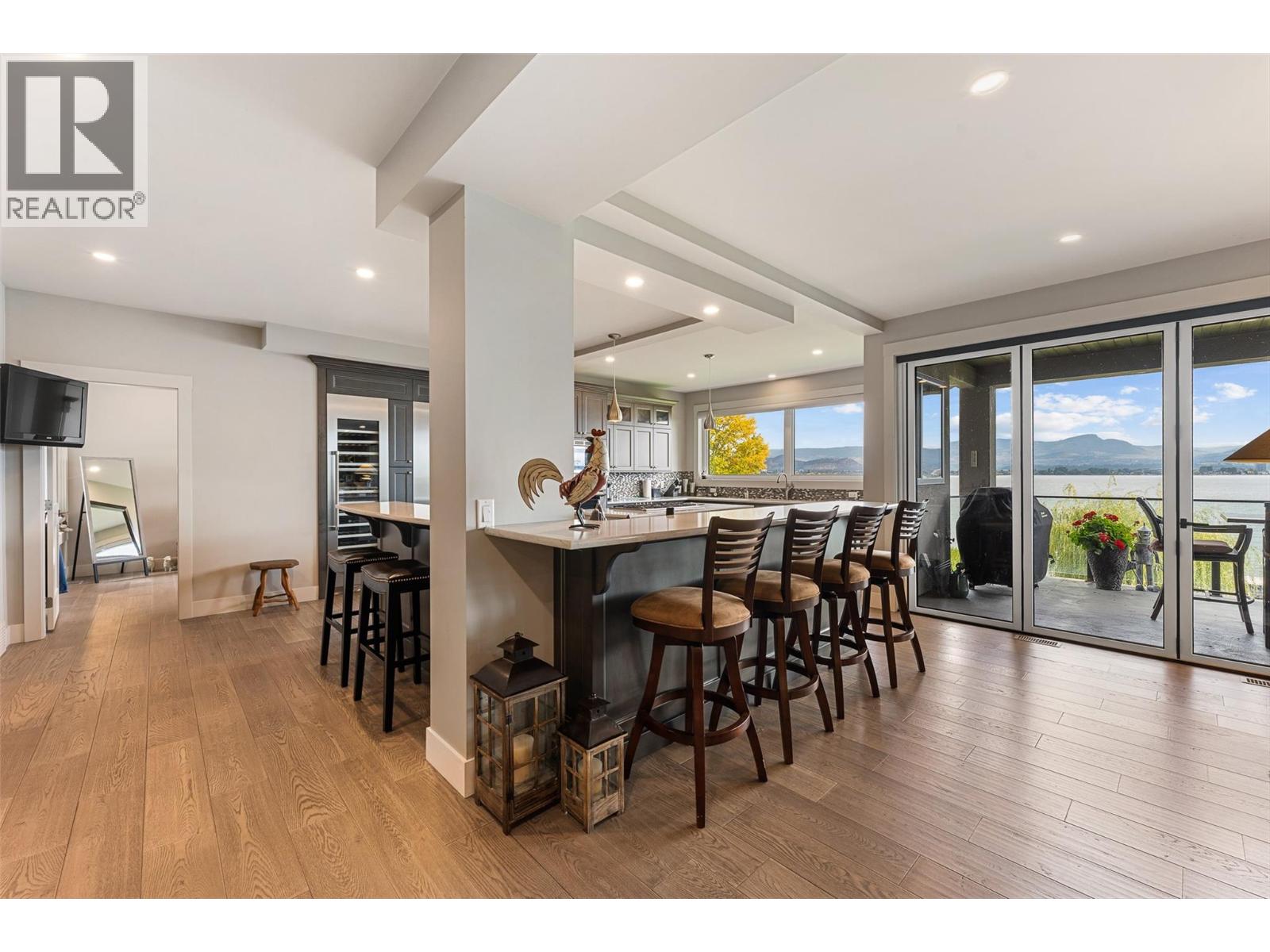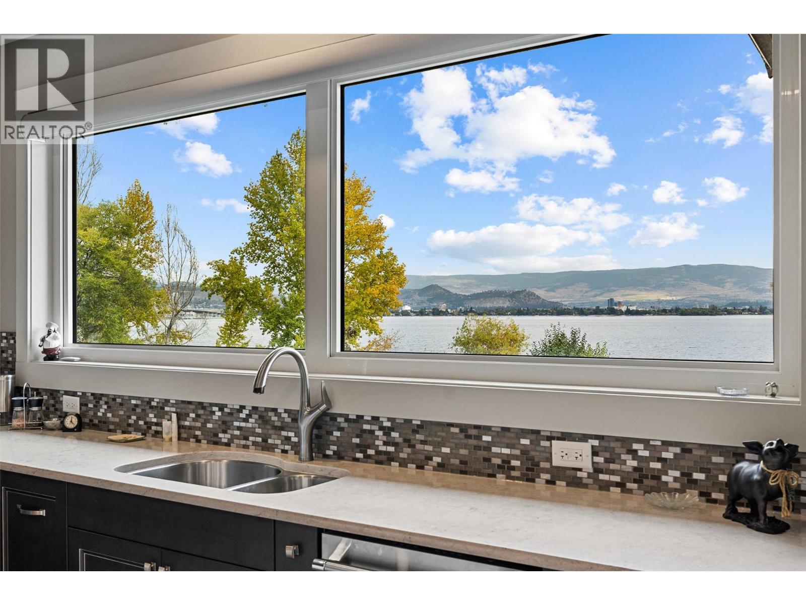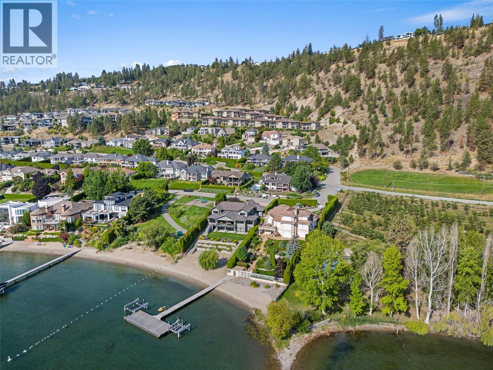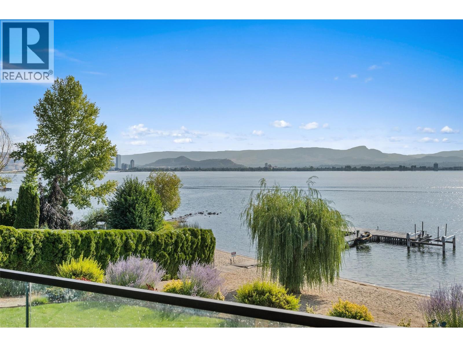 Nestled on a quiet cul de sac in a private waterfront setting, this beautiful customized residence offers a rare opportunity to experience tranquil living on the shores of Okanagan Lake. Surrounded by mature gently sloping grounds, the home blends refined design with a relaxed, resort-inspired lifestyle. Panoramic city and lake view and just minutes into town! A grand foyer with soaring ceilings, skylights and a graceful curved staircase welcomes you inside. The main living area unfolds beneath expansive windows and wall-to-wall Nano doors that open to the covered lakeside deck, creating seamless indoor-outdoor living just steps from the water. At the heart of the home, the chef’s kitchen featuring two islands, including a large L-shaped island with seating for seven, stone countertops, premium Thermador appliances and an oversized walk-in pantry. The primary retreat offers deck access, a custom walk-in closet and a spa-inspired ensuite with heated floors, a freestanding soaker tub and a fully tiled walk-in shower. Additional bedrooms on the upper level provide privacy for family and guests, including a second primary-style suite. The lower level is designed for relaxation with a spacious rec room, temp-controlled wine room, guest suite and walk-out access to the covered patio and backyard. All levels with elevator access! Outside, tiered landscaping leads to a sandy beach and a dock with boat and Seadoo lifts. Heated triple garage and generous driveway parking.