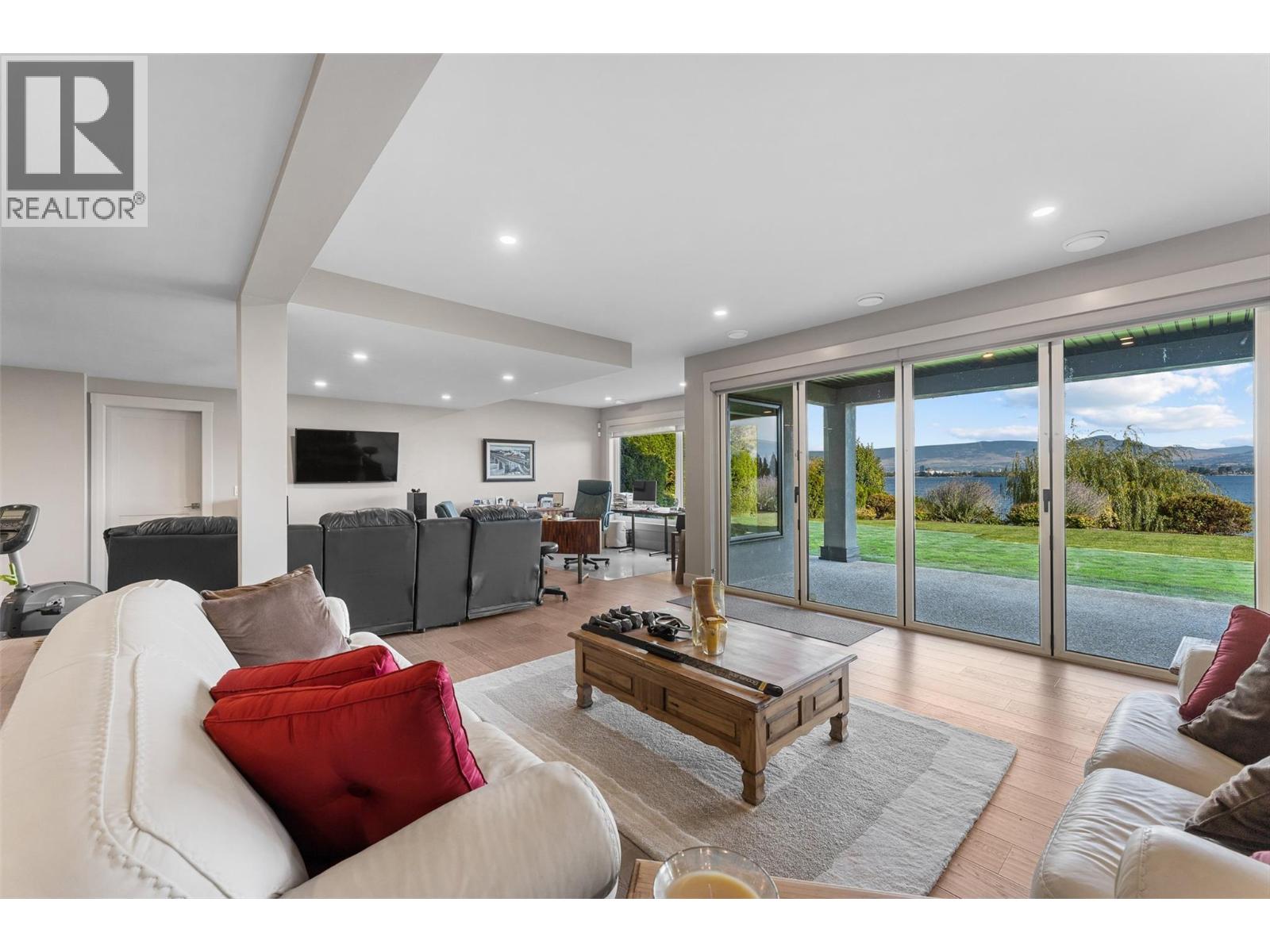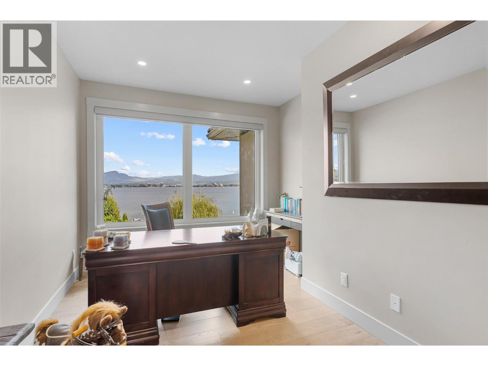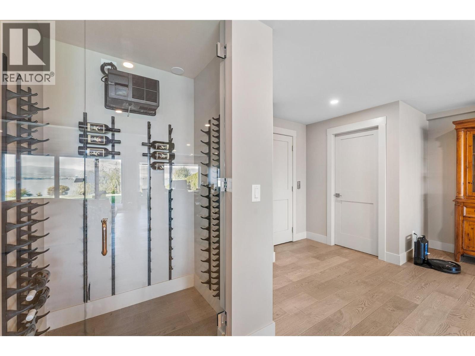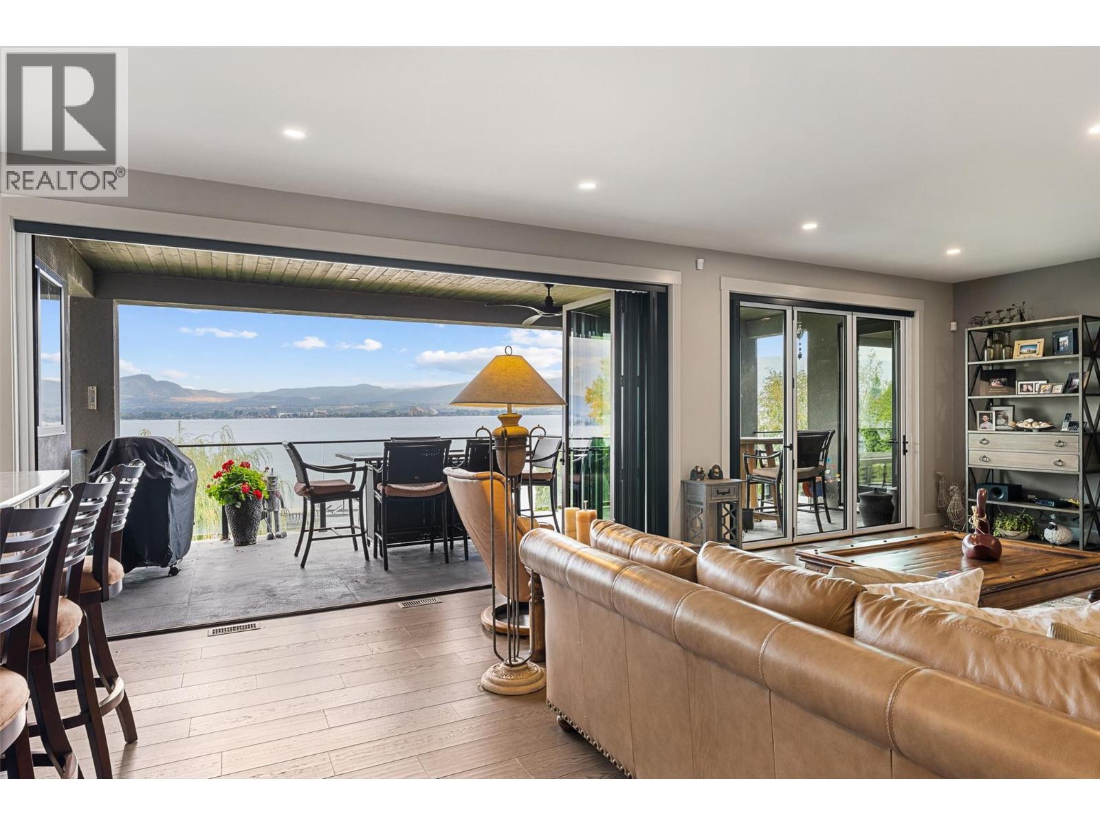 Nestled on a quiet cul de sac in a private waterfront setting, this beautiful customized residence offers a rare opportunity to experience tranquil living on the shores of Okanagan Lake. Surrounded by mature gently sloping grounds, the home blends refined design with a relaxed, resort-inspired lifestyle. Panoramic city and lake view and just minutes into town! A grand foyer with soaring ceilings, skylights and a graceful curved staircase welcomes you inside. The main living area unfolds beneath expansive windows and wall-to-wall Nano doors that open to the covered lakeside deck, creating seamless indoor-outdoor living just steps from the water. At the heart of the home, the chef’s kitchen featuring two islands, including a large L-shaped island with seating for seven, stone countertops, premium Thermador appliances and an oversized walk-in pantry. The primary retreat offers deck access, a custom walk-in closet and a spa-inspired ensuite with heated floors, a freestanding soaker tub and a fully tiled walk-in shower. Additional bedrooms on the upper level provide privacy for family and guests, including a second primary-style suite. The lower level is designed for relaxation with a spacious rec room, temp-controlled wine room, guest suite and walk-out access to the covered patio and backyard. All levels with elevator access! Outside, tiered landscaping leads to a sandy beach and a dock with boat and Seadoo lifts. Heated triple garage and generous driveway parking.