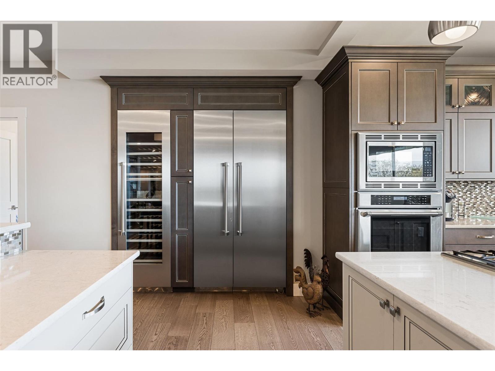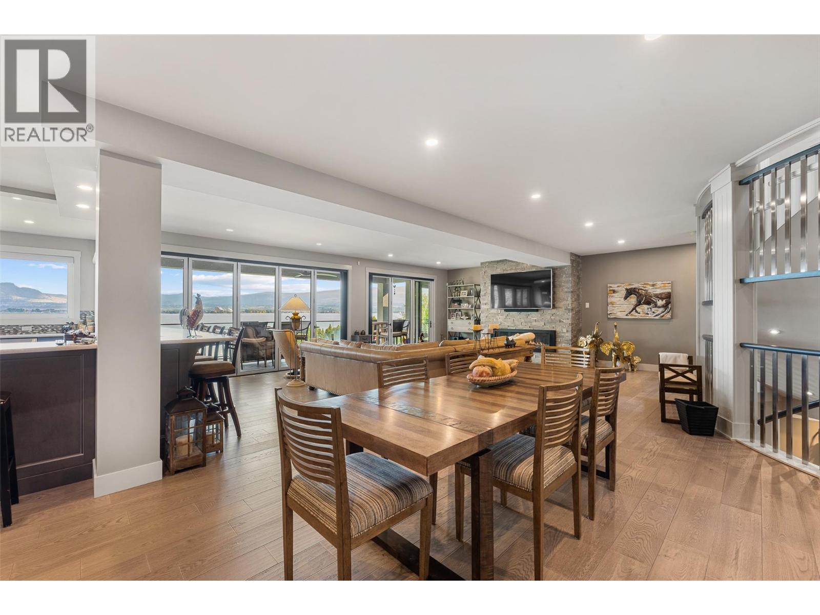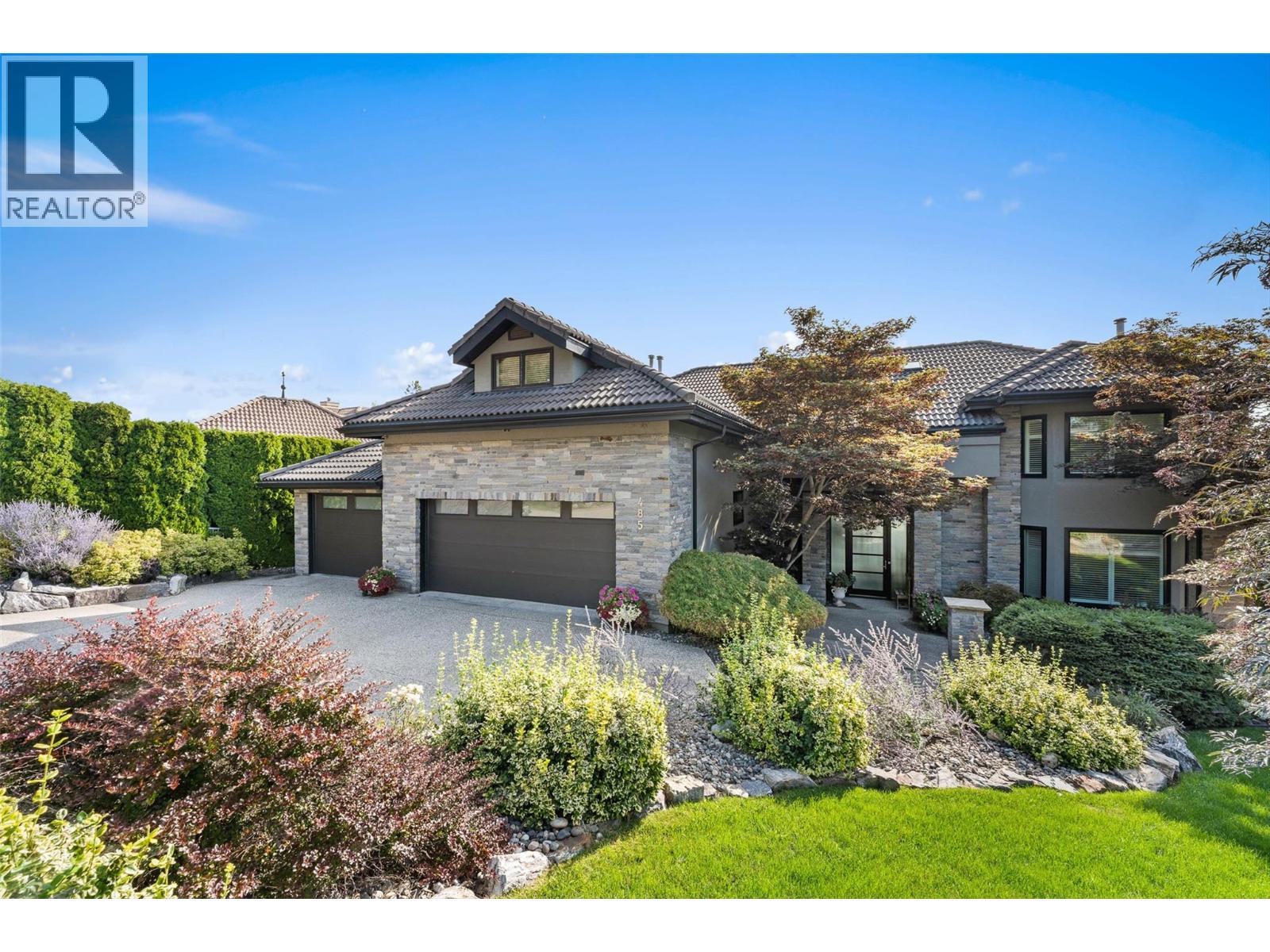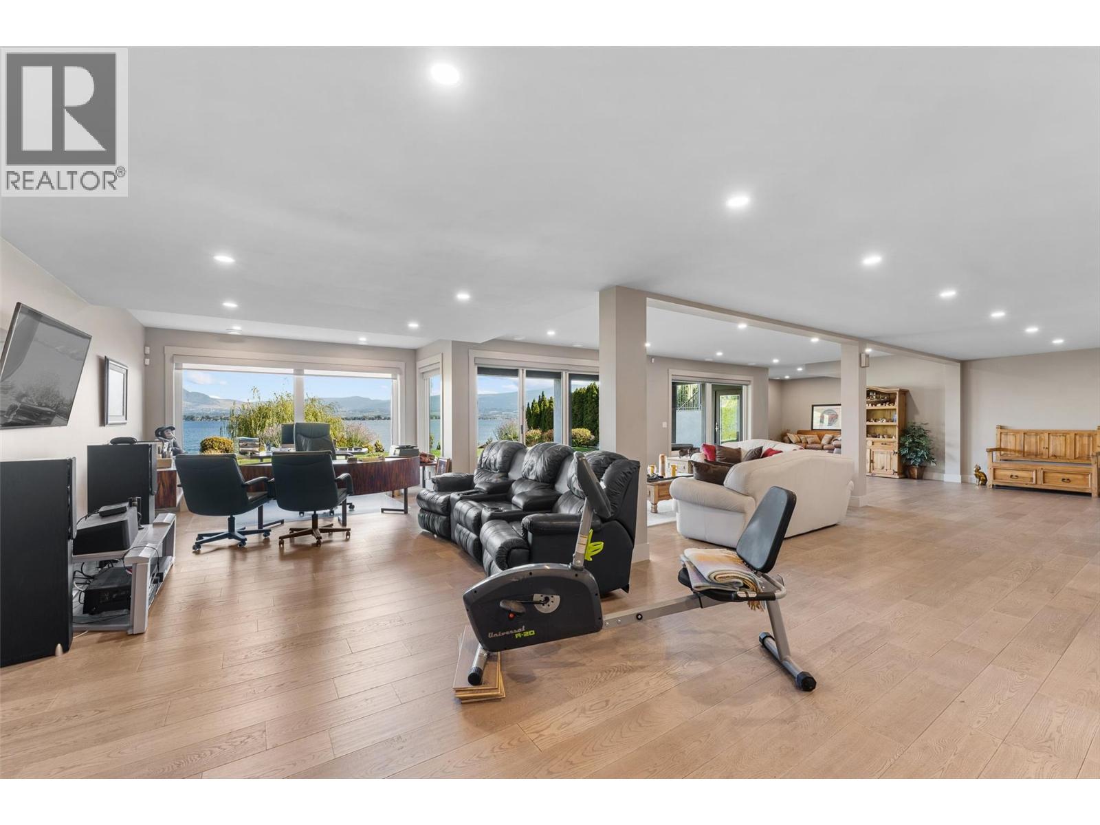 Nestled on a quiet cul de sac in a private waterfront setting, this beautiful customized residence offers a rare opportunity to experience tranquil living on the shores of Okanagan Lake. Surrounded by mature gently sloping grounds, the home blends refined design with a relaxed, resort-inspired lifestyle. Panoramic city and lake view and just minutes into town! A grand foyer with soaring ceilings, skylights and a graceful curved staircase welcomes you inside. The main living area unfolds beneath expansive windows and wall-to-wall Nano doors that open to the covered lakeside deck, creating seamless indoor-outdoor living just steps from the water. At the heart of the home, the chef’s kitchen featuring two islands, including a large L-shaped island with seating for seven, stone countertops, premium Thermador appliances and an oversized walk-in pantry. The primary retreat offers deck access, a custom walk-in closet and a spa-inspired ensuite with heated floors, a freestanding soaker tub and a fully tiled walk-in shower. Additional bedrooms on the upper level provide privacy for family and guests, including a second primary-style suite. The lower level is designed for relaxation with a spacious rec room, temp-controlled wine room, guest suite and walk-out access to the covered patio and backyard. All levels with elevator access! Outside, tiered landscaping leads to a sandy beach and a dock with boat and Seadoo lifts. Heated triple garage and generous driveway parking.