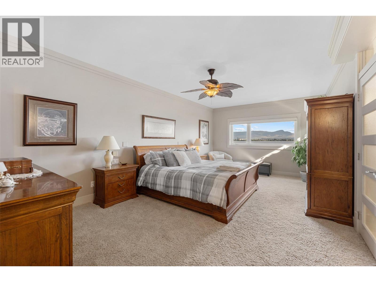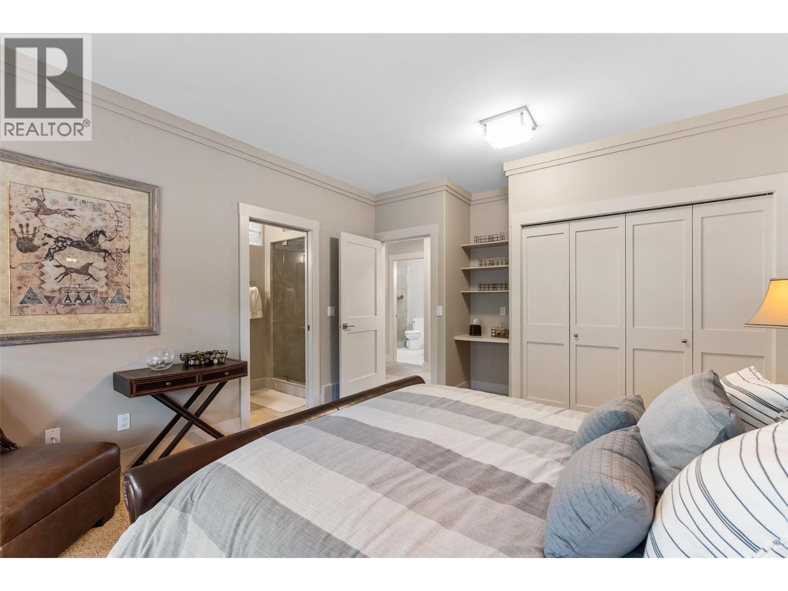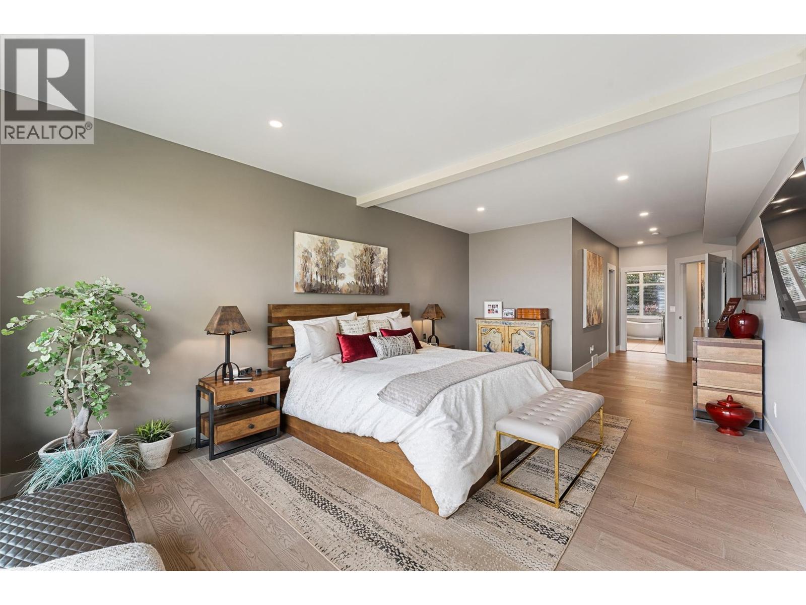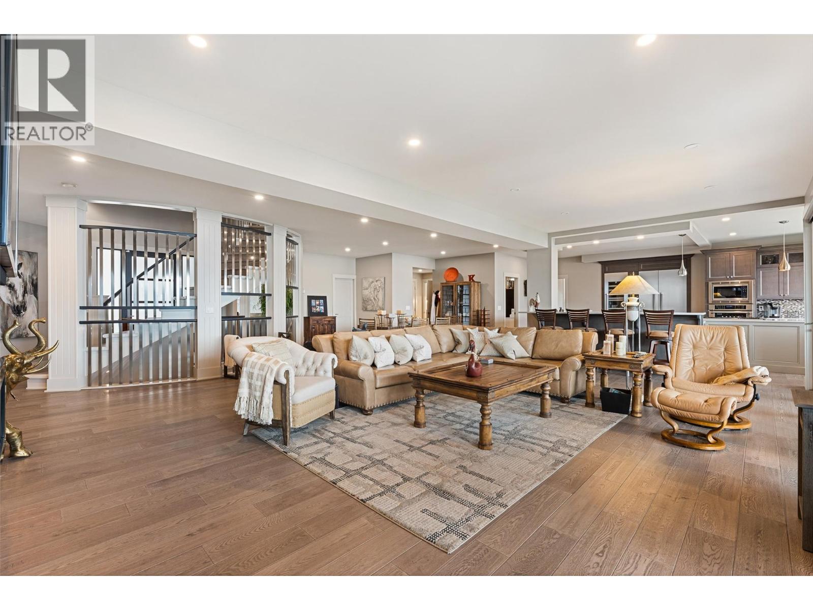 Nestled on a quiet cul de sac in a private waterfront setting, this beautiful customized residence offers a rare opportunity to experience tranquil living on the shores of Okanagan Lake. Surrounded by mature gently sloping grounds, the home blends refined design with a relaxed, resort-inspired lifestyle. Panoramic city and lake view and just minutes into town! A grand foyer with soaring ceilings, skylights and a graceful curved staircase welcomes you inside. The main living area unfolds beneath expansive windows and wall-to-wall Nano doors that open to the covered lakeside deck, creating seamless indoor-outdoor living just steps from the water. At the heart of the home, the chef’s kitchen featuring two islands, including a large L-shaped island with seating for seven, stone countertops, premium Thermador appliances and an oversized walk-in pantry. The primary retreat offers deck access, a custom walk-in closet and a spa-inspired ensuite with heated floors, a freestanding soaker tub and a fully tiled walk-in shower. Additional bedrooms on the upper level provide privacy for family and guests, including a second primary-style suite. The lower level is designed for relaxation with a spacious rec room, temp-controlled wine room, guest suite and walk-out access to the covered patio and backyard. All levels with elevator access! Outside, tiered landscaping leads to a sandy beach and a dock with boat and Seadoo lifts. Heated triple garage and generous driveway parking.