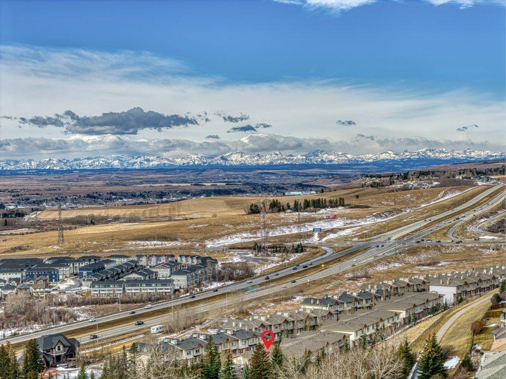 Welcome to this beautifully maintained townhouse in the highly sought-after community of Rocky Ridge, offering over 1,450 sq. ft. of developed living space with South & West facing mountain views. Tucked away in a quiet, private location at the end of the complex, this home combines comfort, functionality, and lifestyle, with pride of ownership evident throughout. Step inside to a spacious entry-level foyer featuring a large storage area, Vacuflo system, and direct access to the single attached, heated garage, ideal for everyday convenience. The main floor impresses with soaring 9’ ceilings, gleaming hardwood floors, and a bright open-concept layout designed for modern living. The kitchen features a new dishwasher and breakfast bar, seamlessly connecting to the dining and living areas. Expansive windows bring in an abundance of natural light and are enhanced by added security film on the main floor windows for peace of mind. Enjoy not one, but two front-facing decks where you can take in the west exposure and mountain views, while the private rear patio with gas BBQ hookup backs onto a quiet green space, perfect for relaxing or entertaining. Upstairs, the thoughtful layout continues with laundry conveniently located on the upper level. The primary bedroom offers mountain views along with a 3-piece ensuite, while a second bedroom and full 4-piece bathroom provide flexibility for guests, family, or a home office. Recent updates add tremendous value and make this home truly move-in ready, including new carpet and fresh paint throughout, new kitchen faucet, newer hot water tank (2023), and professional vent and duct cleaning (2024). Additional features include upgraded smart/security locks. Residents of this well-managed complex enjoy access to on-site amenities including a fitness facility, along with a charming gazebo and additional shared outdoor space. Ideally located just minutes from the Tuscany LRT station with quick access to Crowchild Trail, Rocky Ridge Co-op, Royal Oak Centre, and the Shane Homes YMCA, plus nearby shopping and restaurants. Surrounded by pathways, parks, and bike trails, this home offers the perfect balance of convenience and outdoor lifestyle.