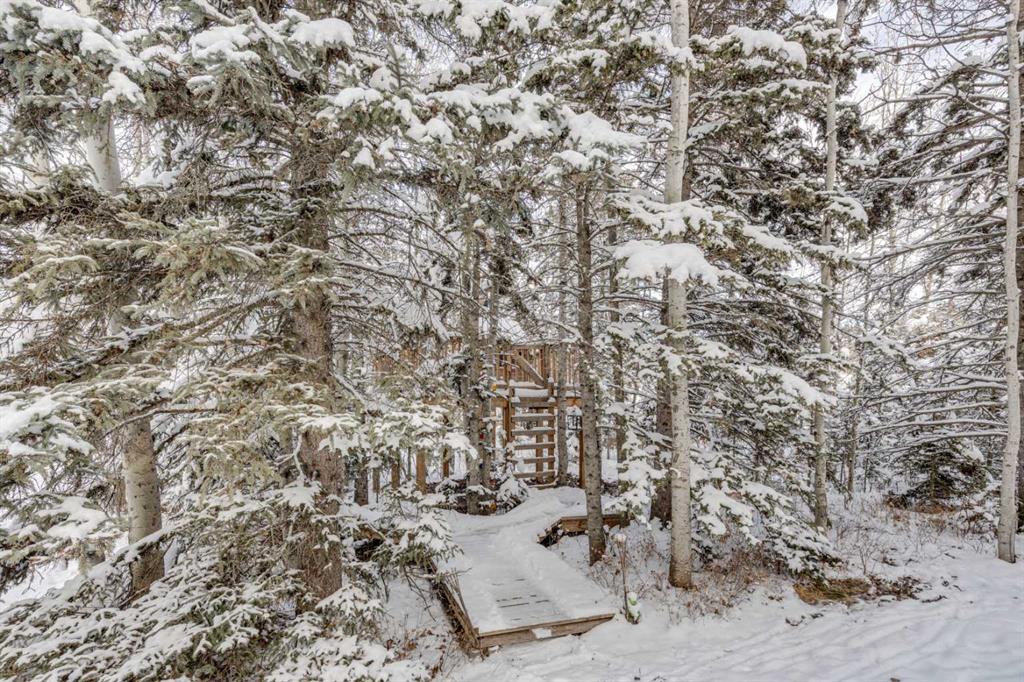 Welcome to Redwood Meadows! This charming home sits on a private lot surrounded by mature trees, offering both privacy and natural beauty. With over 1,700 sq. ft. of living space, this nicely laid out bungalow features 3 bedrooms and 2 bathrooms, highlighted by soaring wood ceilings. The kitchen, laundry, main entrance and hallway are all new white oak hardwood floors that seamlessly join into the pre-existing refinished white oak floors in the living room, that were thoughtfully sourced from the same Wisconsin supplier. Vaulted and sun-filled Living Room, with a floor-to-ceiling fireplace feature wall, wood-burning insert, and expansive prow windows. The dining area leads to the kitchen, which includes ample storage, generous workspace, a breakfast bar, and sliding doors to a large, private back deck. Pantry and laundry are conveniently nearby. A cozy loft space overlooking the living room is ideal for a reading nook, TV room or home office. Two spacious bedrooms with vaulted ceilings and a full bath on the main level. The vaulted master suite offers a custom closet and a 4-piece ensuite with views of the backyard. Walk-up basement provides excellent storage and potential for future development. Equipped with a full perimeter drainage system and professional sump system (installed in 2006, new pump in 2025). Enjoy evenings by the fireplace or outdoor gatherings in your private yard. Spend weekends hanging out with your kids in your own treehouse or gardening in your greenhouse. Double attached garage is oversized with ample space to fit a utility trailer and additional storage shelving. Redwood Meadows Community offers river access trails, playgrounds, outdoor ice rink, tennis and sport courts, and cross-country ski trails, making this home a perfect balance of comfort and recreation. Contact your realtor today to schedule a viewing.