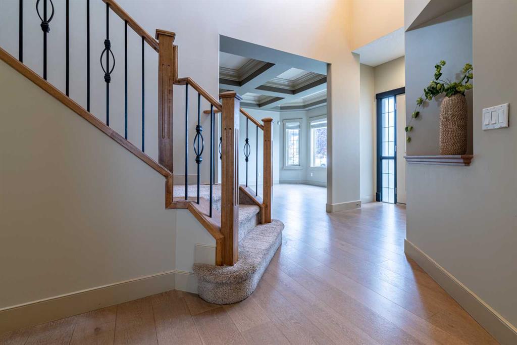 LOCATION · LUXURY · LIFESTYLE· Elite Education Resources — Your dream home awaits in Springbank Hill! This extraordinary residence is set within one of Calgary’s most prestigious and highly sought-after communities, surrounded by luxury estates and multi-million-dollar homes. The location is truly matchless — all within walking distance to Griffith Woods School ,((designated walk zone), Earnest Manning High School(designated walk zone), Menno Simons Christian School. Just minutes away, you’ll also find Calgary’s most renowned private schools, including Rundle College, Webber Academy, and Calgary Christian School. Beyond academics, this elite setting offers unrivaled convenience with the Westside Recreation Centre, Shopping Center, the West LRT, and quick access to Stoney Trail leading directly to the majestic Rocky Mountains. A perfect balance of serenity and convenience in a truly elite setting. Offering nearly 4,000 sq ft of refined living space, this 3+2 bedroom plus office (or 6th bedroom), 4 full bath home is filled with natural light through expansive windows on all three levels. The exterior impresses with a timeless combination of stone and stucco, complemented by an exposed aggregate driveway for a touch of elegance and durability. Step inside to a breathtaking 18-ft open-to-above foyer, where 9-ft ceilings and European brushed oak hardwood set the tone for luxury. The formal living and dining rooms are enhanced with a coffered ceiling and a double-sided fireplace. The spacious family room, with a coffered ceiling, offers both elegance and versatility — ideal for relaxing evenings, formal entertaining, or a secondary gathering space for the family and friends. The chef’s kitchen features granite countertops, an island with breakfast bar, custom maple cabinetry, and premium stainless steel appliances including a Bosch silent dishwasher and Kitchen Aid gas range — all designed for both function and sophistication. The kitchen flows into a sun-filled great room with custom built-ins, and a glass door leads to a southwest-facing deck overlooking a beautifully landscaped, mature yard. The main floor also includes a private office/den (or 6th bedroom), a full bath, and a spacious laundry/mudroom. Upstairs, the luxurious primary retreat offers a spa-like ensuite with dual vanities, a jetted tub with river rock accents, and a tiled shower. Two additional bedrooms, both generously sized, share another full bathroom. The fully finished lower level is equally impressive, featuring 9-feet ceilings, two more bedrooms, a modern bathroom with double vanity, a home theatre, and mechanicals upgraded with dual furnaces and dual hot water tanks. Additional features include: UV air filtration, Nest thermostats, DSC alarm system with in-wall tablet, reverse osmosis drinking system, and Electrolux central vacuum. This is more than a home — it’s a statement of superb education recourses, this property offers elegance, comfort, and a lifestyle second to none.