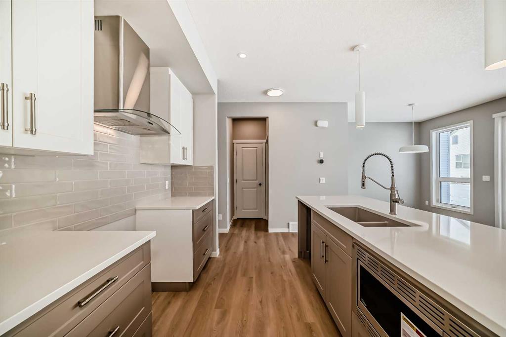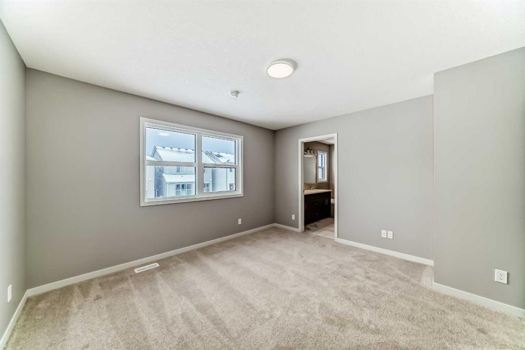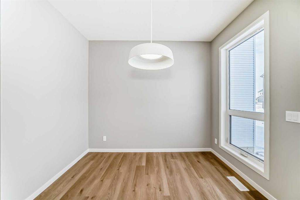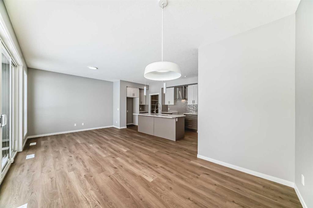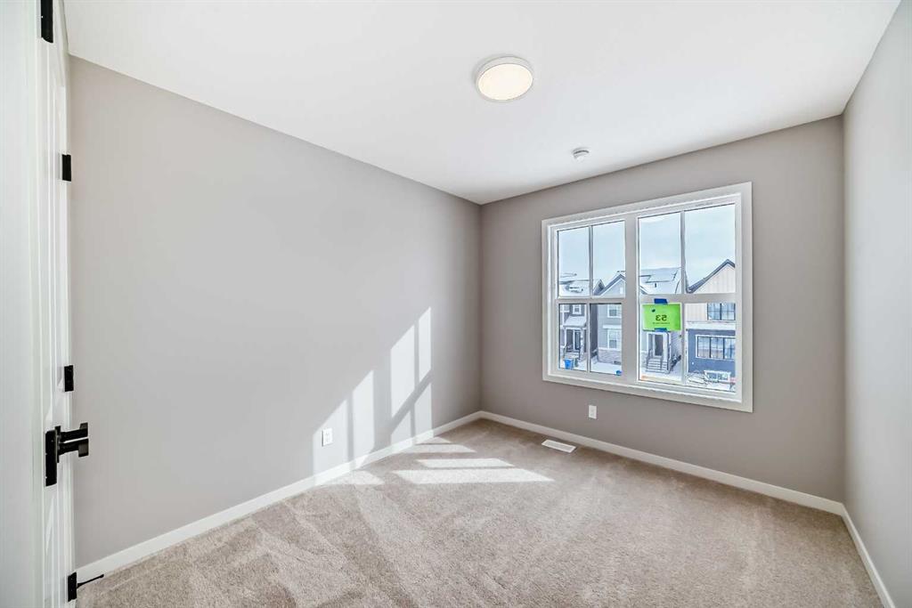 Welcome to this beautifully designed home in the vibrant southeast community of Rangeview, offering over 1,700 sq ft of thoughtfully planned living space that blends modern design with everyday functionality. With professionally curated finishes and a smart family-friendly layout, this home delivers the perfect balance of style, comfort, and future flexibility. Step inside to a bright and inviting main floor where luxury vinyl plank flooring runs throughout, creating a seamless and modern feel. At the rear of the home, oversized wall-to-wall windows stretch across the back of this west-facing property, filling the space with natural light and warm afternoon sun. Dual sliding patio doors enhance the design and create the perfect opportunity for the next owner to build out an incredible indoor-outdoor living experience, whether that means a future deck, patio, or a private backyard retreat designed to become your own outdoor oasis. The kitchen is a true focal point, finished in a striking modern palette with taupe lower cabinetry and crisp white upper cabinets for a clean, elevated look. Hammered subway tile adds texture and depth, wrapping the stand-alone hood fan for a stylish custom touch. Crisp white quartz countertops, stainless steel appliances, and thoughtful workspace make the kitchen as functional as it is beautiful. At the back of the home, the dining area is positioned on one side while the living room anchors the other, with both spaces taking full advantage of the expansive rear windows and sunny west exposure, creating a bright, open setting that feels equally suited to quiet evenings at home or entertaining family and friends. Upstairs, the layout continues to impress with well-proportioned spaces designed for modern family living. The spacious primary retreat offers a peaceful escape and features a luxurious five-piece ensuite complete with a stand-alone tub, oversized shower, and elegant finishes. Two additional bedrooms provide comfortable space for family or guests, while the central bonus room offers flexibility for a media area, kids’ hangout, or home office. A full bathroom and convenient upper-level laundry complete the upper floor. One of the standout features of this home is the dual front door configuration. One entrance leads directly to the basement, while the other welcomes you into the main house—creating a setup that is ideally suited for future basement development. It’s a layout that offers excellent flexibility for a secondary suite, mother-in-law space, or a private area for an older child seeking a little more independence (secondary suite development would be subject to approval and permitting by the city/municipality). Located in the growing community of Rangeview, this home offers the chance to be part of Calgary’s first garden-to-table neighbourhood, a community designed around connection, walkability, green spaces, and an active outdoor lifestyle. With future parks, pathways, gathering spaces, and nearby southeast amenities.