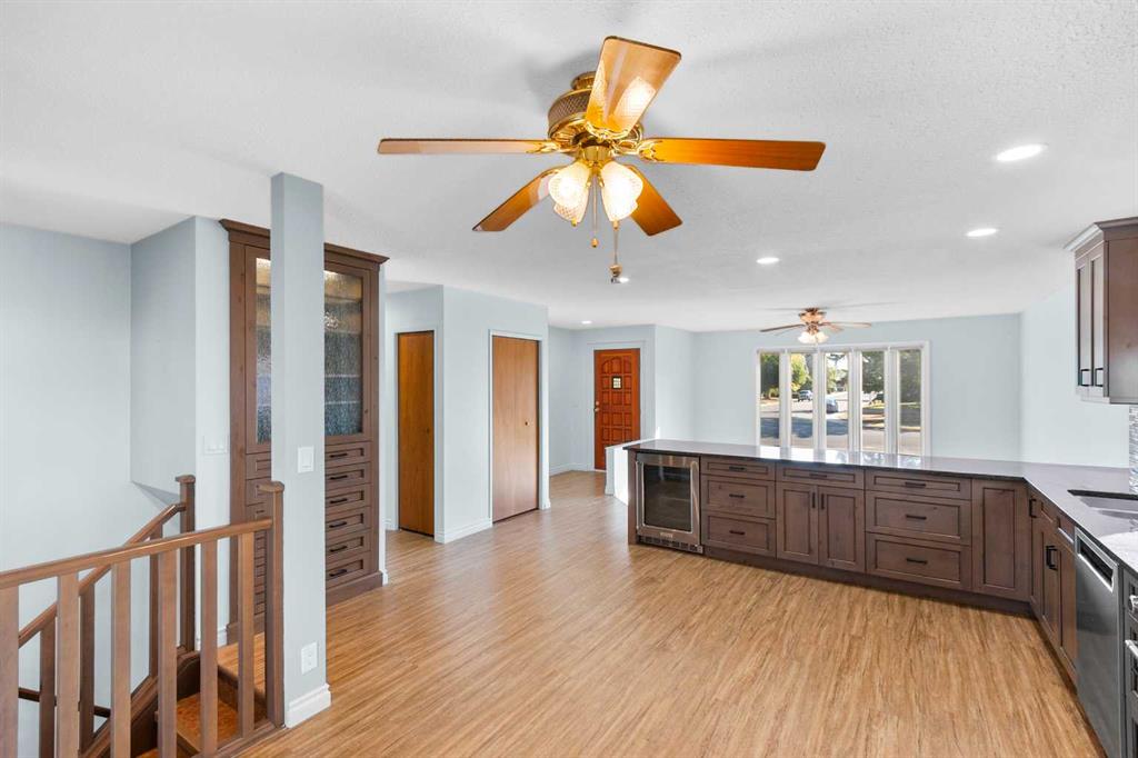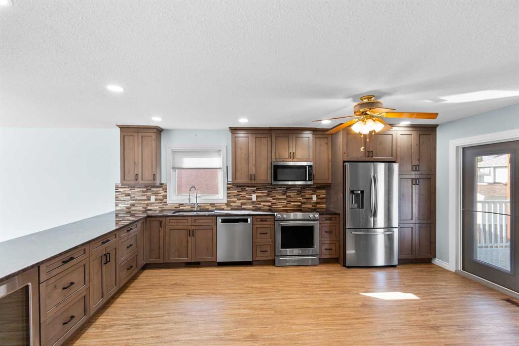Welcome to this well maintained 4-bedroom, 3-bathroom home, offering 1,212 sq. ft. of comfortable living space in a sought-after family neighborhood—just minutes from schools, parks, and shopping. The main level features a spacious sunken living room perfect for relaxing or entertaining, a bright and functional kitchen with an oversized island, granite countertops, and newer stainless-steel appliances and direct access to a large covered deck. This level also includes two generously sized bedrooms and a 4-piece bathroom. The primary bedroom offers added privacy with a 3-piece ensuite. Downstairs, you'll find a large recreation room, an additional bedroom, a den or office space, a 4-piece bathroom, and a bonus room—ideal for a gym, playroom, or extra storage. The large laundry room and ample storage throughout the lower level add to the home's functionality. The front and backyard are beautifully landscaped, creating great curb appeal and a private backyard oasis. A single detached garage sits at the rear of the property for convenient parking or additional storage. This move in ready home offers space, versatility, and a prime location—perfect for families or anyone looking to settle into a welcoming neighborhood.