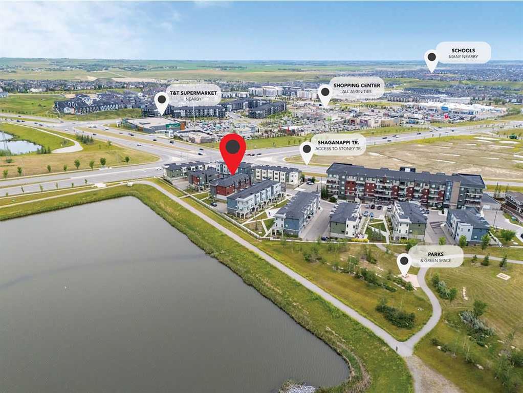 Welcome to this beautifully upgraded townhome in the sought-after Diseno development in Sherwood, NW Calgary. Offering 1,565 sq. ft. of well-designed living space, this bright and sun-filled home is ideally located just steps from the community park and pond, providing peaceful views while remaining within walking distance to the amenities of Sage Hill Crossing. From the moment you step inside, you’ll notice the modern finishes and thoughtful design throughout. The entry level features a versatile flex space—perfect for a home office, gym, media room, or hobby area—along with convenient access to the side-by-side double attached garage. The main living area is open, airy, and perfect for both everyday living and entertaining. Large windows flood the space with natural light and frame scenic park views. The stylish rear kitchen is a true highlight, featuring quartz countertops, upgraded stainless steel appliances, ample cabinetry, and a functional layout that flows seamlessly into the dining area. The spacious living room creates a warm and inviting atmosphere to relax or host guests. Enjoy outdoor living with both front and rear private balconies—ideal for morning coffee or evening unwinding. Upstairs, you’ll find three generously sized bedrooms and two full bathrooms. The primary suite offers a bright and peaceful retreat with a walk-in closet and a modern ensuite complete with a walk-in shower. The additional bedrooms provide flexibility for family, guests, or workspace. This home showcases a full builder upgrade package, including laminate flooring on the main level, window coverings throughout, and attractive exterior finishes featuring Hardie Board siding, stucco accents, and brick detailing for timeless curb appeal. Meticulously maintained, it reflects true pride of ownership. Conveniently located near public transit, major roadways, schools, parks, and shopping at Beacon Hill and Sage Hill Plaza, this home offers an exceptional blend of comfort, style, and location—an outstanding opportunity to own in one of NW Calgary’s most desirable communities.
