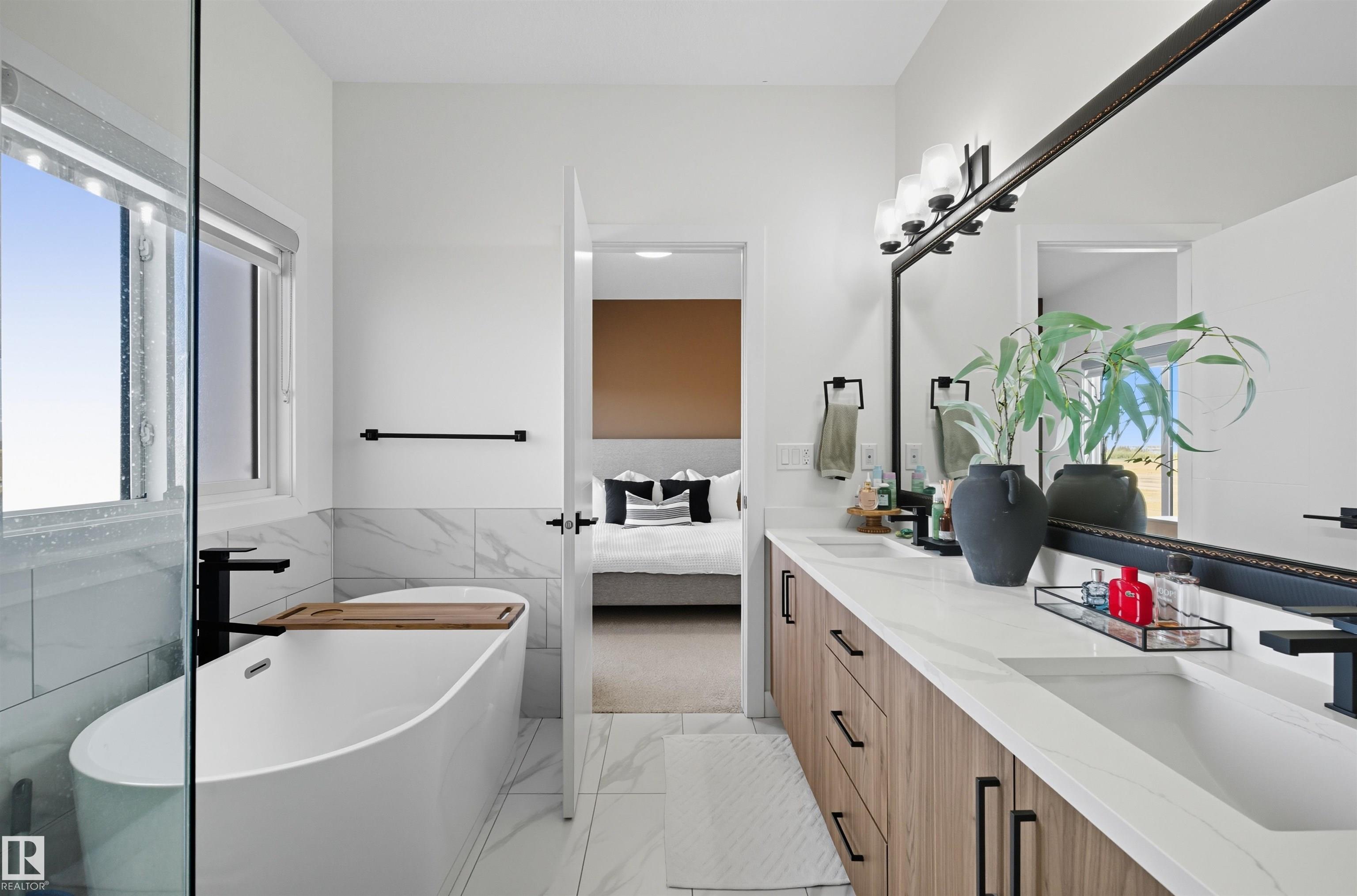 Built in 2020, this stunning modern home strikes a perfect balance of style and comfort. The grey facade, stone columns, and landscaped yard with hydrangeas create instant curb appeal. Inside, 9’ ceilings and luxury vinyl plank flooring lead to a timeless interior with quartz counters and sleek black hardware. The gourmet kitchen features a massive wood-toned island, stainless appliances, and a walk-through pantry, flowing into a living room with a floor-to-ceiling tiled fireplace. A soaring open-to-below entry and wood railings add architectural charm. Upstairs, find three bedrooms and a bonus room. The primary retreat offers a walk-in closet and a spa-like ensuite with a stand-alone tub and glass shower. Outside, enjoy sunsets and wildlife with no back neighbors from your deck with a gas BBQ line. Complete with A/C, HRV, a double attached garage, and a basement with electrical ready for your vision, this move-in-ready gem combines modern luxury with a peaceful setting.