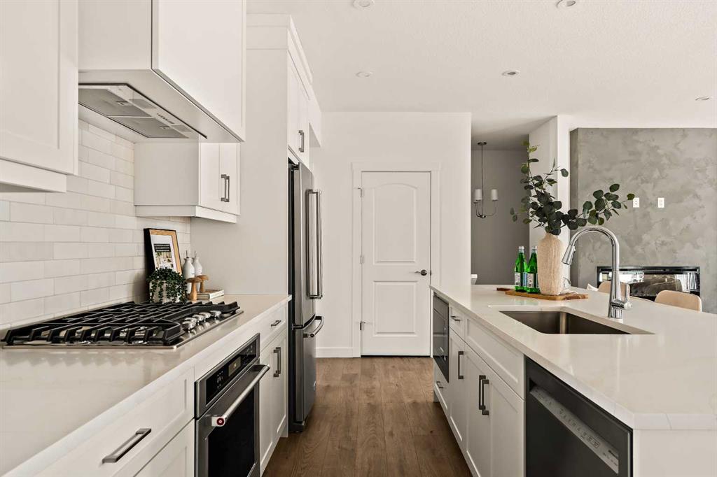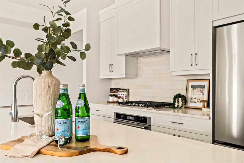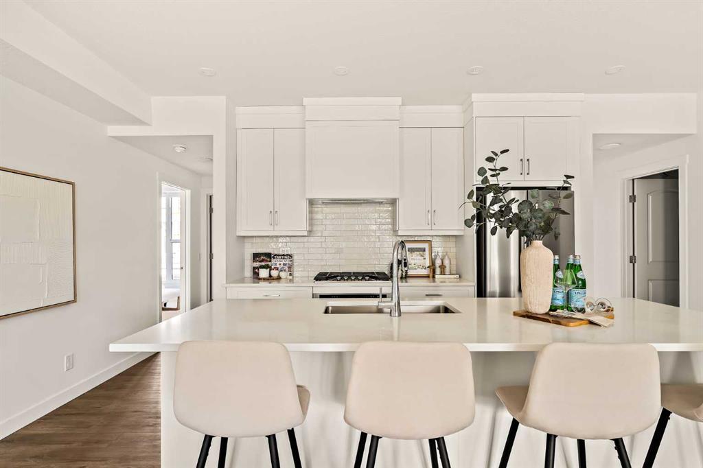Welcome to the Regent at Crown Park - a thoughtfully designed townhouse that offers single-level bungalow style living without compromise. Designed with down-sizers in mind, this maintenance-free townhouse combines a bungalow lifestyle with a double attached garage - all while giving you a maintenance-free lifestyle, perfect for those who travel, or simply just don't want the hassle of exterior maintenance, landscaping or snow removal! This brand new 3 bedroom, 2 bathroom townhome has nearly 1,300 ft2 of living space over one level and a lower level with virtually endless storage and a private double attached garage! The brilliantly designed living area was created for entertainment with a central kitchen that opens to the living and dining areas with a wall of windows that flood the space with natural light. The timeless kitchen has white shaker cabinets, light quartz countertops and a suite of built-in appliances including a chimney hood fan, gas cooktop and built-in oven. The sprawling kitchen overlooks both the living and dining areas, ensuring the chef is never left out. A central fireplace with floor-to-ceiling plaster finish anchors the main living area with ample space for 6 to sit comfortably. The large dining area has space for a table and buffet if desired, providing flexible furnishing options to meet your needs. The primary suite is located at the back of the home and features a large walk-in closet and spa-inspired ensuite with dual sinks and a tiled walk-in shower. The centrally located laundry room, complete with upper cabinetry and a countertop for added convenience, perfectly separates the primary suite from secondary rooms for optimal privacy. Two additional bedrooms and a full bathroom round out this expansive single-level living space. The secondary rooms provide added flexibility for a guest room(s), home office, media room or studio space - while keeping a broad appeal for resale value. The lower level has a large storage room and oversized utility room (~17'x7') that could easily be used for a hobby space. An oversized double attached garage completes the interior of the home. Lastly, a large covered southwest-facing patio, spanning over 26' wide, provides the perfect outdoor living space with views overlooking the park and is complete with a gas line and hose bib for added convenience to everyday living. A bungalow style townhouse with a double attached garage is an exceptionally rare find - don't let this opportunity pass by. Purchase with peace of mind - this brand new home includes a comprehensive builder warranty + Alberta New Home Warranty. Located just minutes from downtown, countless amenities and in an established and developed area, you can move into your new home with confidence - knowing all that is around your beautiful new home.