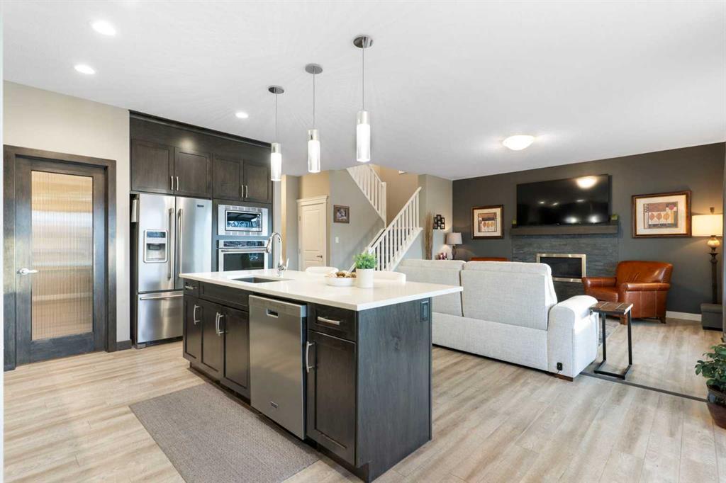Backing onto peaceful greenspace and wetlands, this beautifully maintained two-storey home in Fireside offers a rare combination of privacy, functionality, and thoughtful upgrades throughout. With a fully finished walkout basement and partial mountain views, this home is designed to enjoy every season. The main level features luxury vinyl plank flooring, a bright & open layout anchored by a well-appointed kitchen with Maytag appliances, including a gas range, built-in oven, and fridge with ice and water. Six pot drawers, generous cabinetry, and a seamless flow to the upper deck make this space ideal for everyday living and entertaining. Step outside to the expansive 27' upper deck finished with durable Duradek flooring, privacy walls, a deck cover with sun roller blind, and a natural gas BBQ hookup, all overlooking tranquil greenspace. Upstairs, the thoughtful layout truly shines with four generously sized bedrooms, a large bonus room, and convenient upper-level laundry, making this home ideal for a growing or multi-generational family. The primary retreat offers a thoughtfully designed ensuite with double sinks, walk-in closet, and a deep soaker tub, creating a calm space to unwind at the end of the day. Additional bedrooms are well proportioned and versatile for kids, guests, or home offices, while the bonus room provides the perfect hub for movie nights, play space, or a second living area. The fully finished walkout basement extends the living space and truly sets this home apart with an extra bedroom and full bathroom. A Dry-Core subfloor keeps the basement warm and comfortable year-round, while the walkout leads to a beautiful sunroom designed for relaxation. With three sliding patio doors, this enclosed space creates a peaceful, wind- and bug-free environment, perfect for enjoying the hot tub or unwinding while taking in wetland views. The backyard has been professionally levelled with a retaining wall, is fully fenced with solar lighting, and backs directly onto green space, offering privacy and a strong connection to nature. Additional highlights include central air conditioning, built-in cabinetry in the garage, vessel sink in the powder room, and negotiable items such as a Broil King natural gas BBQ and additional fridges. Located in the family-friendly community of Fireside, close to schools, parks, pathways, and amenities, this home delivers a rare blend of lifestyle, comfort, and setting.