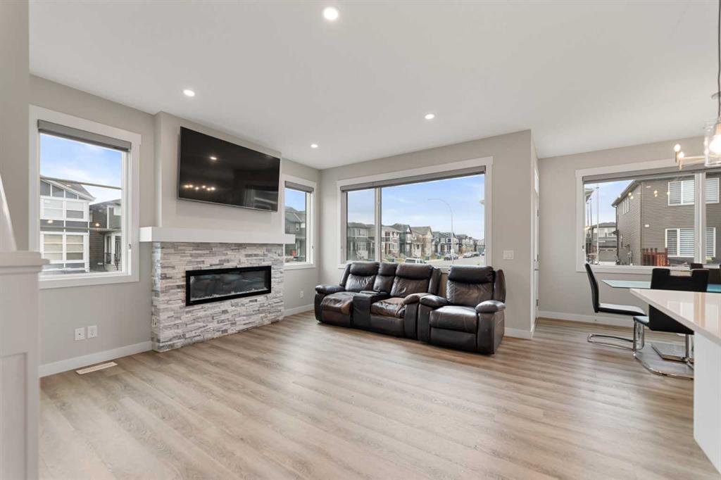 CONVENIENT SIDE ENTRY | MAIN FLOOR BEDROOM & FULL BATH | CORNER LOT. Welcome to this exquisite Anthem BUILT Signature Home in the highly sought-after and fast-growing community of Cornerstone, where modern living meets natural surroundings. This beautifully designed 2-storey home offers over 2,200 sq.ft. of exceptional craftsmanship and thoughtful detail — perfect for large or multi-generational families. Step inside to discover a bright and open floor plan featuring luxurious vinyl plank flooring, high ceilings, and a gourmet kitchen equipped with quartz countertops, sleek stainless steel appliances, including an gas stove, French door refrigerator, and built-in microwave. A walk-through pantry and spacious center island make this kitchen both stylish and functional. The main floor bedroom with a full bath provides the ideal space for guests or extended family, while large windows fill the living and dining areas with natural light, enhancing the corner lot’s open feel. Upstairs, you’ll find four generous bedrooms, including a stunning primary suite with a spa-inspired ensuite featuring dual vanities, a soaker tub, stand-alone shower, and a walk-in closet. A central family room separates the primary suite from the additional bedrooms, ensuring privacy and comfort. The upper level also includes a large laundry room, plus a main bath with dual vanities. Additional highlights include an expanded dining area, side entrance, and corner lot location. Perfectly situated close to the Calgary International Airport, with easy access to Deerfoot Trail and Stoney Trail, and surrounded by ever-growing amenities, this brand-new home delivers both luxury and practicality, ready for your family to move in and enjoy!