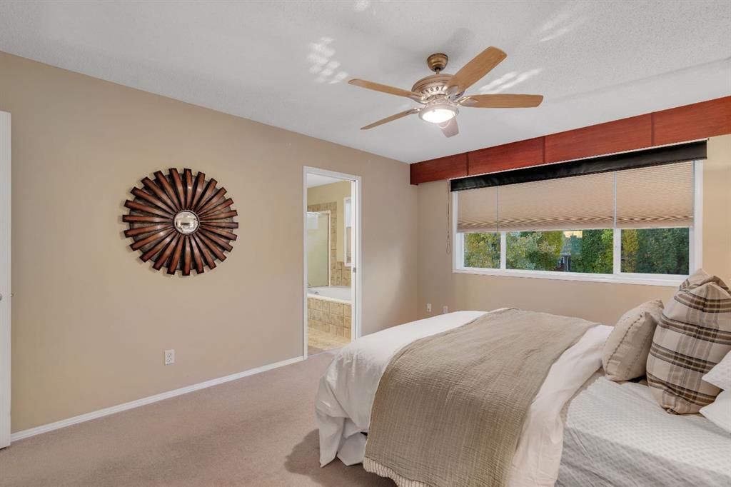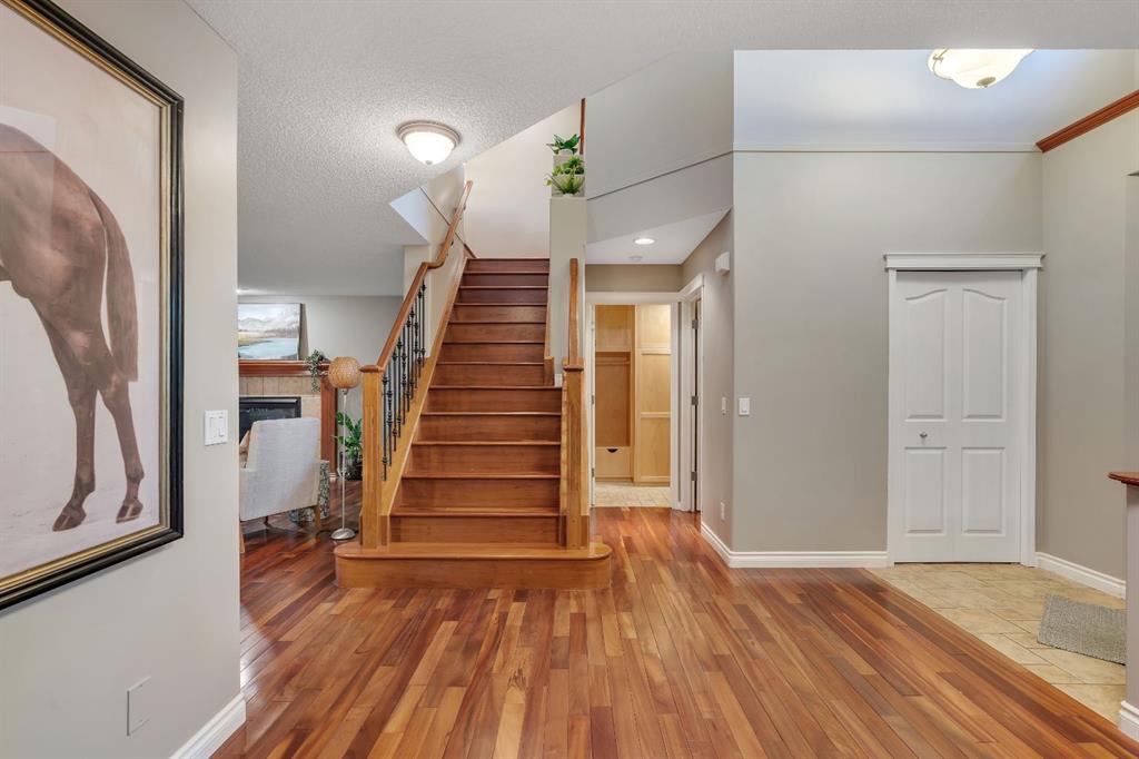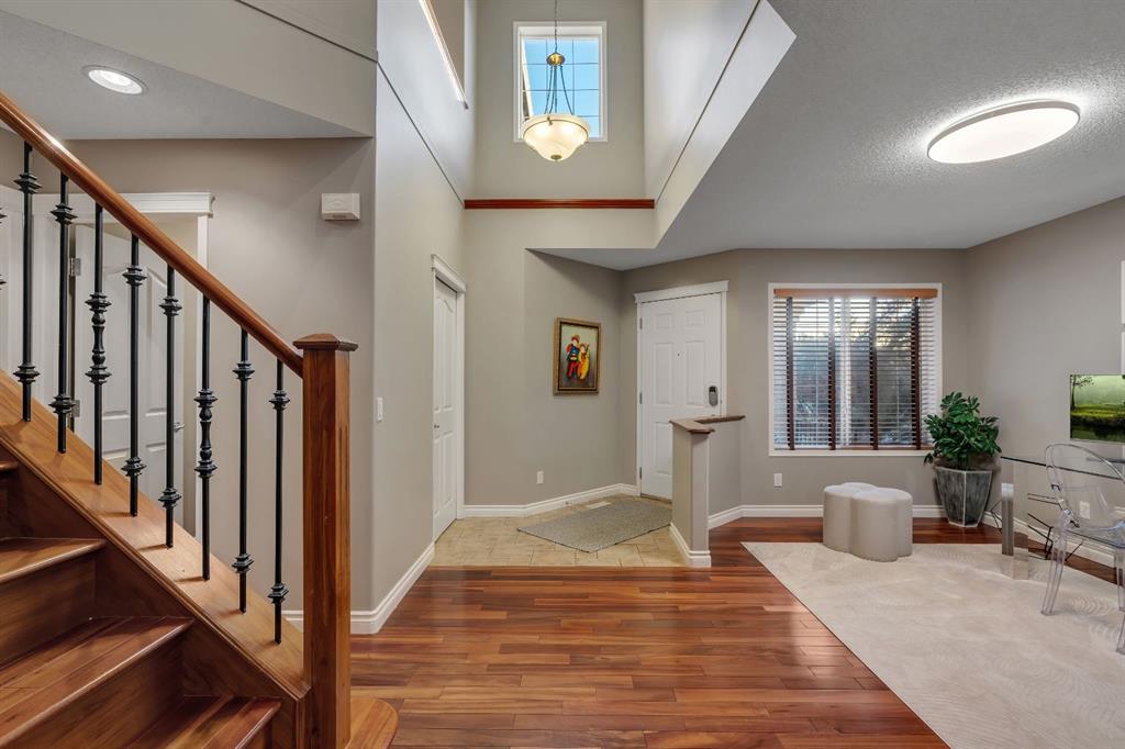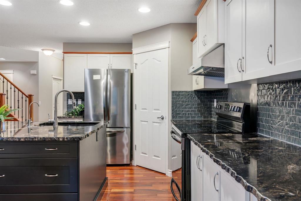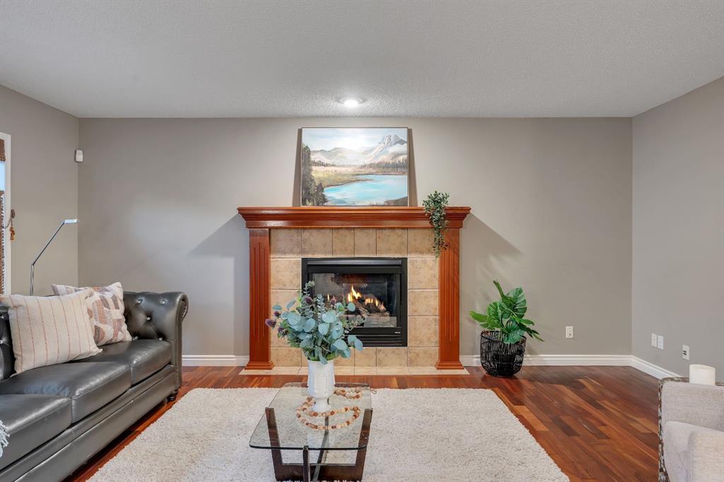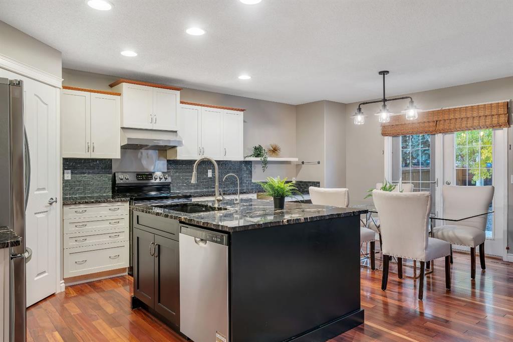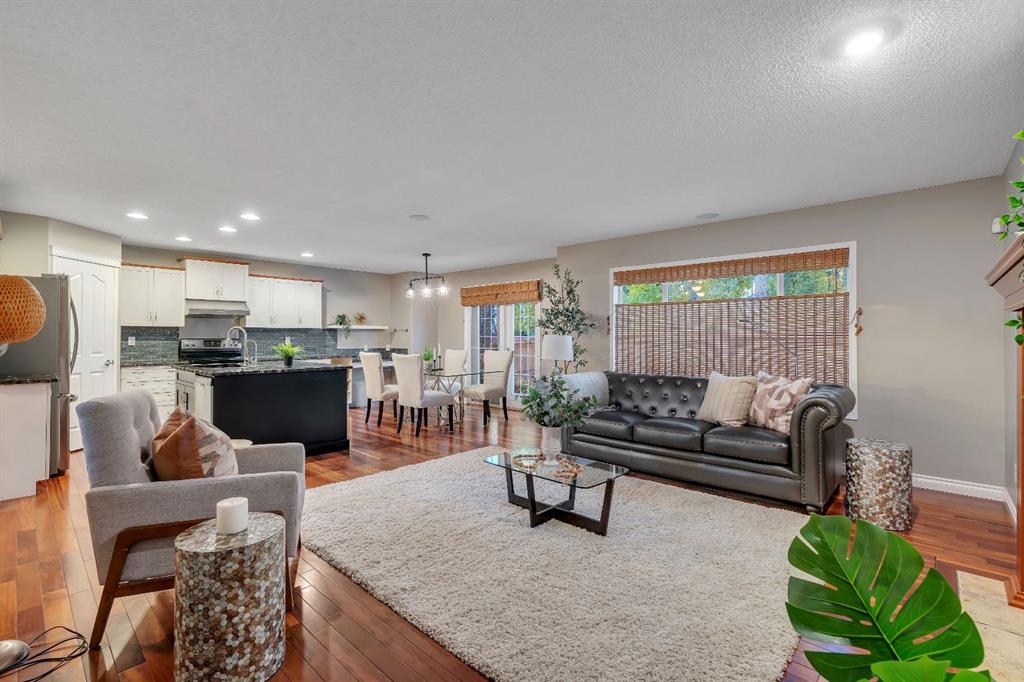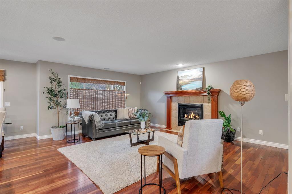 Open House Sat October 25th 1:30-3:30 PM. An Impressive & rare home with 4 beds up and over 3000 sq ft of fully developed space sitting on a huge wide lot, just steps to schools. Welcome to this exceptional home offering a beautifully finished living space, set on a premium lot with lovely mountain views from the front bedroom. Located only a 2 minute walk to the elementary school and under 8 minutes to the middle school, this is a rare find in an ideal family focused location. Step inside to discover a bright and open layout with soaring vaulted ceilings in front foyer, rich Brazilian cherry hardwood floors, upgraded lighting, and a welcoming living area anchored by a soothing gas fireplace. Perfectly positioned windows frame the lush garden views, bringing the outdoors in and filling the space with natural light. The front home office is ideal for remote work, a music room, or a dining/flex space, while the open concept design flows seamlessly into a perfectly placed dining area and a beautifully appointed kitchen. The standout kitchen features upgraded French shaker maple cabinetry, sleek granite countertops with natural stone edge, a large island with extra cabinetry, professional grade appliances, a spacious corner pantry, and plenty of prep and storage space perfect for home cooks and entertainers alike. Completing the main level is a 2 piece powder room and a modern, functional mudroom that includes a newer washer and dryer with customized storage as well as direct access to the oversized insulated double garage. Upstairs, the primary suite is a peaceful retreat with large windows overlooking the rear yard, a walk-in closet, and a functional ensuite with a comfort height vanity, soaker tub, and separate shower. Three additional bedrooms offer generous closet space and share a modern 4-piece bath. A bright bonus/games room provides the perfect spot for family movie or game nights or a quiet reading/homework nook for the kids. The basement has been professionally developed with estate level finishings including 9’ ceilings, plush custom carpet and modern trim. This level features a spacious recreation room with custom built in cabinetry, 6.1 sound system and projector/screen (as is), an additional 5th bedroom or gym space with large closet, a bathroom area ready to be developed, and plenty of storage. Enjoy outdoor living in the sunny backyard oasis, complete with mature landscaping, a large patio, and gas BBQ hookup perfect for relaxing evenings or weekend entertaining. Additional highlights include upgraded lighting, well-maintained roof shingles, full hardwood stairs, built ins, new interior paint, window coverings, and air conditioning for added peace of mind. This home combines pride of ownership with thoughtful upgrades in a serene, sought-after setting just minutes from Fish Creek Park, athletic fields, an outdoor chilled skating rink with its own Zamboni, shopping, and quick access to the new ring road. Move-in ready & a must see! Call now!