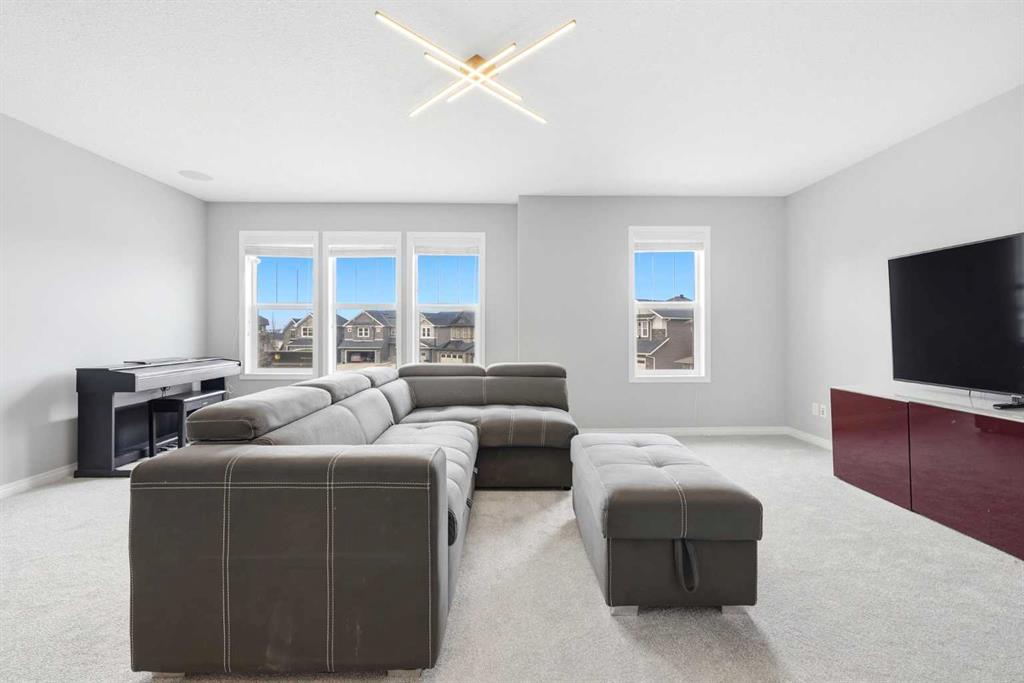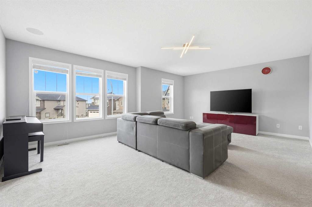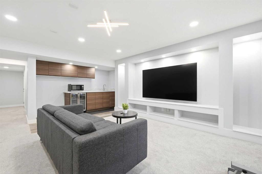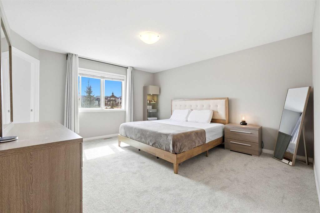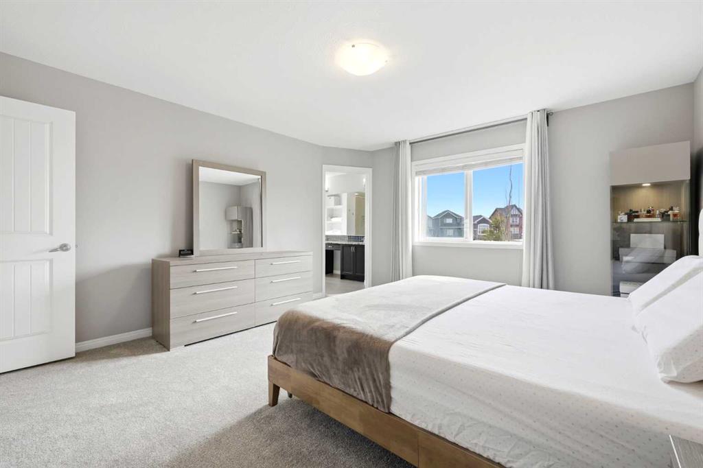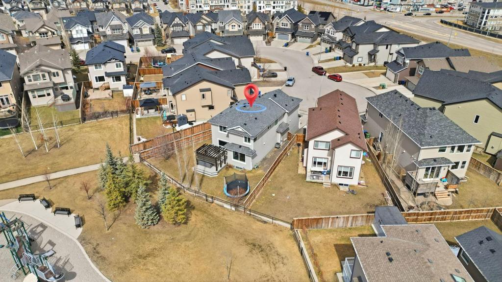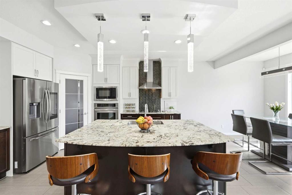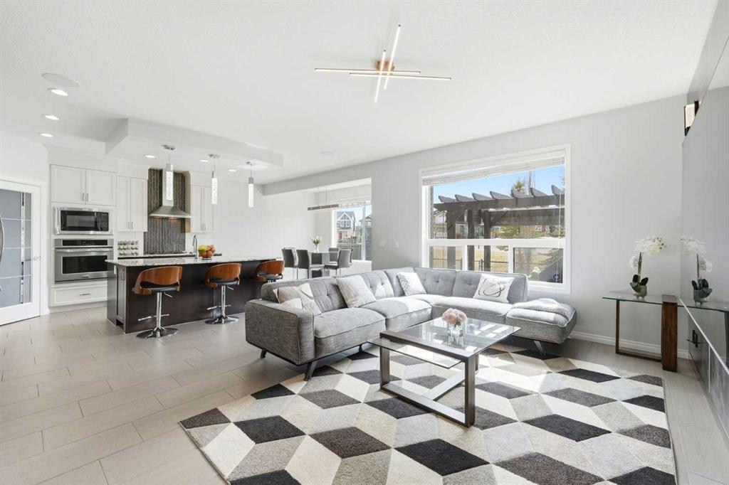 Openhouse May 2nd 2:30 - 4:30 p.m. Premiere Video Tour available. An exceptional residence offering over 3,000 sq. ft. of refined, design-forward luxury, perfectly set on a quiet cul-de-sac backing directly onto green space and a community field. This fully finished 2-storey home delivers a rare combination of privacy, prestige, and elevated family living. A double attached garage plus 2-car driveway introduces the home with presence and practicality, while the covered entry sets the tone for the upscale finishes throughout. Inside, soaring 9-ft ceilings and an open-concept layout create a light-filled, architectural main level,enhanced by upgraded designer lighting throughout. The chef-inspired kitchen is a true centerpiece, featuring a substantial granite island, bespoke dual-tone cabinetry, an upgraded cooktop, and extensive built-in storage designed for both function and entertaining. The great room is anchored by a dramatic two-way fireplace and elevated by a custom metal feature backdrop, seamlessly connecting to a private executive-style office framed by French doors. Outdoor living is equally elevated, with a composite deck, custom pergola, and a fully landscaped south-facing pie lot—offering uninterrupted views and an ideal setting for sophisticated entertaining. Exterior security lighting adds both ambiance and peace of mind. Upstairs, a thoughtfully designed bonus room with wet bar and beverage fridge provides a private lounge experience. The primary suite is a true retreat, featuring a spa-caliber ensuite with a corner soaker tub, dual rain-style shower heads, frameless 10mm glass enclosure, built-in bench, and custom makeup vanity. Two additional bedrooms, updated carpeting, upper-level laundry, and a designer vanity bath complete the upper floor. The professionally finished 9-ft basement extends the living experience with a spacious recreation lounge with a wet bar, guest bedroom, full bathroom, and flexible space for a home gym, theatre, or studio. Significant recent upgrades add long-term value and comfort, including central air conditioning and a new roof installed last year with additional ventilation fans. The garage has also been thoughtfully enhanced with fresh paint, upgraded flooring, and custom wall storage systems and hangers, offering both functionality and a polished finish. Highly sought-after family-oriented location close to premium schools, parks, and amenities. A residence defined by scale, craftsmanship, and elevated everyday living. Don’t miss this exceptional opportunity, book your private showing today. Homes like this don’t last!