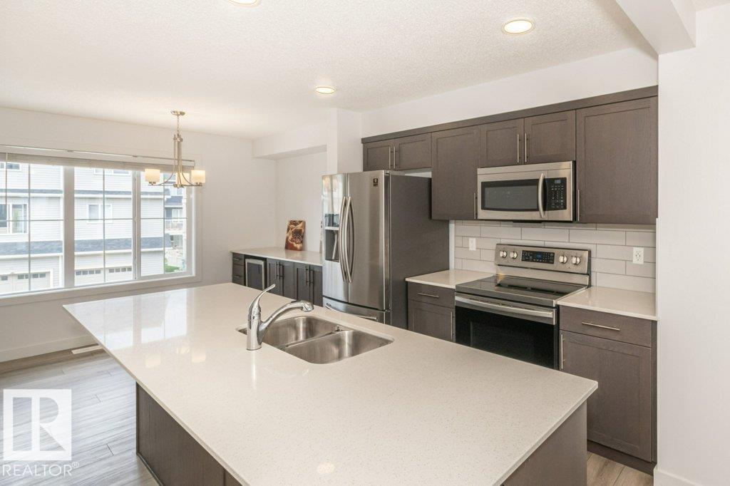 **NO CONDO FEES - END UNIT** This 1260sq ft 2 storey attached home is ready to go! As you enter the main level you will notice the open concept dining, kitchen with large island, s/s appliances including a bar fridge and coffee bar, quartz counter tops and living room with electric fireplace and feature wall. The upper level offers 2 large primary suites with ensuites and W/I closets. There is a balcony for hot Summer nights, over-sized fenced SE facing front yard, access to the heated double garage with workshop area and extra long driveway. Close to all amenities, EIA, Hwy 2 and Anthony Henday. Shows 10/10!