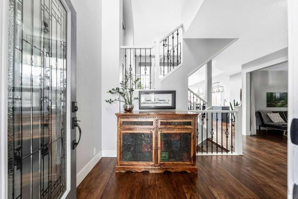 Welcome to this exceptional home in sought -after Cranston Ridge with 2988 square feet of immaculate living space and perfectly positioned just a short walk from the breathtaking pathways of Fish Creek Park and the Bow River ravine system. From the moment you step through the front door, pride of ownership is unmistakable. This immaculate residence showcases an exquisite contemporary open design highlighted by soaring two-storey windows that flood the living space with natural light and ceiling heights approximately 17' high. The stunning living room is anchored by a warm and inviting gas fireplace, creating the perfect setting for both elegant entertaining and relaxed everyday living. The newer chef-inspired kitchen is a true showpiece, featuring a massive quartz island, custom hood fan, induction stove, stainless steel appliances, and a convenient appliance garage perfect for keeping your espresso station tucked neatly away. There is also a spacious corner pantry. A bright and spacious breakfast nook with a built-in banquette overlooks the beautifully landscaped back yard, offering charm and functionality. The main floor is finished with newer engineered hardwood floors and brand new carpet ( 2 months ago) has been installed throughout the upper floor, open riser stair case and basement stairs. There are 3 generous sized bedrooms, and the primary features an electric fireplace and a 5 piece ensuite with a barn door to close off your walk in closet. The fully developed basement features in floor heat, a 4th bedroom, a spacious family room with wine fridge and a luxurious 3 piece bath with walk in shower. Step outside to your own private oasis. The professionally landscaped yard features an elevated stone sun deck and a large integrated pond complete with pump and filter creating a tranquil backdrop for summer evenings. There is also a ground level deck off the patio doors from the house perfect and convenient for BBQ'S. There is a large shed in the back to house all your lawn and garden tools. This home is also air conditioned and ready for the upcoming summer season. Noteworthy are the newer glass front door and the garage door that were both replaced in 2019. This beautifully maintained home offers a rare combination of style, comfort, and an unbeatable location. You will not want to miss out on this one.