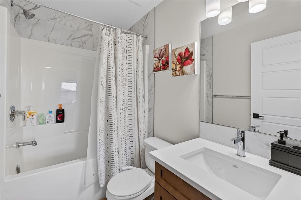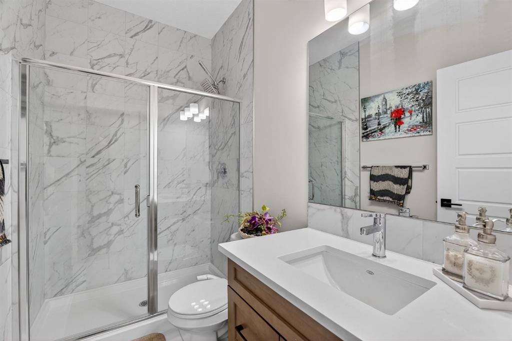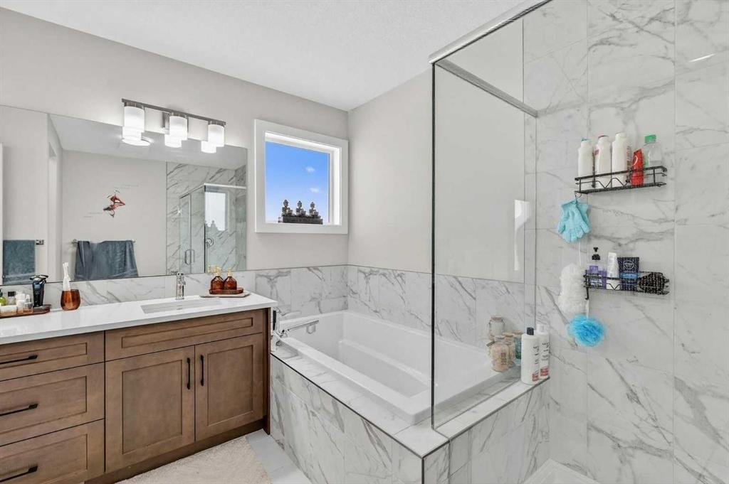 Welcome to this exceptional 7 BEDROOM, 2-storey home with an illegal walkout basement suite, backing onto green space in the community of Cornerstone. Offering outstanding flexibility, income potential, and over 3,000 sq ft of total developed living space, this property includes 2,219 sq ft above grade plus an additional 873 sq ft in the fully finished 2 bedroom illegal suite. Basement development was completed with permits. Any suite conversion would be subject to city/municipality permitting and approval. The main level features a bright, open-concept layout with modern finishes throughout. The kitchen is a true standout, thoughtfully designed with quartz countertops, a large central island and an abundance of sleek cabinetry. There is a spice kitchen with a gas stove and extra cabinetry, perfect for those who love to cook or entertain. This highly functional setup offers added convenience while keeping the main kitchen clean and open. The dining area flows seamlessly to the upper deck overlooking green space, while the spacious living room offers a comfortable gathering space filled with natural light. A rare MAIN FLOOR BEDROOM AND FULL BATH provide excellent flexibility for guests, extended family, or a home office. Upstairs, the home continues to impress with four generously sized bedrooms and a thoughtfully designed layout. The primary bedroom is a true retreat, featuring large windows, a custom walk-in closet with built-in cabinetry, and a beautifully appointed ensuite with dual sinks, quartz countertops, a deep soaker tub, and a separate glass-enclosed shower. The upper level also includes a full bathroom, convenient upper-floor laundry, and a versatile bonus/flex area that perfect for a family room, study space, or play area. The illegal walkout basement suite is fully self-contained and thoughtfully designed, offering two bedrooms, a modern full kitchen, a comfortable living area, a full bathroom, separate laundry, and a private entrance. Large windows and walkout access ensure the space feels bright and welcoming, making it ideal as a mortgage helper, rental investment, or multi-generational living solution. Additional highlights include a double attached garage, contemporary finishes throughout, and a prime location backing onto green space while remaining close to schools, parks, shopping, and major commuter routes. This is a rare opportunity to own a spacious, income-generating home in one of Calgary’s fastest-growing communities. Don't miss your chance to see this one today.