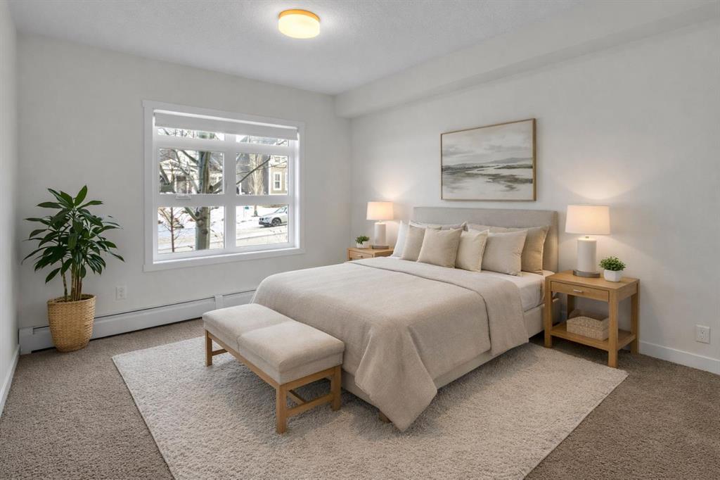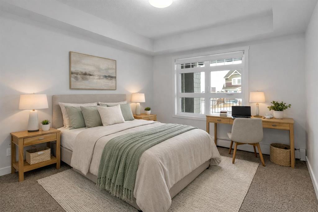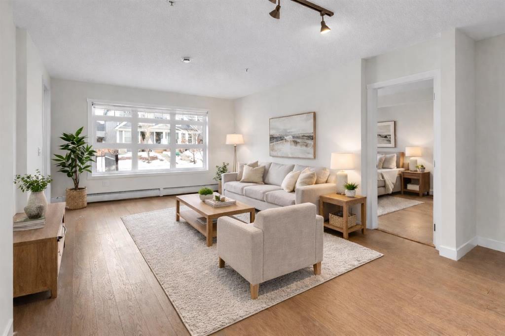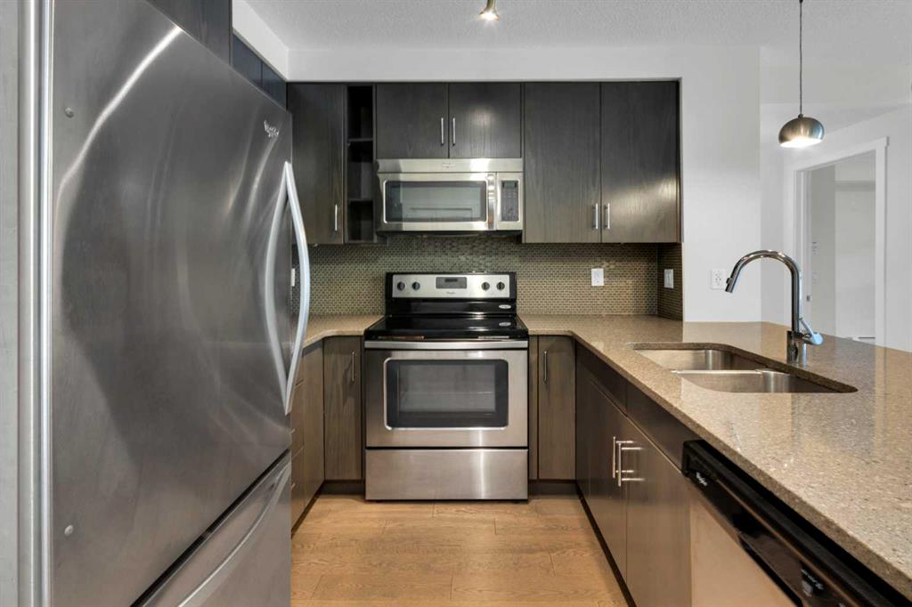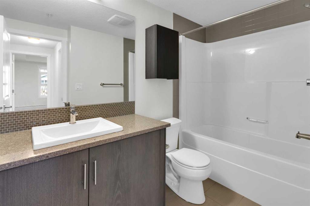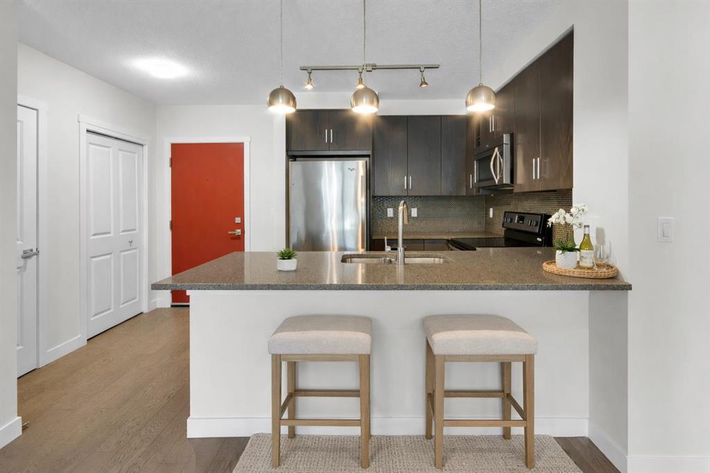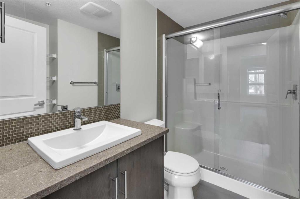 Welcome to this bright, freshly painted and well-maintained 2 bedroom, 2 bathroom condo in the sought-after Canoe complex in Auburn Bay. Offering 853 sq ft of functional living space, this ground-floor unit combines comfort, convenience, and low-maintenance living. The open-concept layout features a modern kitchen with dark cabinetry, stainless steel appliances, tile backsplash, and granite countertops, along with a spacious peninsula with seating — perfect for everyday living or entertaining. The living area is filled with natural light and flows seamlessly to your private outdoor space. Durable laminate flooring runs throughout the main living areas, creating a clean and cohesive look, while both bathrooms feature tile flooring for added durability and style. The primary bedroom includes a walk-through closet and private 4-piece ensuite. The second bedroom is thoughtfully positioned on the opposite side of the unit, ideal for guests, a roommate, or a home office. A second full bathroom and in-suite laundry complete the interior. This unit also includes one titled underground parking stall and assigned storage for added convenience. Located just steps from shopping, restaurants, transit, and with full access to Auburn Bay Lake amenities, this is an excellent opportunity for first-time buyers, investors, or those looking to downsize.