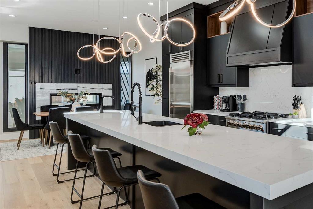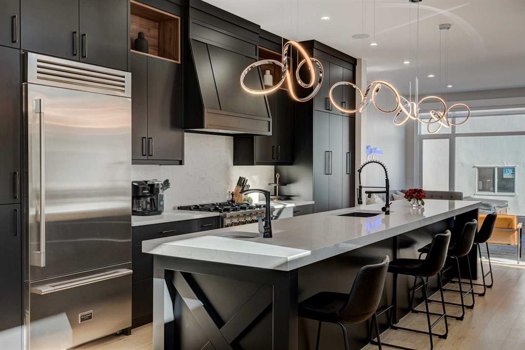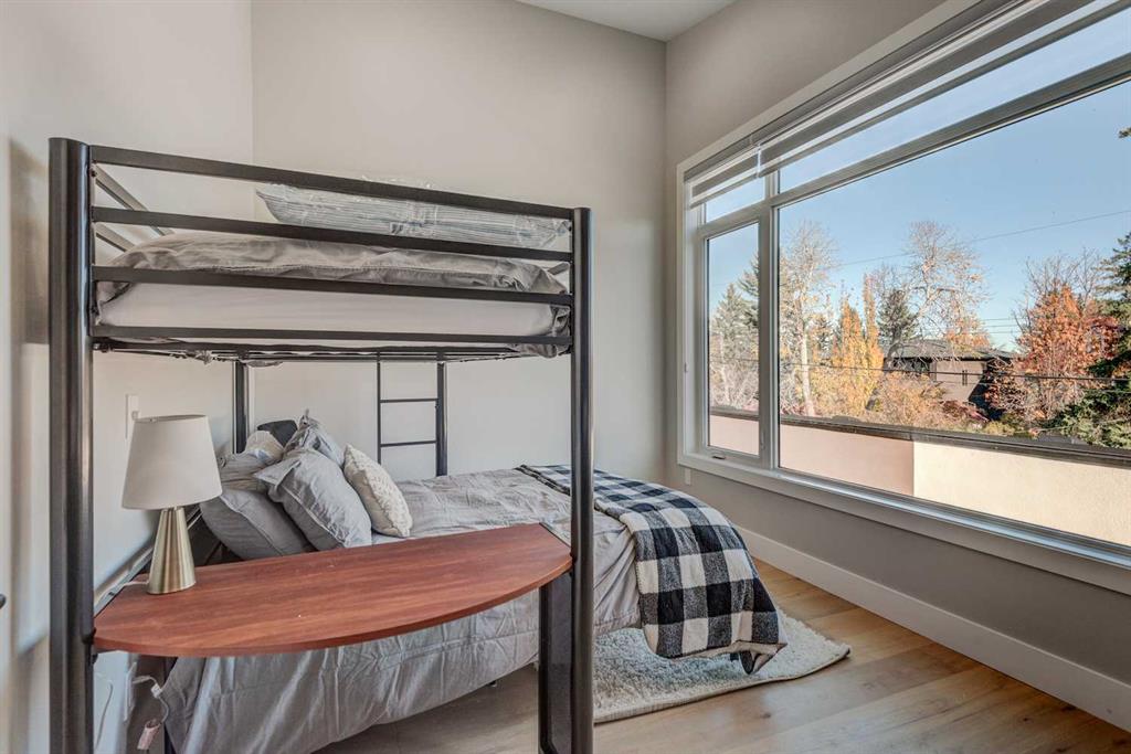An exceptional opportunity to own a fully finished detached infill offering 3,178 sqft of refined living space, currently operating as a successful Airbnb and offered fully furnished with all décor and contents included—a truly turnkey investment or effortless move-in opportunity. Designed with striking contemporary style and everyday functionality, this home impresses from the moment you arrive. The main level features an open, light-filled layout ideal for entertaining and daily living. A private main-floor office showcases a statement feature wall and elegant dual-sided fireplace, creating an inspiring work-from-home space. The heart of the home is the chef’s kitchen, complete with an oversized island and prep sink, premium stainless-steel appliances, gas stove, custom hood fan, and counter-depth refrigerator. Adjacent to the kitchen, the dining area is highlighted by a built-in wine display and offers ample space for hosting memorable gatherings. The inviting living room flows seamlessly to the outdoor retreat. Upstairs, enjoy a versatile bonus lounge, three well-appointed bedrooms, and a dedicated laundry room. The primary suite is a true sanctuary, featuring a generous walk-in closet and a spa-inspired five-piece ensuite with heated tile floors, glass-enclosed shower with body jets and dual shower heads (steam-ready), soaker tub, and a refined barn-door entry. Secondary bedrooms include custom wardrobes and share a beautifully finished four-piece bathroom. The bonus room, complete with a wet bar and beverage fridge, can easily convert into an additional bedroom or flexible living space. The fully developed basement rivals the upper levels with a spacious entertainment area featuring a custom wet bar and built-in media unit, perfect for hosting. A dedicated home gym with mirrored walls and luxury vinyl flooring, a large guest bedroom, and a full bathroom complete this level. Step outside to a private backyard oasis designed for year-round enjoyment, highlighted by a luxurious hot tub, ideal for both personal use and short-term rental appeal. Built with meticulous attention to detail, this home includes air conditioning, in-floor heating, and a central vacuum system. Located in the desirable inner-city community of Shaganappi, close to parks, schools, amenities, and the Shaganappi Point CTrain, and within the catchment for Western Canada High School, this property offers a rare blend of luxury living, income potential, and turnkey convenience. Book your private showing today.