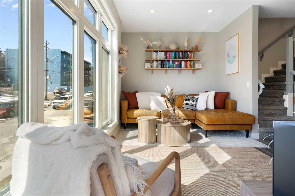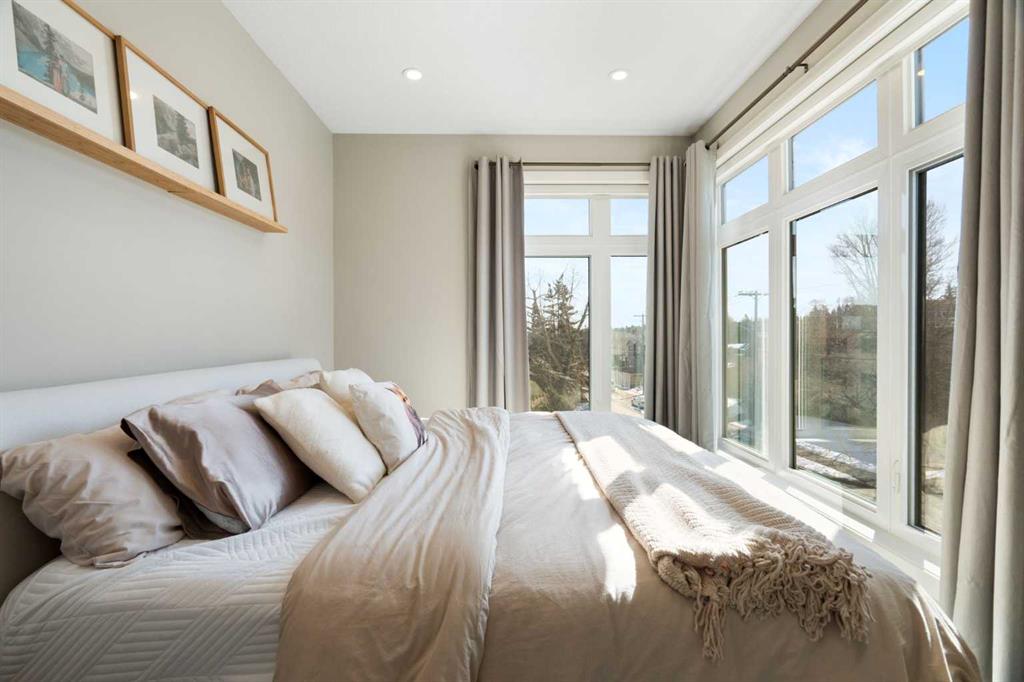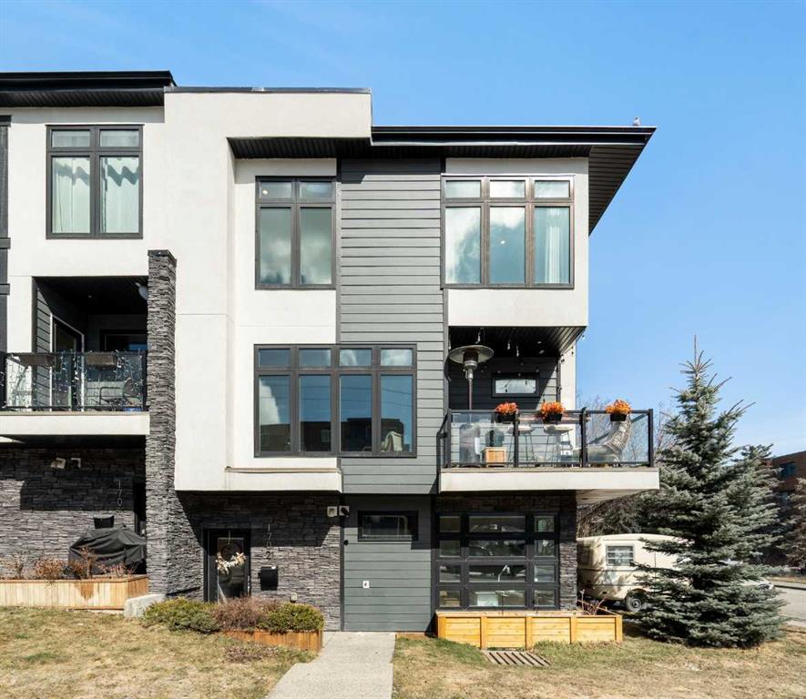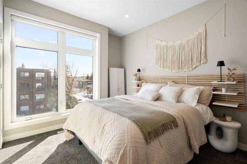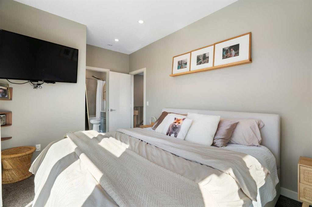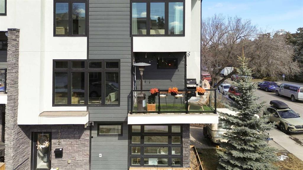 Bright, modern, and beautifully refined. On a corner lot with exceptionally low condo fees. This is inner-city living at its best in the heart of Calgary. Wake up to beautiful eastern sunrises and enjoy natural light all day long thanks to expansive south-facing, floor-to-ceiling windows that flood the home with warmth and energy. Step outside and you’re moments from the vibrant energy of 17th Avenue SW, your morning coffee at Our Daily Brett, and close to all the shops, dining, and lifestyle amenities of Marda Loop. For outdoor enthusiasts, the Bow River pathway system is just 1.5 km away... perfect for runners, cyclists, and evening strolls. This home offers the rare convenience of your own private driveway and an oversized single attached garage (ideal for secure parking, additional storage, or even a home gym setup). Inside, you’re welcomed by a bright and versatile main-floor flex space. Whether you need a home office, creative studio, guest room, or workout area, this space adapts to your lifestyle. Upstairs, the second level is the true heart of the home. Designed with open-concept living in mind, it features a beautifully appointed kitchen with custom cabinetry, a stainless steel appliance package, and an oversized island that’s perfect for entertaining. A dedicated dining area provides space for hosting, while the adjacent living room offers a cozy retreat complete with an electric fireplace. Step outside onto the wrap-around corner balcony... your private outdoor oasis for morning coffee or evening unwinding. A convenient powder room and in-suite laundry complete this level. The top floor is designed for comfort and privacy, featuring two primary bedrooms... each with its own ensuite. One boasts a spacious walk-in closet, while the other offers dual closets with a built-in organizational system, making it ideal for shared living or hosting guests. Stay cool through Calgary’s warm summer months with top-of-the-line air conditioning. Perfectly suited for urban professionals or anyone seeking a low-maintenance lifestyle close to the city’s best amenities, this home combines style, function, and location in one exceptional package. Located in a self-managed fourplex with incredibly low condo fees, this is a rare opportunity to enjoy high-end townhome living without the typical costs.