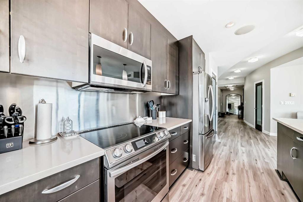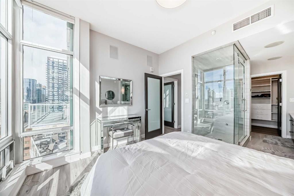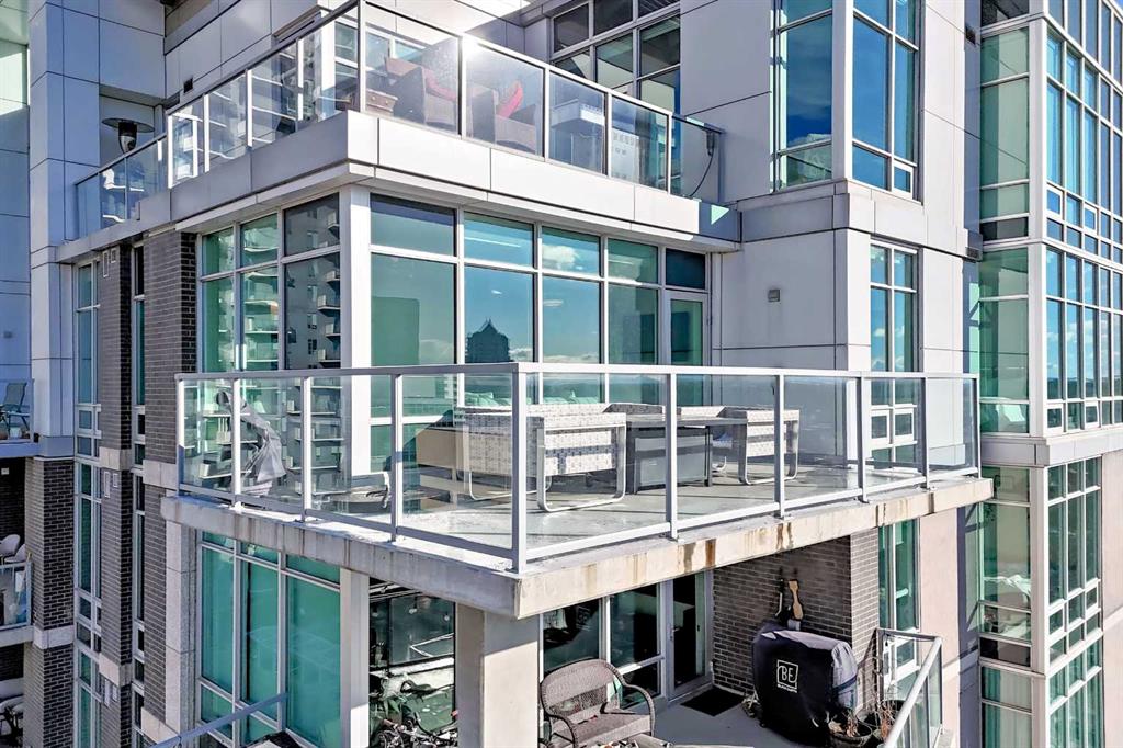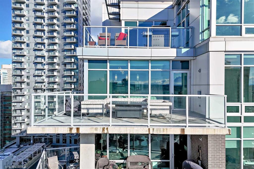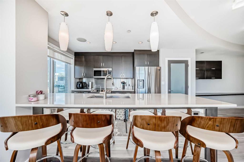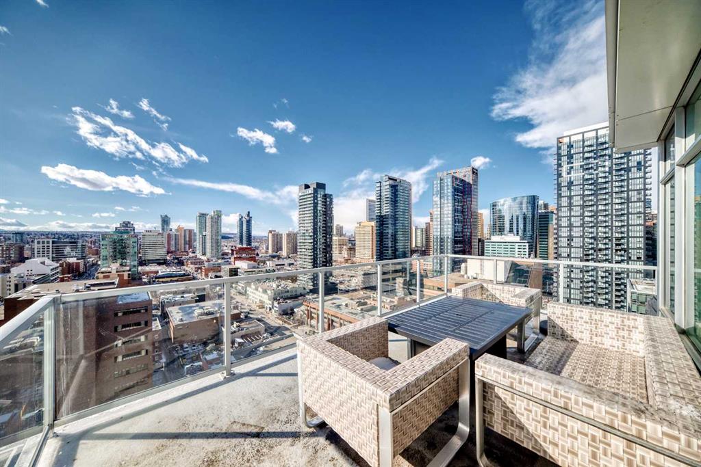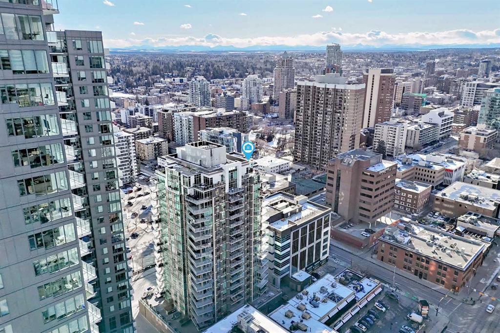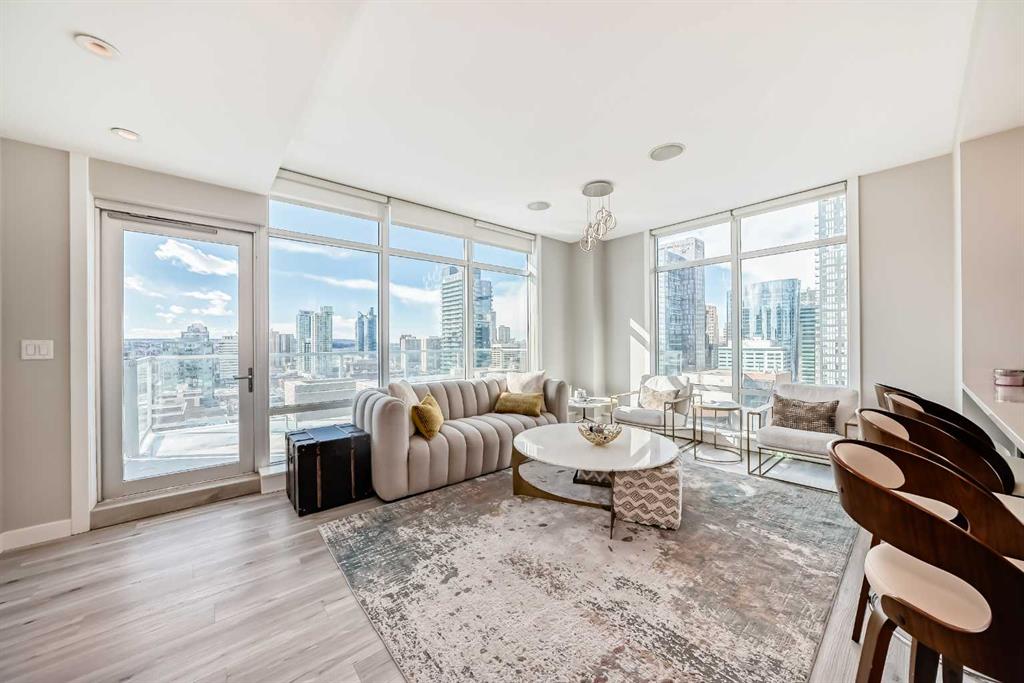 Sub Penthouse!! Experience elevated urban living in this stunning executive condo, featuring unobstructed panoramic city and mountain views. Flooded with natural light by day and illuminated by the glow of city lights at night, this spacious and immaculate suite offers an open floor plan with 9-ft ceilings, floor-to-ceiling windows, modern floors, and solid concrete construction. The generous kitchen is designed for both everyday living and entertaining, complete with extensive cabinetry, stainless steel appliances, quartz countertops, and a built-in wine cooler. The bright living area is surrounded by glass and seamlessly extends to an impressive 190 sq. ft. balcony with sweeping city views, creating the perfect setting for entertaining or relaxing while enjoying spectacular sunsets and the vibrant downtown skyline. The primary retreat features a spa-inspired ensuite with quartz counters, double vanity, large glass-enclosed steam shower, and walk-in closet. A spacious second bedroom, full bath, and convenient laundry complete the interior. Additional highlights include central air conditioning, titled storage locker, and 2 titled parking stalls. Ideally located in the heart of Calgary’s vibrant urban core, this exceptional residence offers the perfect blend of luxury, comfort, and lifestyle.