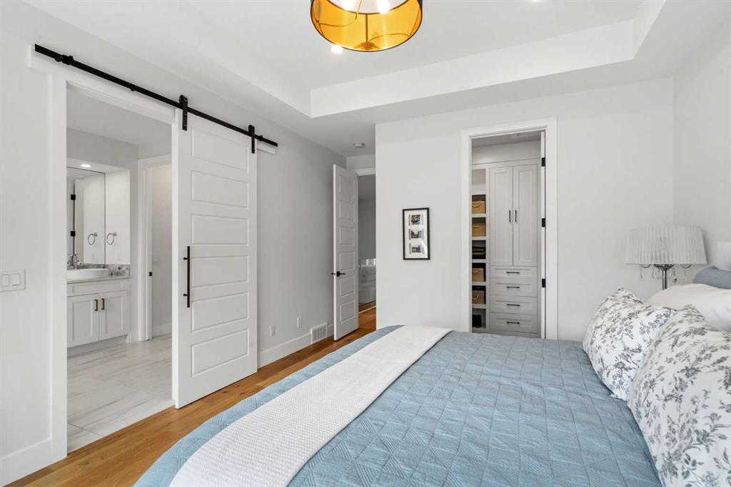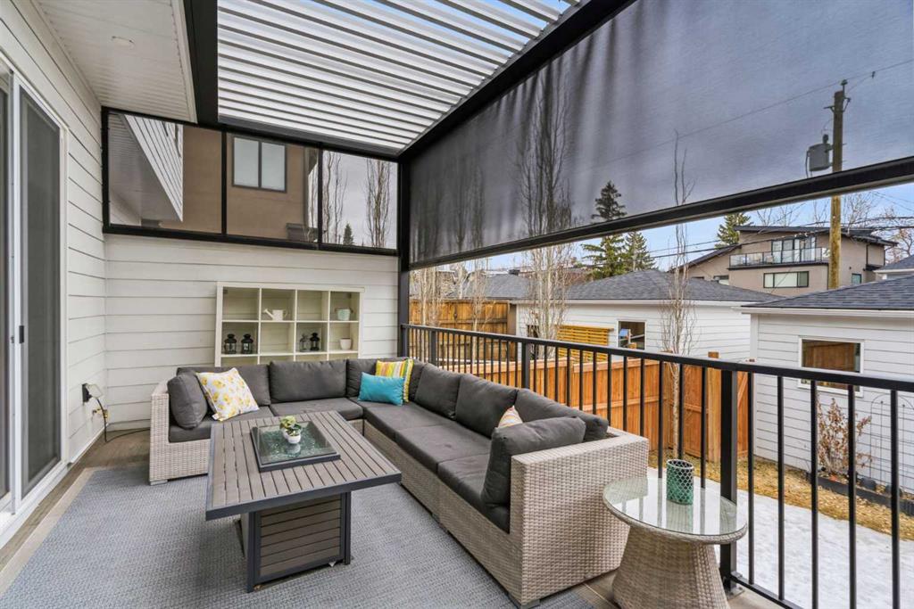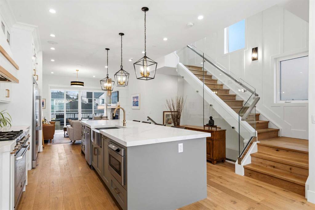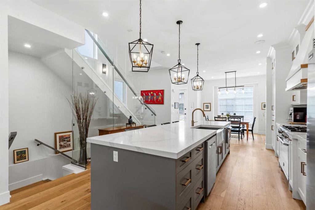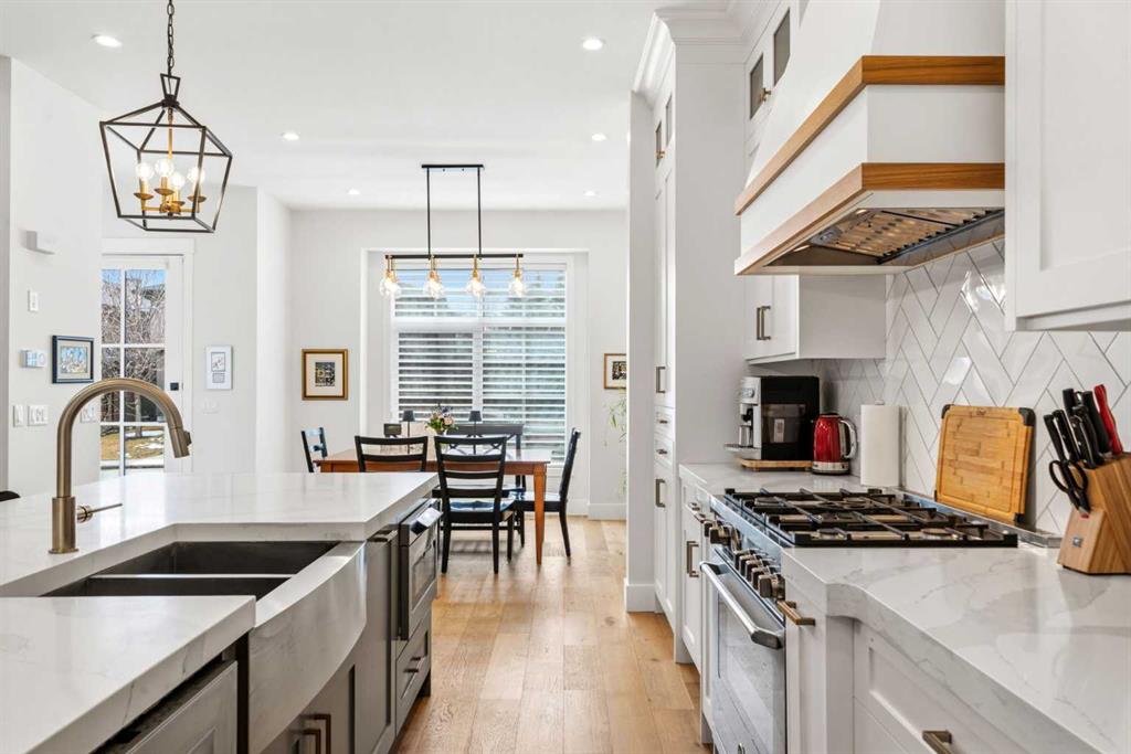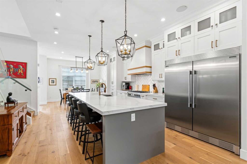 This exceptional, modern farmhouse style home, where architectural refinement & timeless design converge on a quiet, tree-lined street in the heart of Altadore. With 2,836 sq ft of curated living space, this stunning four-bedroom, 3.5 bath residence seamlessly blends upscale finishes with thoughtful functionality. Soaring 10 foot flat ceilings, engineered white oak wood flooring throughout, & striking 8 foot doors enhance the sense of openness & grandeur. Expansive windows flood the open concept main floor with natural light, illuminating a front dining area adorned with a detailed feature wall that flows effortlessly into the chef-inspired kitchen. The kitchen is designed for both everyday living & elegant entertaining & features custom, full height white cabinetry, subway tile backsplash, quartz countertops, a massive two-toned island with an eating bar & premium appliances, including a Bertazzoni gas range, dual full-sized fridge & freezer & drawer style microwave. The inviting living room offers a warm refined atmosphere, with a modern gas fireplace & custom built-ins. Large patio doors open to an expansive rear deck with a Suncoast enclosure featuring a motorized louvre roof and retractable screens - offering all-season outdoor living with adjustable sun, shade, and airflow. The mudroom with custom built-ins & a stylish powder room complete the main level. A dramatic architectural staircase with extra wide wood treads & sleek glass walls leads to the upper floor. The primary suite showcases a tray ceiling and a spacious walk-in closet. A sliding barn door leads to the spa-inspired ensuite, which offers in-floor heating, dual vanities, a freestanding soaker tub, an oversized glass-enclosed shower & a private water closet, delivering a serene experience. Two additional bedrooms, one with a walk-in closet, share a beautiful bathroom, while a dedicated laundry room with cabinetry & sink ensures everyday convenience. The fully finished basement is designed for both relaxation & entertaining, featuring in floor heating, a generous family room, a designer wet bar complete with open shelving, upper & lower cabinetry, & beverage fridge area, plus a fourth bedroom with a large walk-in closet & full bathroom. Enjoy seamless outdoor living with a private front patio, perfect for summer evenings & entertaining. Features include central air conditioning, in-ceiling speakers, custom blinds with blackout in the upstairs bedrooms, plus a fully insulated, drywalled, heated double detached garage with a paved lane. Perfectly positioned in one of Calgary’s most sought-after communities, this residence offers an unmatched lifestyle with exceptional walkability. Enjoy being just moments from River Park, Sandy Beach Park, Monogram Coffee, the vibrant shops, restaurants & cafes of Marda Loop. Quick access to Crowchild, Glenmore & Stoney Trail. This is a meticulously crafted home that delivers sophistication, comfort, and distinction at every turn.