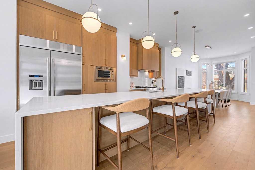 Absolutely STUNNING CURB APPEAL on this 2000 SQ. FT. two-storey (2800 total) in desirable ALTADORE! Classic FULL-BRICK facing & TURRETED roofline, BRICK WINDOW LEDGES, BLACK WINDOWS and MATCHING BLACK METAL ROOFING complete this gorgeous front elevation! Tell your guests to pull up to the nicest-looking house on the street & ring the doorbell! Come see 1935 43 Ave SW! Built in 2022, this home is beautiful and move-in ready! Mature trees grace this community and this front lawn, plus a paver patio, perfect for summer socializing with the neighbours. Step in the front door and you will instantly appreciate 10' CEILINGS, 8' interior doors and extensive ENGINEERED HARDWOOD flooring (running through the main level, upper level & both staircases)! Do you like to entertain? How about an ISLAND THAT IS ROUGHLY 16' LONG with stylish STONE COUNTERS, completed by 'WATERFALL' end panels! Plenty of room at the island, and in the SPACIOUS EATING AREA where you can comfortably seat the entire family! Fantastic kitchen, with perimeter CABINETS TO THE CEILING, ELEGANT CROWN MOULD DETAILING, UNDER-CABINET LIGHTING, plus STAINLESS-STEEL APPLIANCES including a fantastic SIX-BURNER GAS-STOVE for those delicious meals you like to serve. HUGE FRIDGE and BUILT IN MICROWAVE! The kitchen also features a CUSTOM VENTED HOOD over the stove, SOFT-CLOSE drawers, PULL-OUT SHELVES and an ADDED SERVING COUNTER with beverage fridge adjacent to the staircase. Enjoy a quiet evening in the living room with a cozy gas fireplace or step out the triple panel slider doors to your back deck for a summer BBQ (also accessible through the mudroom). When you park in the heated double garage - enter through the back mudroom (with BUILT-IN LOCKER units). For a game or an evening movie, head downstairs. The lower level has another bedroom and full bathroom, office space (with built-in shelving) and a bar area siding onto the rec room. IN-SLAB HEAT keeps your basement toasty all year round! The upper floor of this beautiful home has three spacious bedrooms, laundry and two bathrooms. The primary bedroom is three steps up, giving separation from the rest of the upper level. It also boasts a spa-like ensuite, with deep soaker tub and fully tiled steam shower (with inset wall niche for organization), plus walk-in closet with organizers. You will love the south-facing balcony off the primary bedroom for a quiet start to your day, or some sunshine in the afternoon. This home is beautifully finished with 'rose-gold' accents on the plumbing and light fixtures. Generous built-ins and added cabinetry storage spaces throughout the home. Large windows for plenty of natural lighting. The community of Altadore borders east & south to vast greenspaces, connecting you to river pathways, Glenmore Athletic Park, Glenmore Aquatic & Fitness Centre plus reservoir pathways where you can walk or cycle as much as you please! Perfectly located and beautifully finished. Book your showing today!
